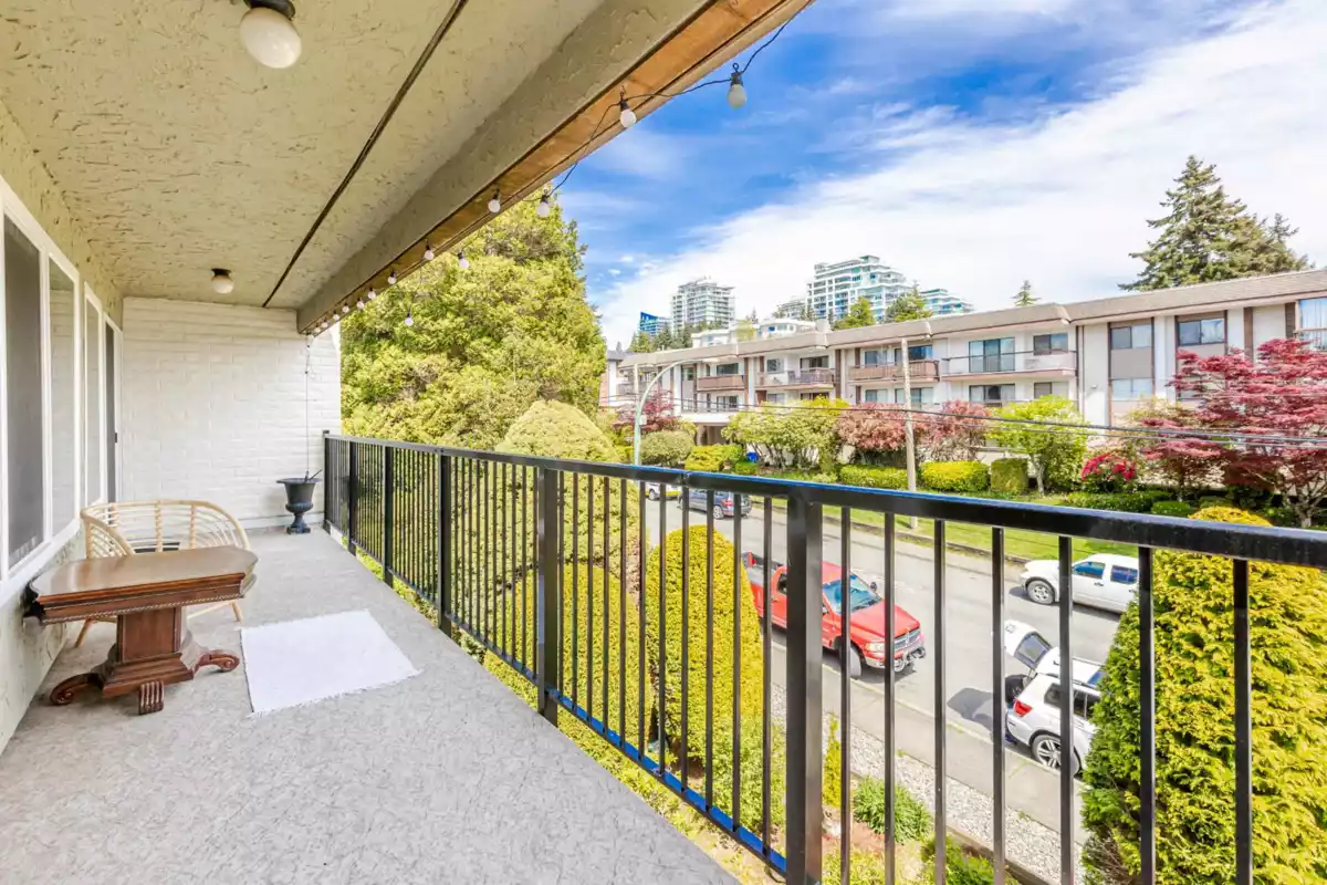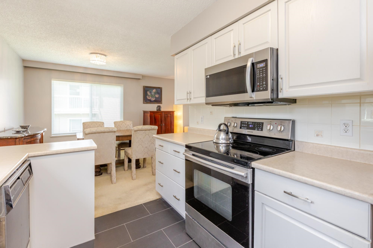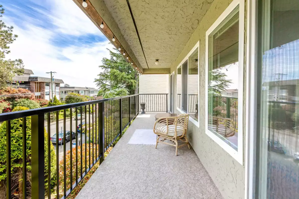 The DOGWOOD. Sought-after 55+ community in the heart of White Rock. Bright, sunny, top-floor end unit boasts a 28 foot long balcony perfect for sipping coffee and watching the sun rise. This large 1117 sq ft 2 bed/1.5-bathroom suite offers ample natural light and plenty of space to relax. It accommodates house size furniture making it great for downsizing. With in suite laundry, one parking stall and one storage locker included, you'll have everything you need. Bring your decorating ideas and enjoy the best of White Rock living with its beautiful beaches, shops, and restaurants just a short walk away. Plus, with easy access to downtown Vancouver, you can enjoy the best of both worlds. Strata fees cover heat and hot water. Pets allowed (2 cats or 1 small dog and 1 cat) Motivated Seller!