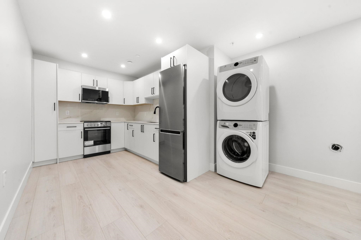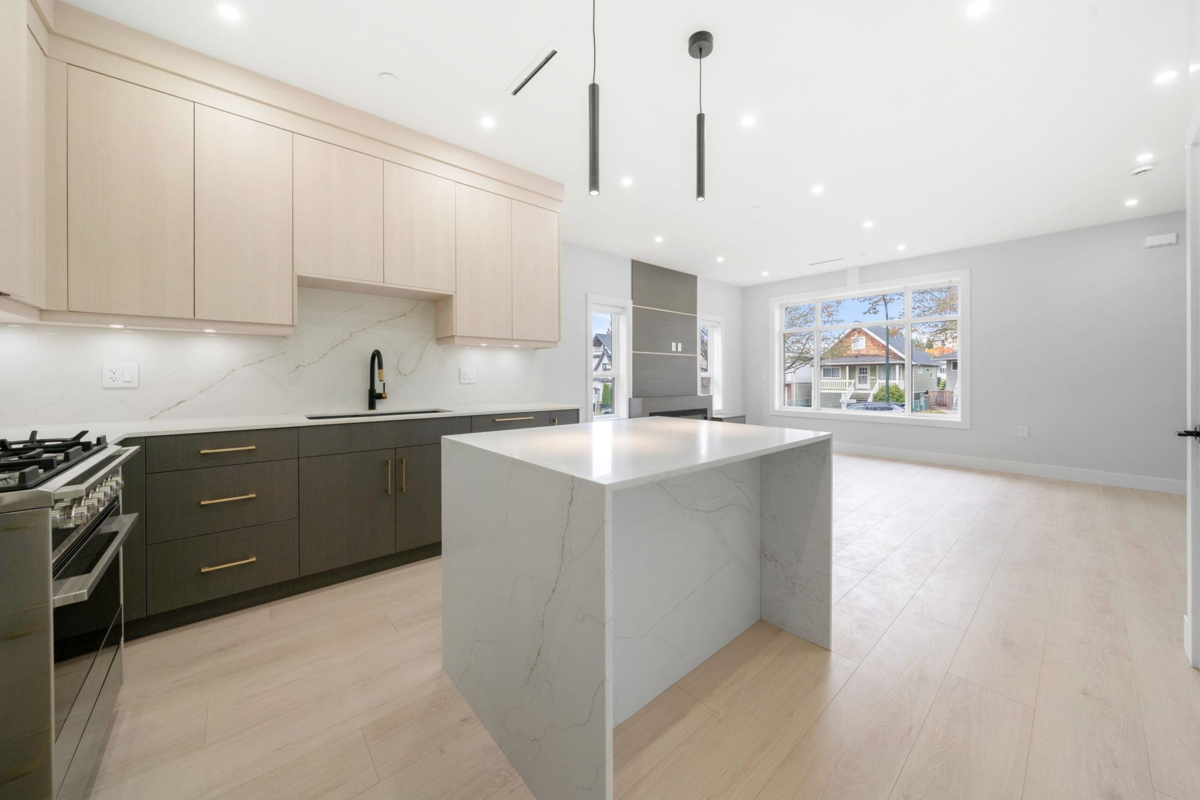 This stunning front half-duplex offers elegant design and quality construction in highly desirable Killarney, Vancouver. Featuring approx. 1,600 sq. ft. of well-planned living space, it includes a bright open-concept main floor with high ceilings, engineered hardwood, A/C and an electric fireplace. The gourmet kitchen boasts quartz countertops, premium appliances, and custom cabinetry. Upstairs features spacious bedrooms, a luxurious primary with walk-in closet, spa-like ensuite and sundeck. The lower level includes a self-contained 1-bedroom suite ideal as a mortgage helper. Additional highlights: HRV, security system, designer lighting and garage. Conveniently located close to parks, schools, shopping and transit, this home offers the best of modern urban living.