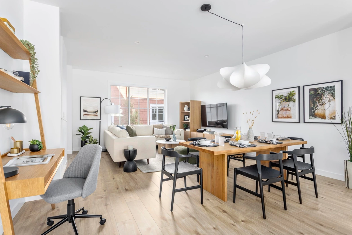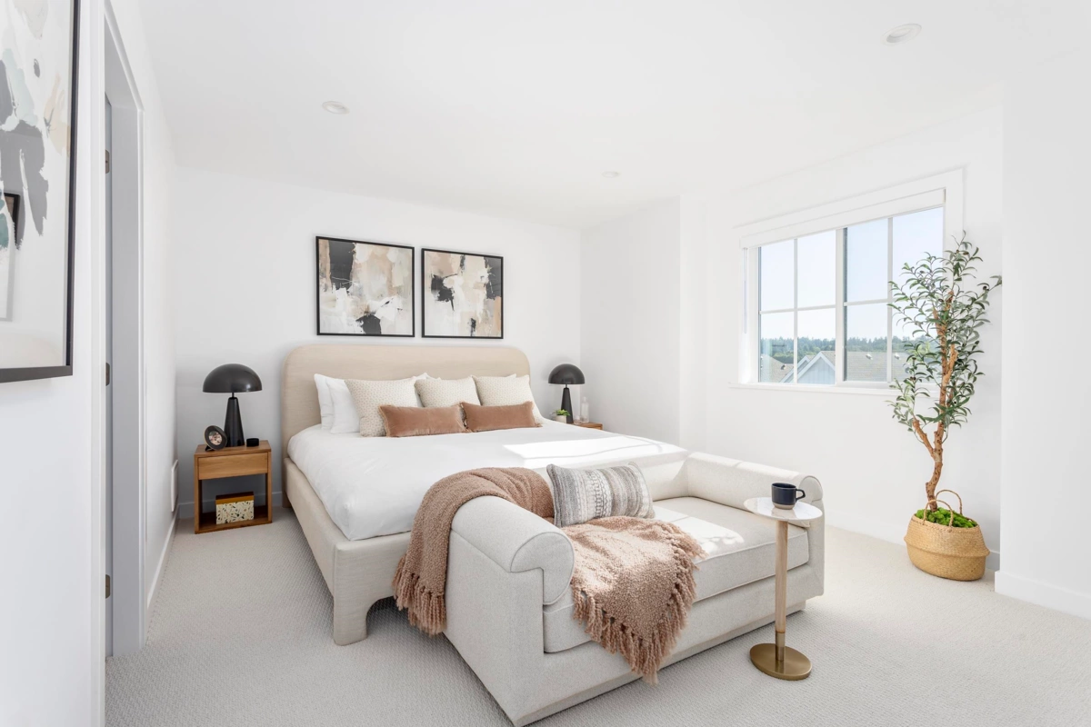Centennial Green - This 3 bedroom+ den contemporary craftsman style townhome with a colourful front door is a short walk to the beach. At home, you have a large kitchen island ideal for snacking & homework while you prep food for the day. Stainless steel KitchenAid Appliances & a farmhouse-style sink will help you make beautiful meals. Two spacious bedrooms on the upper floor & your own primary suite on its own floor is a sanctuary with a large picture window, spacious walk-in closet & black-out blinds. The ensuite' s heated tile flooring, double vanity & large walk-in shower will set you up for especially good mornings. With your private outdoor space, generous size living spaces & detached garage, this is the home you've been looking for!