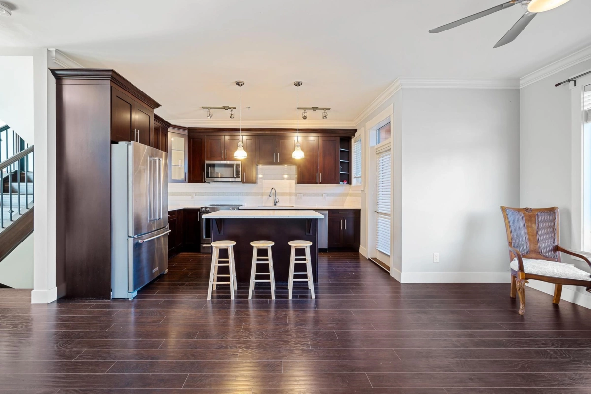 A jewel & excellent location. Beautiful architectural design in contemporary West Coast Style. South facing; corner & end unit; 4 bedrooms & 4 bathrooms with modern open concept. Exquisite Maple cabinets, white quartz countertops; sleek stainless appliances; hardwood laminate floors throughout the first two levels. Three upper deck one of which two bedrooms share. Main floor master bedroom with 4-piece en-suite and large walk-in closet, below a large bedroom and a fall bath. Built-in vacuum, double garage, cushy parking accessibility, fenced yard, close to shopping and just steps to transit.
