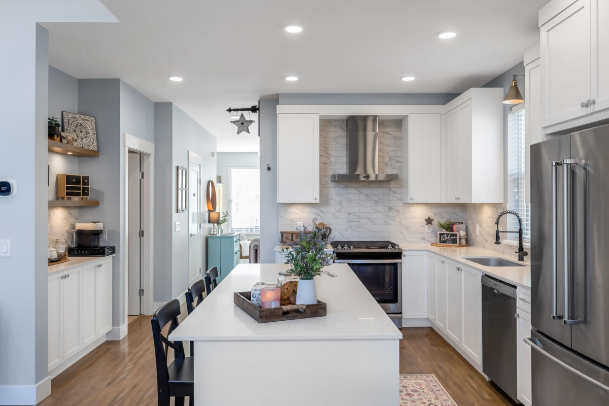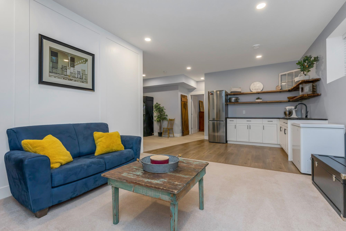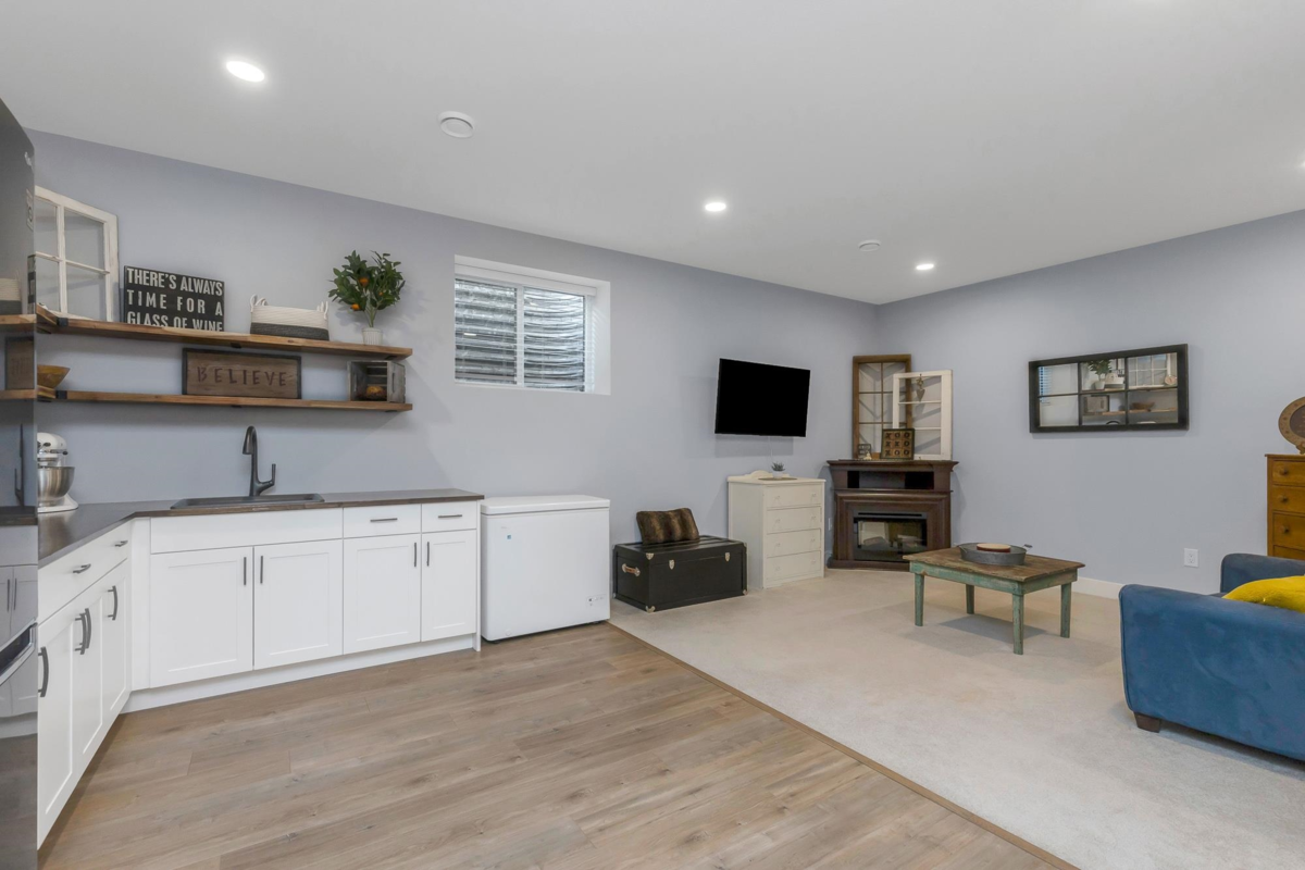 Luxury Style RANCHER with master on the main. Attached to only 1 unit this home is extra bright and has all the upgrades including A/C. Entertainers style open floor plan, gorgeous kitchen including gas stove and coffee bar! There's direct access off the dining room to a covered patio and totally private backyard sporting artificial turf for evergreen, low maintenance living! The primary suite has a lovely feature wall, vaulted ceilings and a walk-in closet with custom built-in cabinetry. The spa inspired ensuite has heated floors, double sinks and a stand up shower. The 9' ceilings in the full basement also has a stylish kitchenette, 2 full bdrms, an office, rec room and 4pc bathroom. This unit does not back any neighbours, has a clubhouse, and is close to town yet very private and quiet