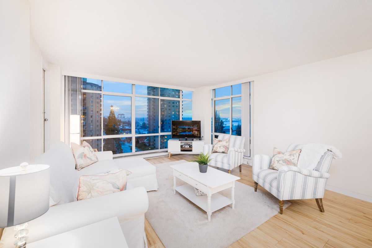 A fabulous & spacious 2-bedroom, 2-bathroom suite in one of Lower Lonsdale’s most sought-after buildings. The Olympic Building is known for its solid concrete construction, great floor plans, views, exceptional maintenance & super location. Right in the heart of thriving Lower Lonsdale, everything is at your fingertips! This 10th floor corner unit has great exposure to the South-East, is flooded with natural light through the floor to ceiling windows and has beautiful water views. The suite has been upgraded with new flooring and is ready to move in. It is also one of the only units with an enclosed solarium for year-round use. Additional features include 2 ground-level parking stalls, a storage locker, gym, bike room, amazing communal gardens, metal roof and a garbage shoot!
