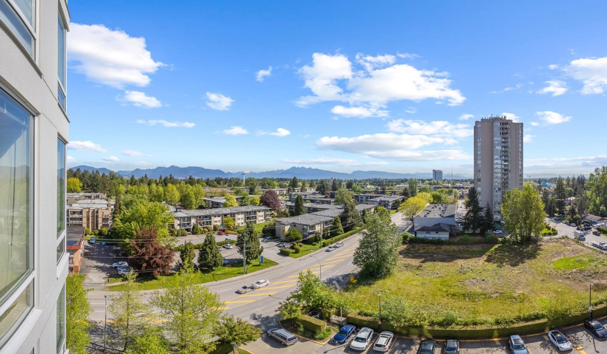 Breathtaking panoramic views from each room! Discover this beautifully bright and expansive Northeast-facing corner unit. Located in the heart of most desired Guildford area. This home features 2 beds plus den, 2 baths, and over 1,000 SF with stunning views of both of the mountains and city. Floor-to-ceiling windows throughout flood the space with natural light, enhancing the ambience. Upgraded kitchen and bathrooms. Amenities including a fully equipped fitness center, steam room, sauna, party room with kitchen, and garden area. Steps away from Guildford shopping mall, Guildford rec center, library, cinemas, restaurants, T&T/Superstore, Transit friendly; few minutes to Surrey City Center, Sky train, and easy access to Hwy. 3rd bedroom has no closet.