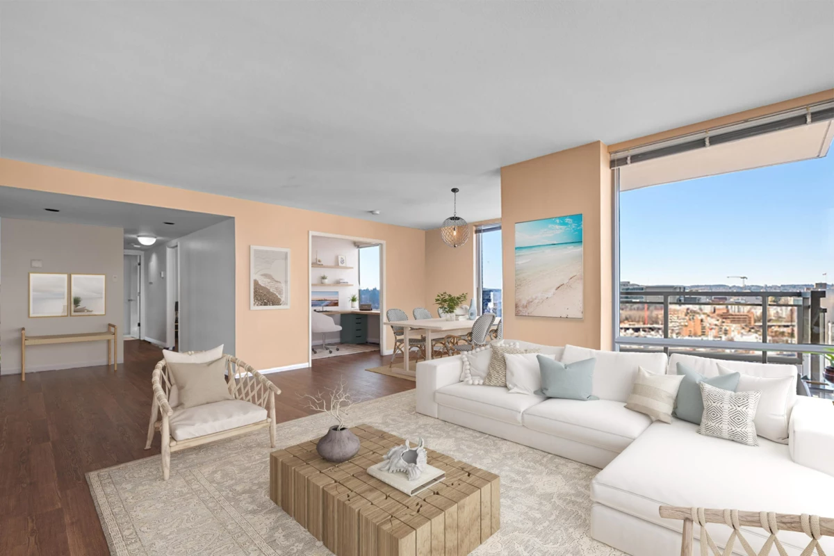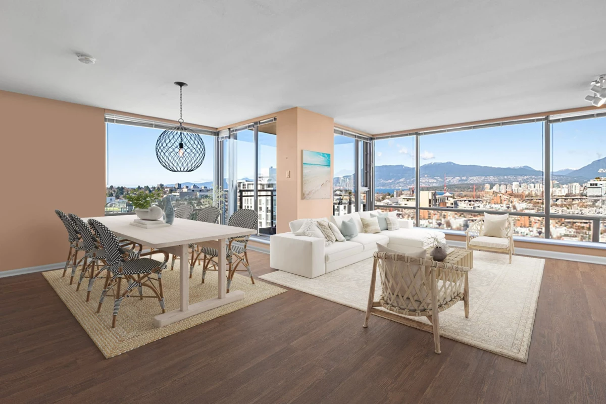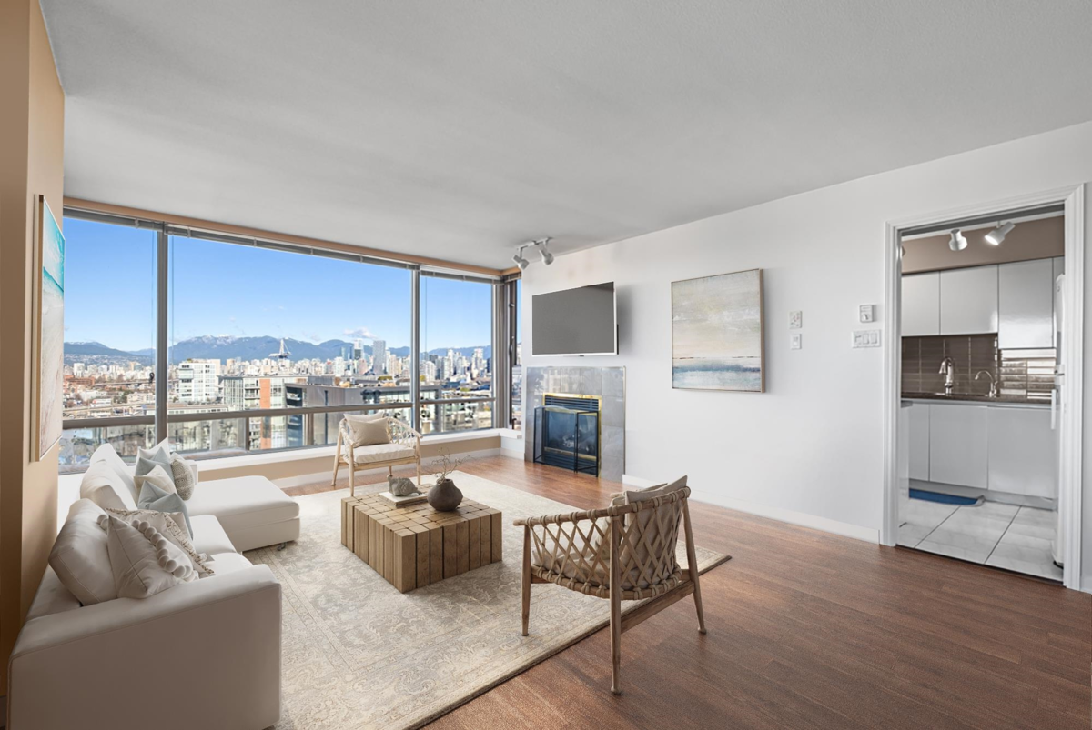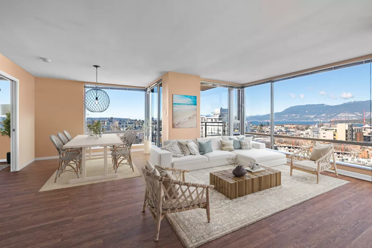 Manhattan West located on west 8th Avenue in Fairview Slopes. The home offers 1367sqft of living space with 2 bedrooms, 2 bathrooms and a large den (possible 3rd bedroom). This bright Northwest corner unit boasts incredible ocean, mountain and city views spanning from the Burrard inlet to False Creek. Enjoy watching the annual fireworks from the comfort of your living room. Side by side parking stalls and one storage locker included. Strata fee's include gas, hot water and access to the complex amenities - pool, whirlpool, sauna, gym, bike storage and visitor parking. 100 Walkscore, steps to Granville shopping, transit lines, Granville Island, restaurants, parks, False Creek Seawall and moments to downtown. Showings by appointment. *Photos have digitally staged furniture.