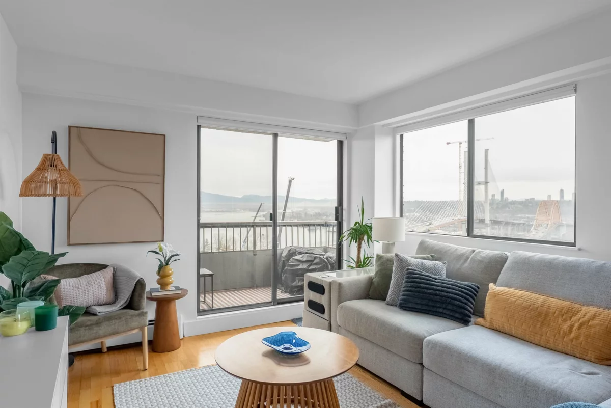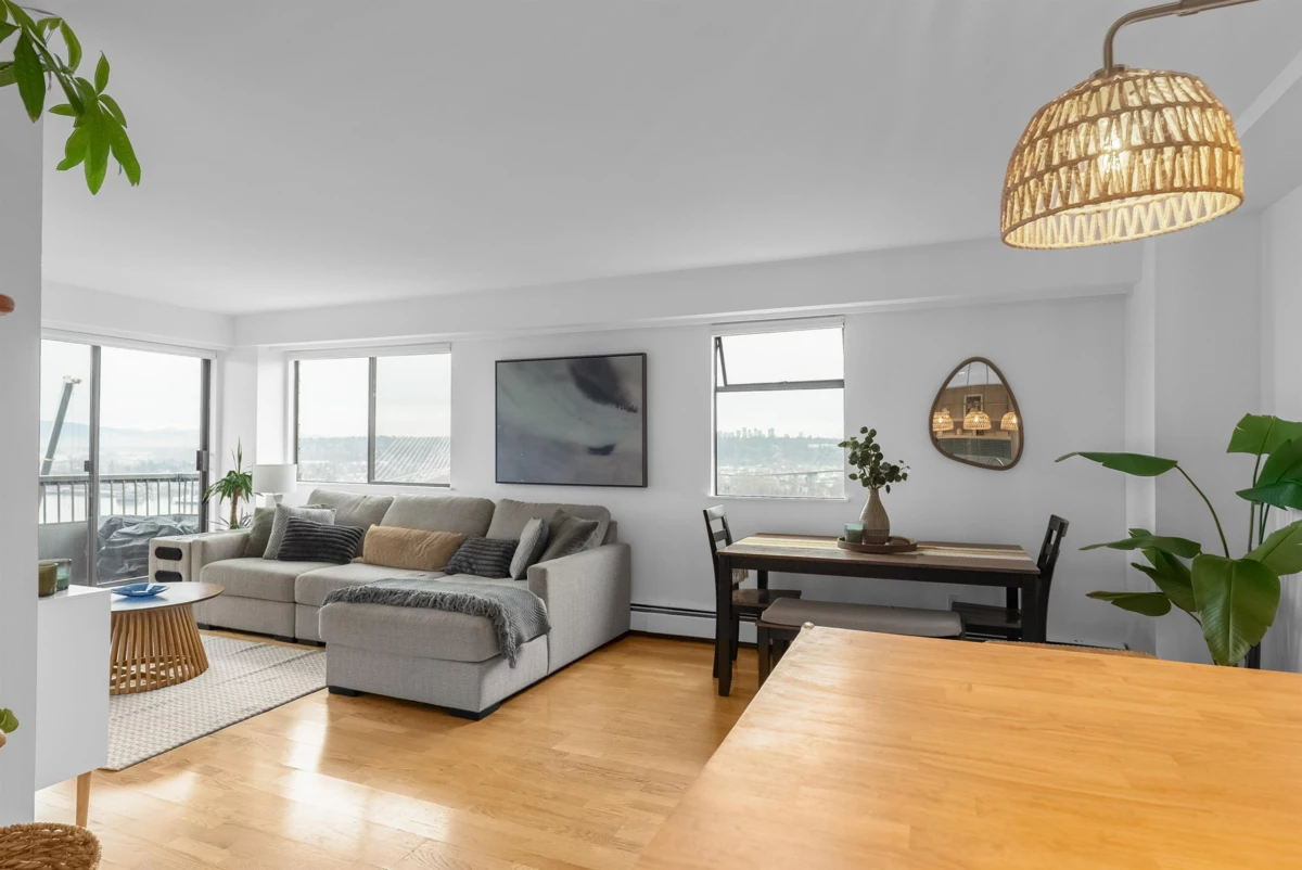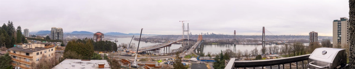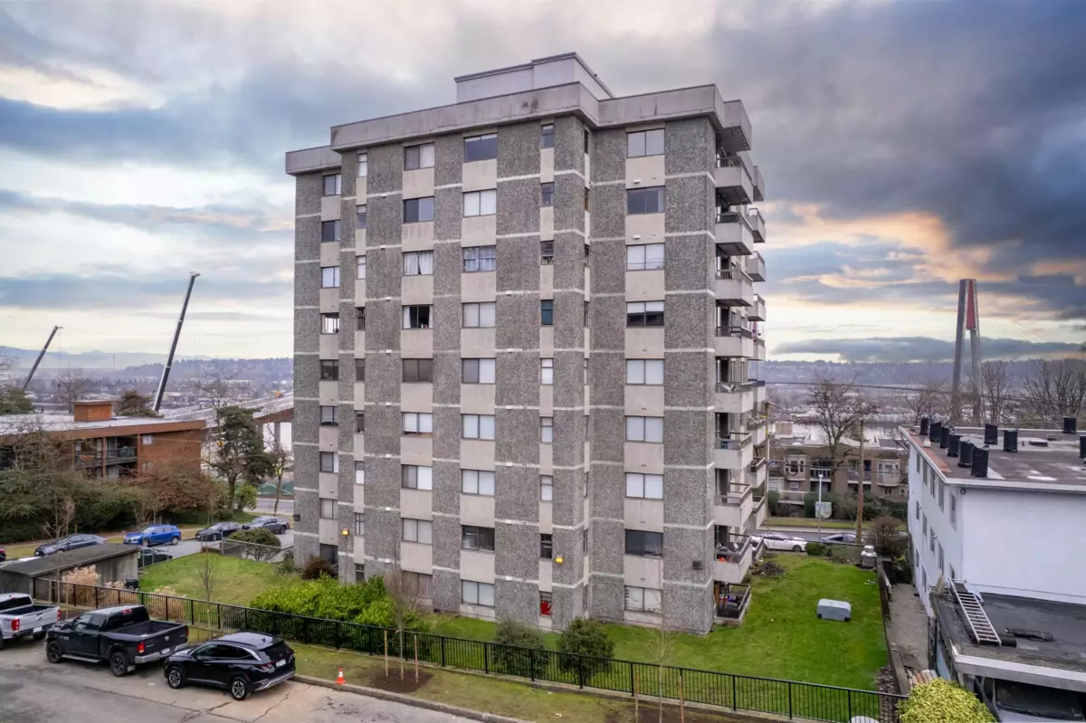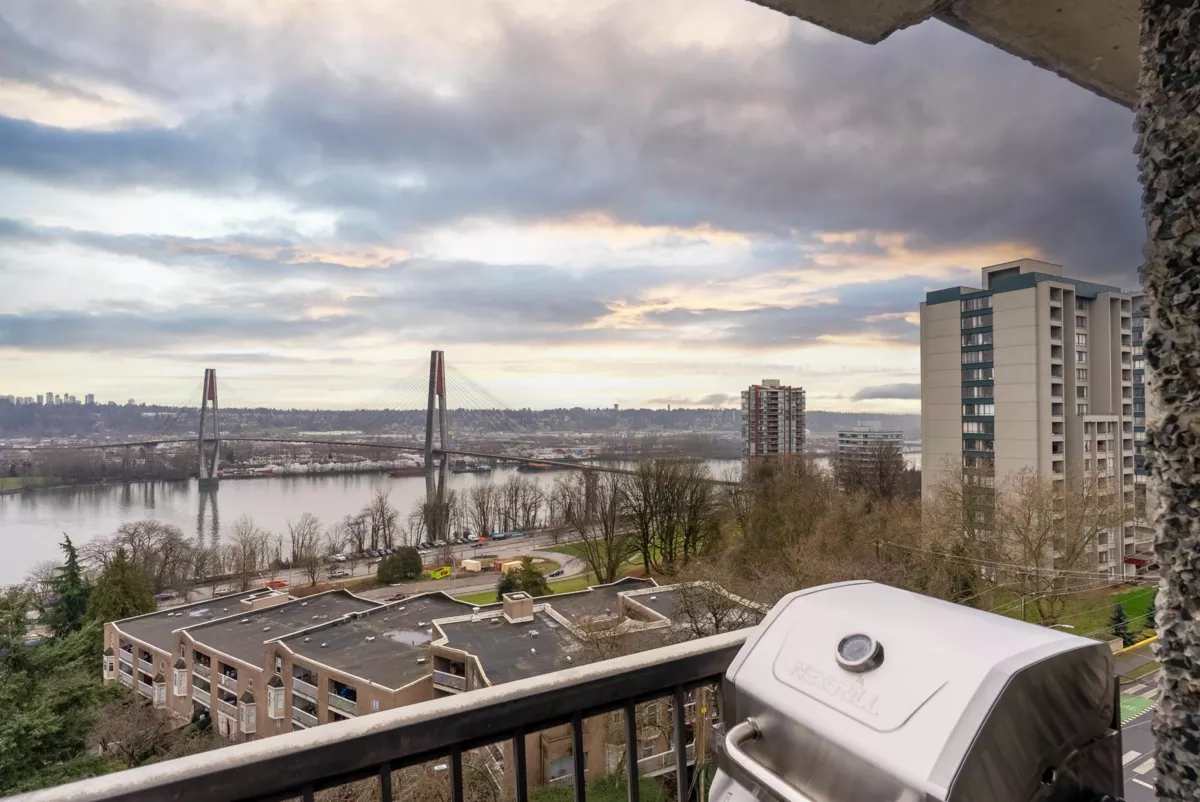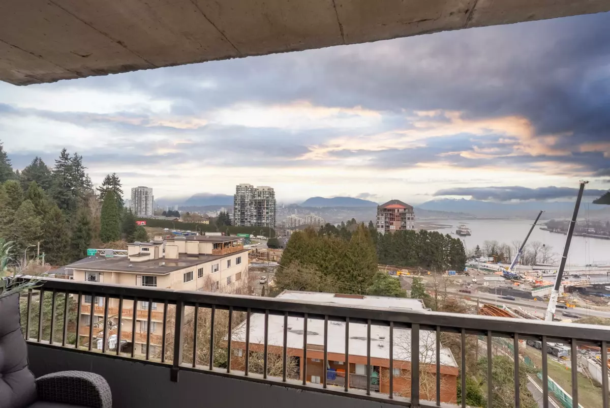Stunning 1,200+ sq ft penthouse with breathtaking, unobstructed Fraser River and mountain views. This 3 bedroom, 2 bathroom + den home features real hardwood floors, a beautifully updated custom kitchen with high-end appliances and an oversized island, and an open-concept living/dining area leading to a covered patio—perfect for enjoying sunsets and scenery. Extensively renovated with quality upgrades throughout. Walk to downtown New Westminster, SkyTrain, shopping, Queens Park, and schools. 2 parking + 1 storage included. Open House on Friday night Feb 6th 6-7pm, Saturday Feb 7th 12-2pm.