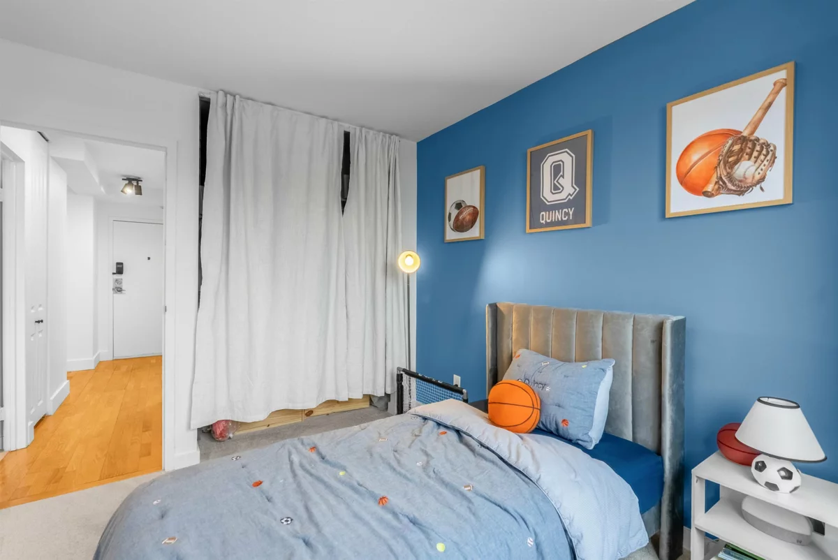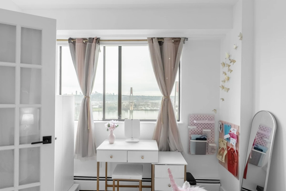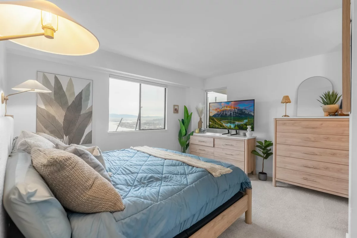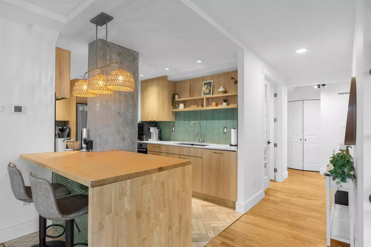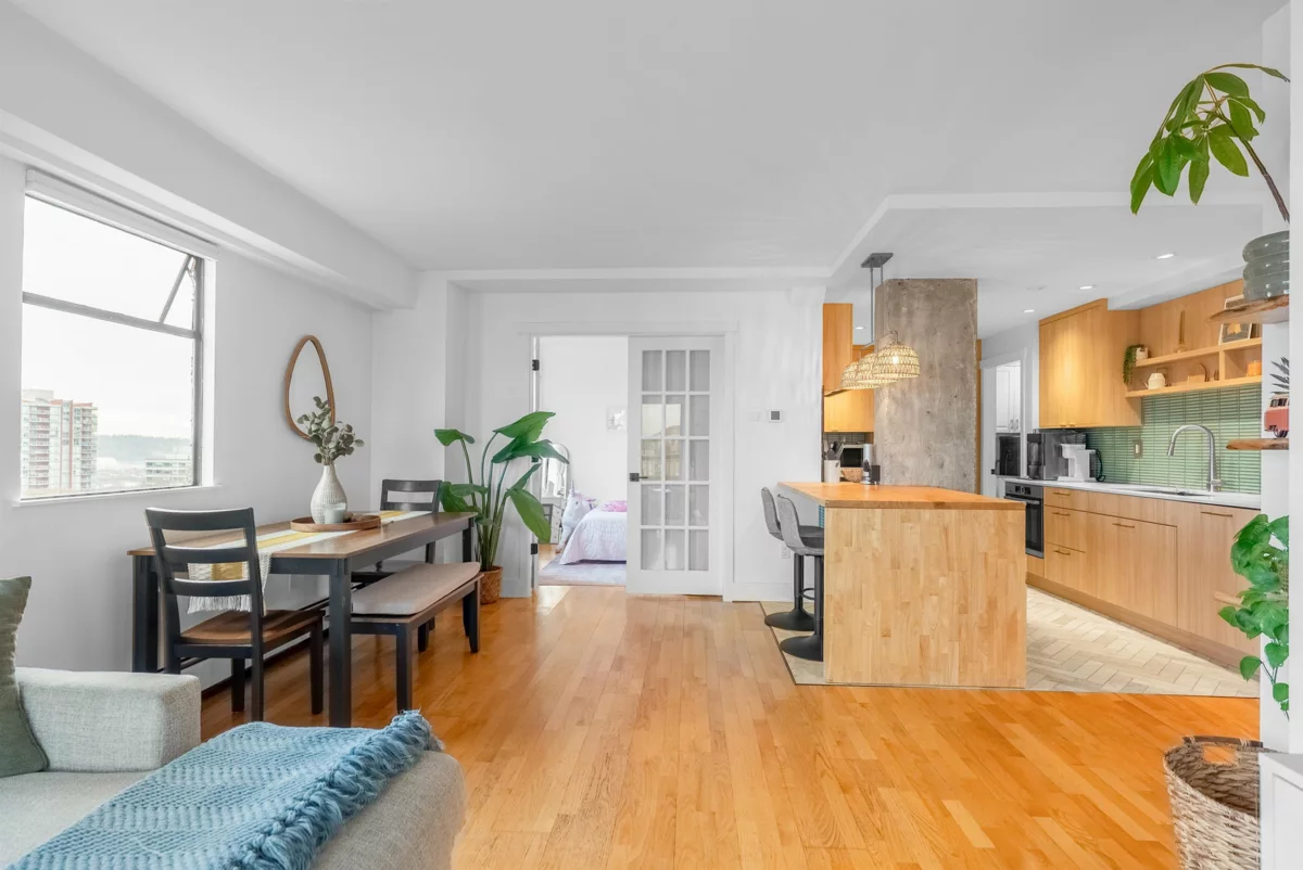 Stunning 1,200+ sq ft penthouse with breathtaking, unobstructed Fraser River and mountain views. This 3 bedroom, 2 bathroom + den home features real hardwood floors, a beautifully updated custom kitchen with high-end appliances and an oversized island, and an open-concept living/dining area leading to a covered patio—perfect for enjoying sunsets and scenery. Extensively renovated with quality upgrades throughout. Walk to downtown New Westminster, SkyTrain, shopping, Queens Park, and schools. 2 parking + 1 storage included. Open House on Friday night Feb 6th 6-7pm, Saturday Feb 7th 12-2pm.