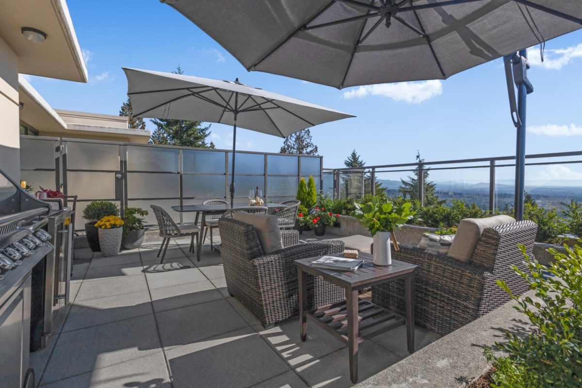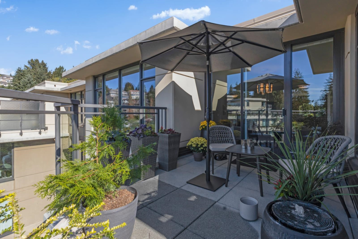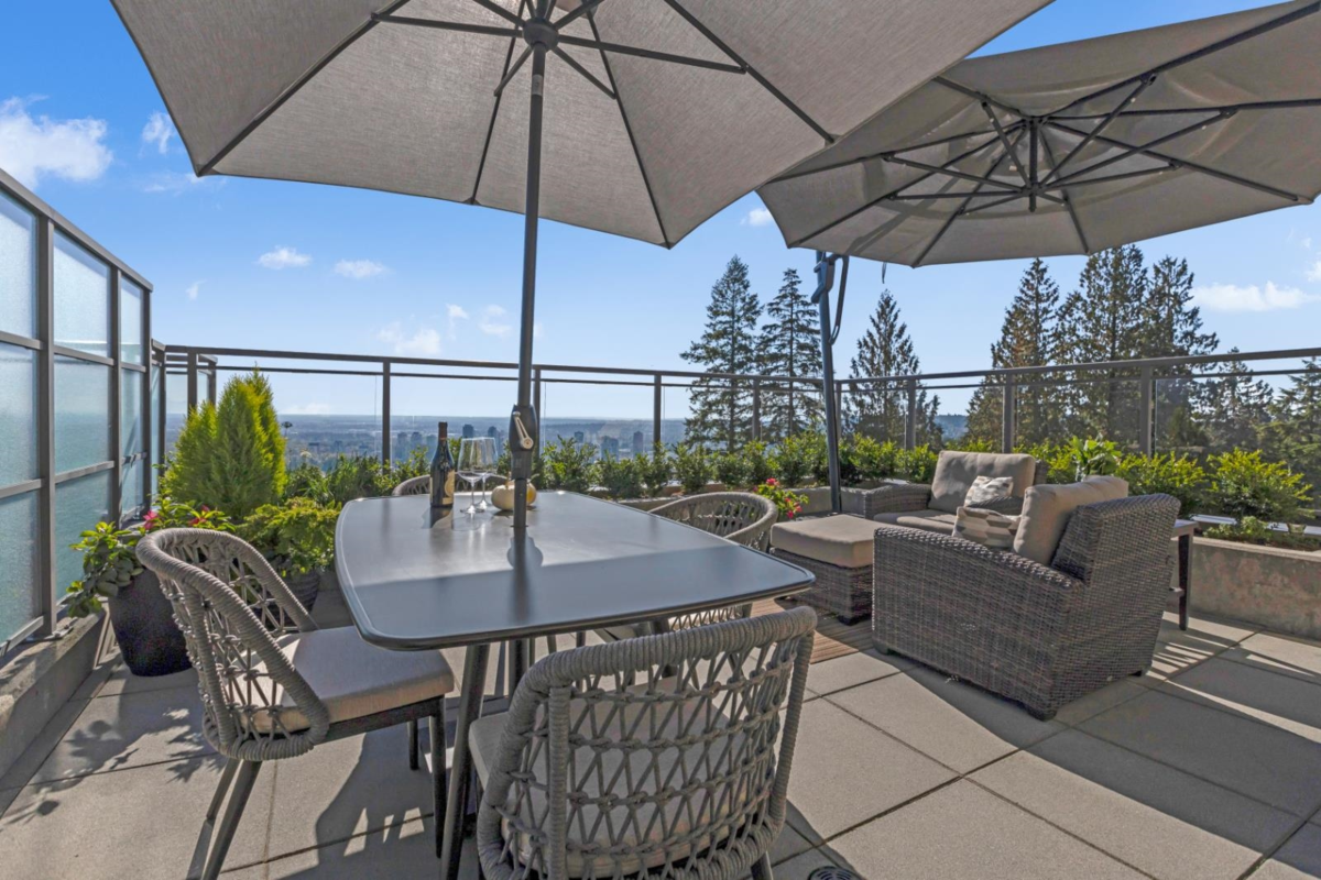 Experience the epitome of luxury living in the elegantly renovated penthouse at The Cascade. This 2 bedroom unit + complete with a large office/flex room and a stylish lounge bar area, offers one of the most coveted floor plans in the entire building. Your culinary aspirations come to life in the expansive gourmet kitchen, thoughtfully designed with ample space and a convenient pantry/laundry area. Step outside to a stunning 838-square-foot wrap-around balcony-an entertainer's dream. Enjoy panoramic, unmatched views of Mt. Baker and the city, creating the perfect backdrop for BBQs, sunbathing, or quiet moments of relaxation, all in solute privacy. This exceptional penthouse also comes with two garage parking spaces and ample storage. Impeccable penthouse!