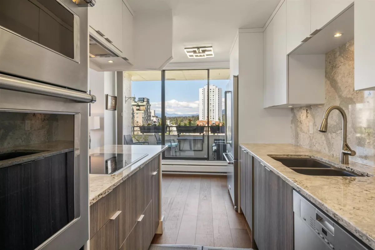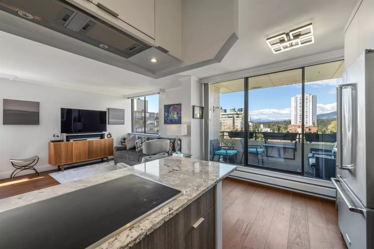 Rarely available expansive one bedroom and den CORNER VIEW SUITE on the preferred quiet side of coveted Huntington Place ideally situated west of Denman steps to Stanley Park & English Bay w. resort style pool and gardens! Fully renovated suite incl open-plan kitchen w quartz surfaces, Kitchen-Aid double wall oven, french-door fringe, integrated cooktop. Spa-inspired bath boasts stunning custom tiles, modern granite vanity w ample storage. Top-spec genuine hardwood flooring throughout, deep and very private balcony with views to Stanley Park and beyond. The living - dining and former den provides endless space to entertain and relax, then retreat to a generous bedroom with views to inspire. Large 2 parking + locker included, absolute dream location steps to parks, seawalls, beaches & more!
