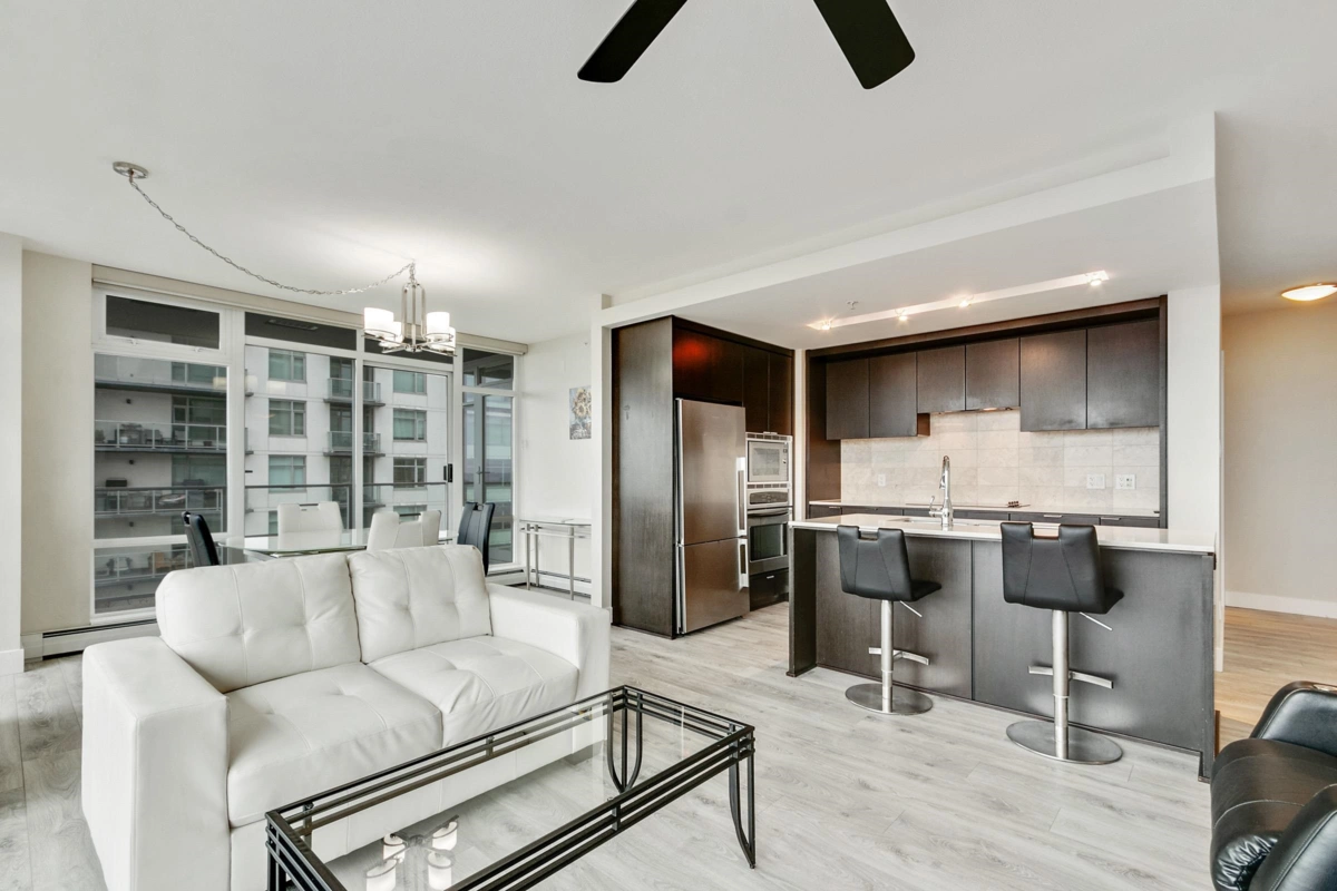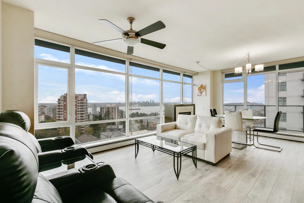 PANORAMIC VIEWS of the water, city and sunsets, from Mt Baker to Vancouver Island! Southwest-facing 2 bdrm 2 bath corner suite in the Leeds Certified Vista Place is situated in the heart of Central Lonsdale. This suite has an incredibly functional layout with no wasted space, modern finishings and breathtaking views from every window. Features include open-concept kitchen/living/dining, nicely separated bedrooms, a den/office. Steps to everything you could need - Whole Foods, Shoppers Drug Mart, City Market, Restaurants, cafes, parks, transit and more. Just a short walk to LoLo/Shipyards District. Enjoy fantastic building amenities which include a Fitness Centre, Sauna, Recreation room, Guest Suite, Gardens, and Bike Room. Comes with 1 parking.