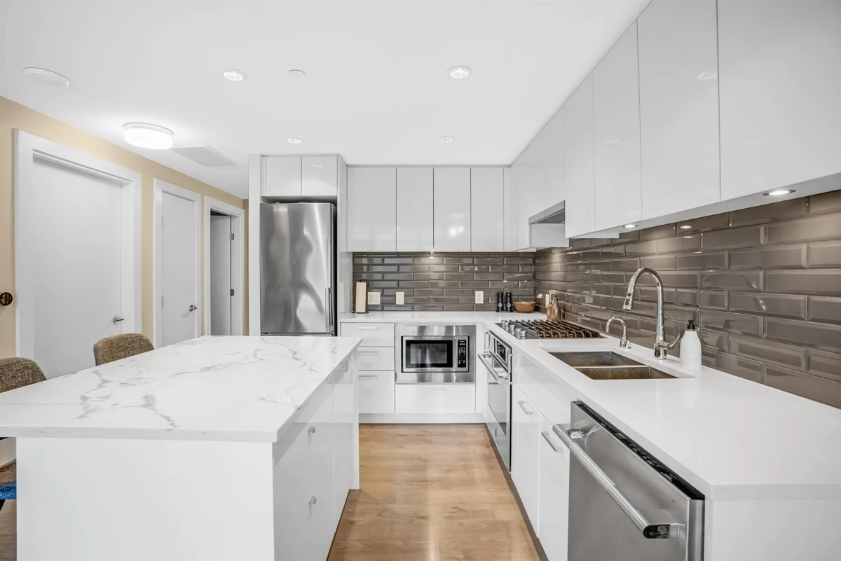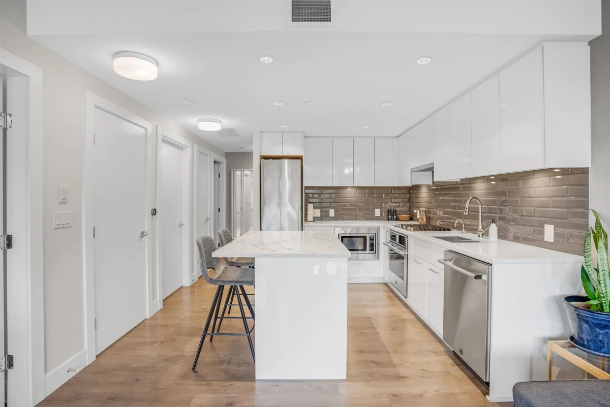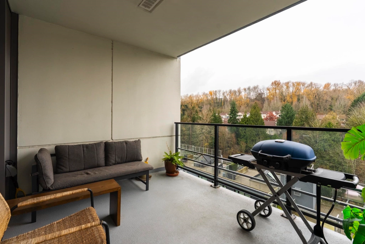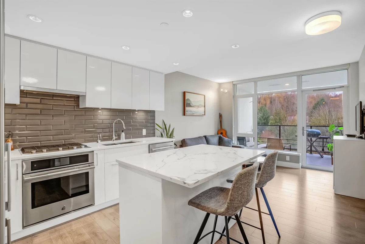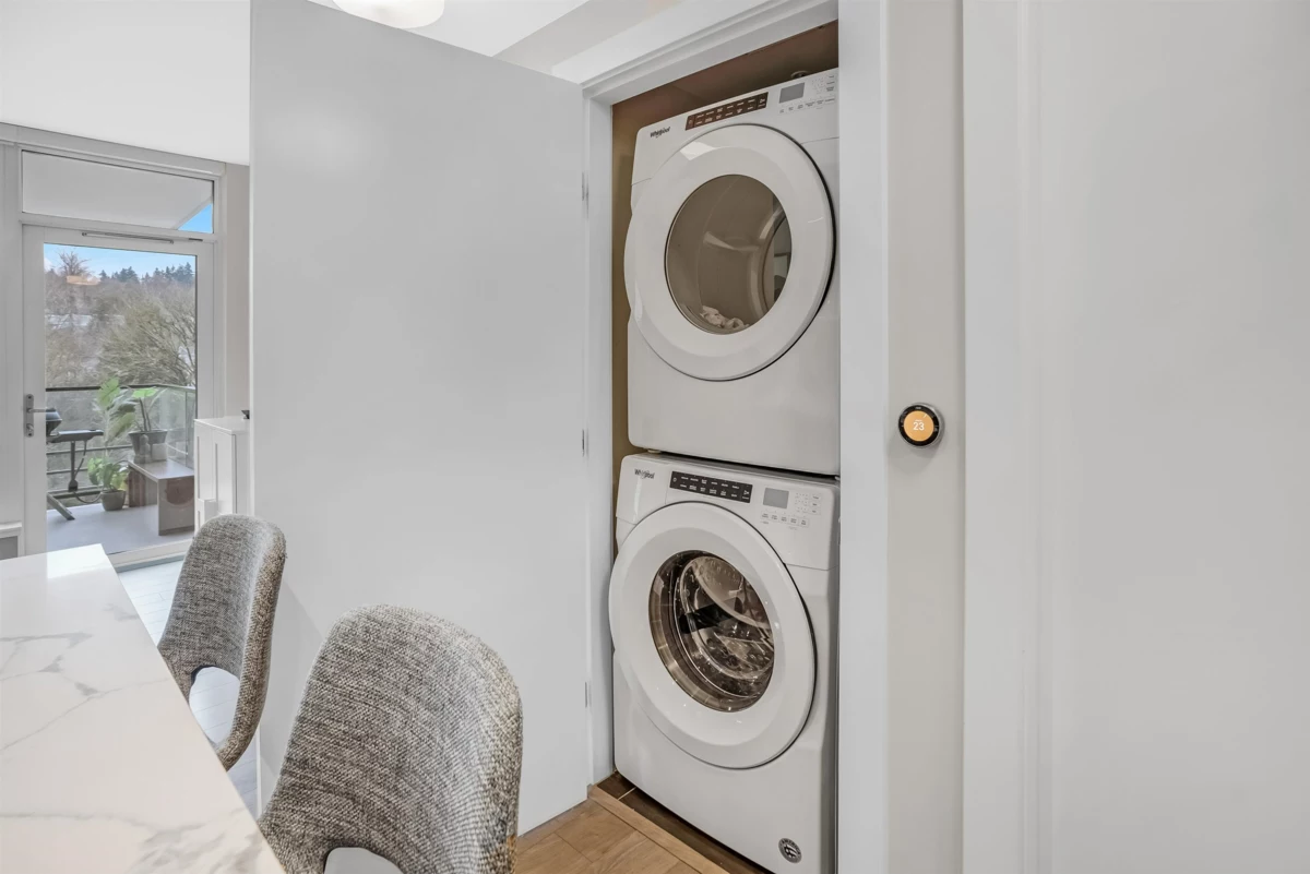 Live in the heart of River District in this north-facing 1 bed + den at Encore. This home offers a bright, well-planned layout with full-size stainless steel appliances, gas cooking, quartz counters, built-in storage, and a balcony overlooking peaceful greenery. Year-round comfort with heat pump heating/cooling and radiant in-floor bathroom heating. Enjoy one parking and a locker for added convenience. Residents enjoy Encore’s lounge and guest suites, along with full access to Club Central’s 14,000 sq. ft. of resort-style amenities including an indoor pool, hot tub, gym, courts, steam/sauna, kids’ spaces, and rooftop garden. Steps to Starbucks, Save-On Foods, dining, walking/biking trails, and transit.