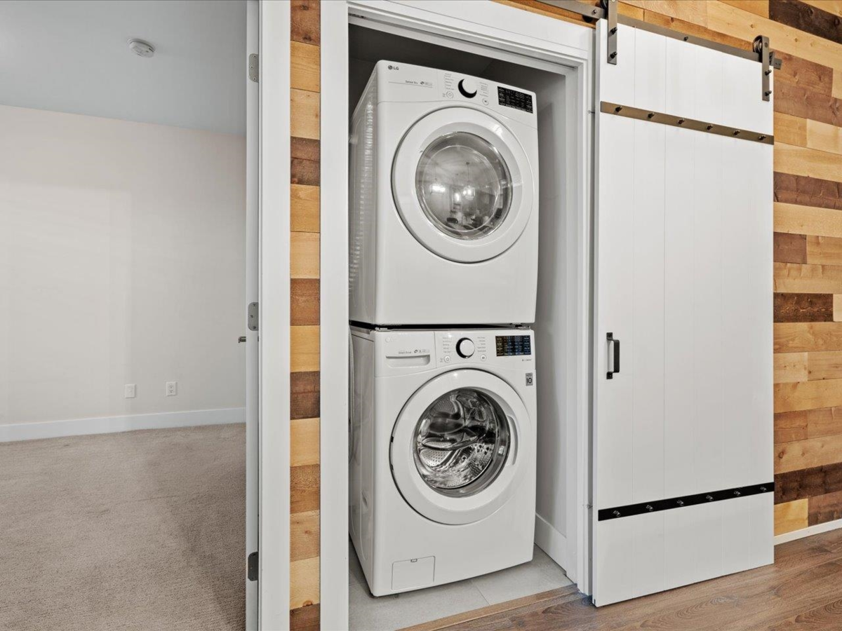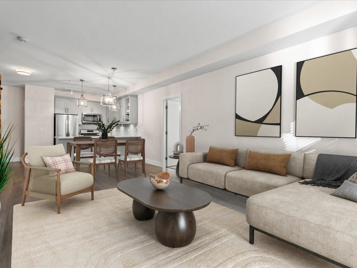 CRESCENDO - Welcome to this bright and modern 2 bed/2 bath ground-level corner suite offering 1010 sqft of spacious living in the heart of South Surrey. With direct outdoor access to the street and a fully fenced yard, this home offers a lifestyle ideal for those with children, pets or anyone seeking easy indoor-outdoor living. Two patios enhance the indoor-outdoor lifestyle, including one off the primary bedroom. Inside, enjoy a thoughtful layout with bedroom separation and an impressive reclaimed barn wood feature wall with 72” customizable color-changing electric fireplace for warmth and ambiance. Includes two underground parking stalls and is pet friendly. A fantastic ground-floor opportunity with outdoor space, privacy and everyday convenience close to shops, parks, and amenities.
