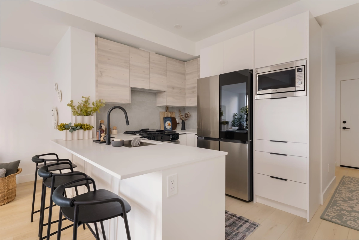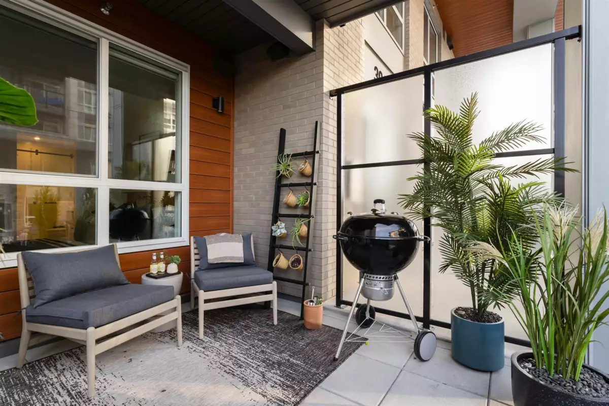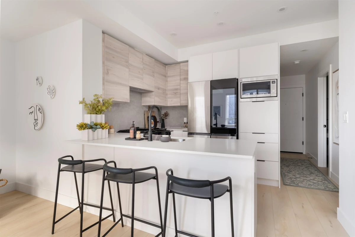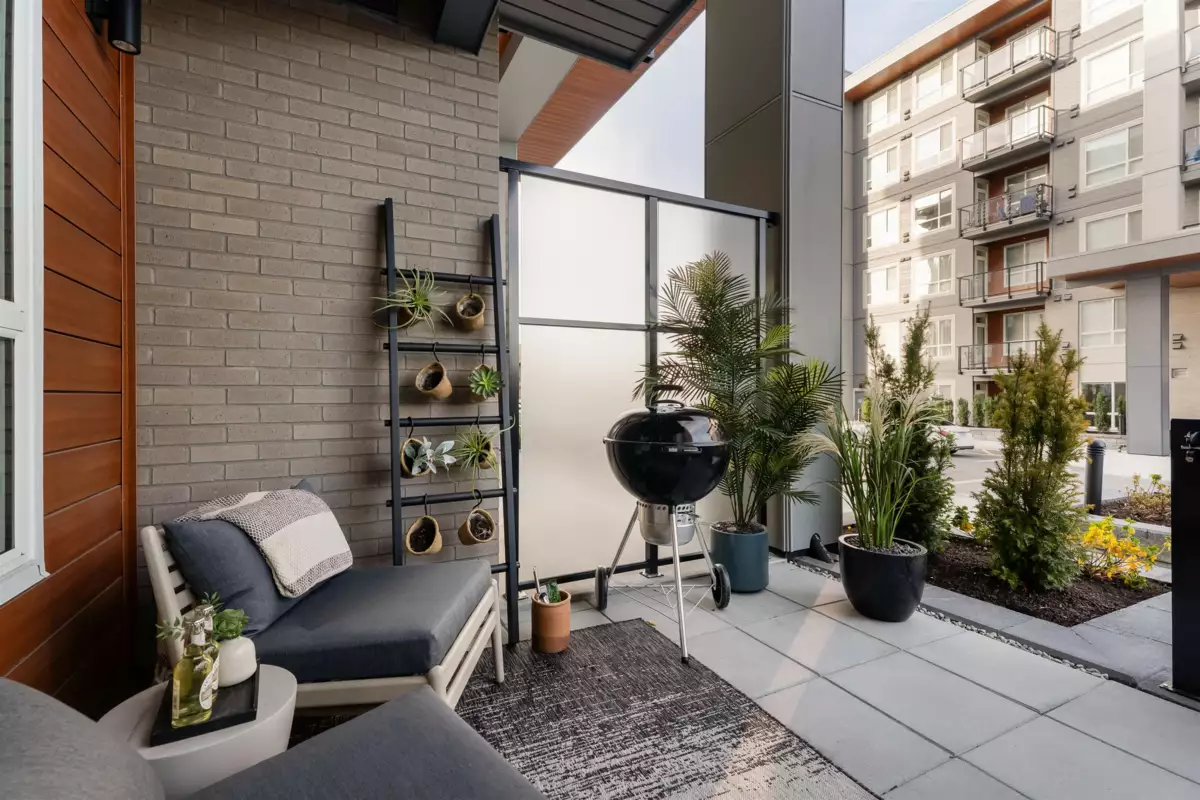 Beautifully designed Jr 2 bedroom, 2 bathroom ground-level home offers modern living with exceptional convenience. Featuring a bright, open layout with large windows and 9' ceilings, the space feels airy and inviting. The contemporary kitchen includes quartz countertops, stainless steel appliances, soft-close cabinetry, and an oversized island,perfect for everyday living and entertaining. Enjoy seamless indoor–outdoor living with your private ground-level patio, ideal for morning coffee, pets, or hosting Located just steps from Highstreet Mall, transit, and Highway 1 access, everything you need is right at your doorstep. Close to all levels of schools, including the University of the Fraser Valley, and minutes from the Abbotsford International Airport - Highstreet Village has it all.