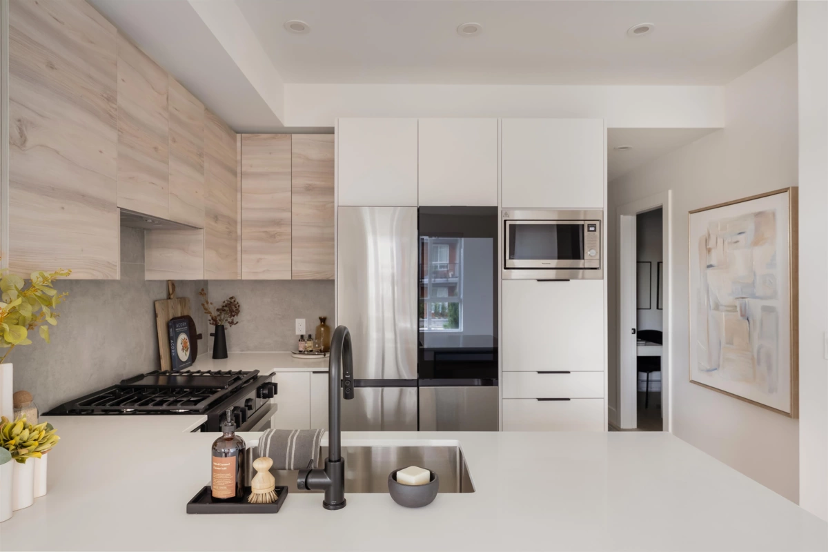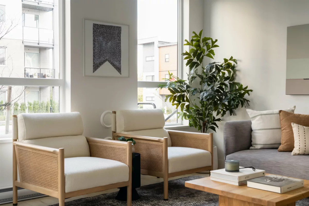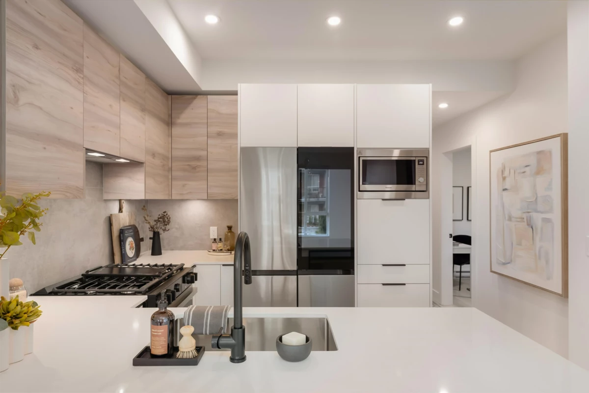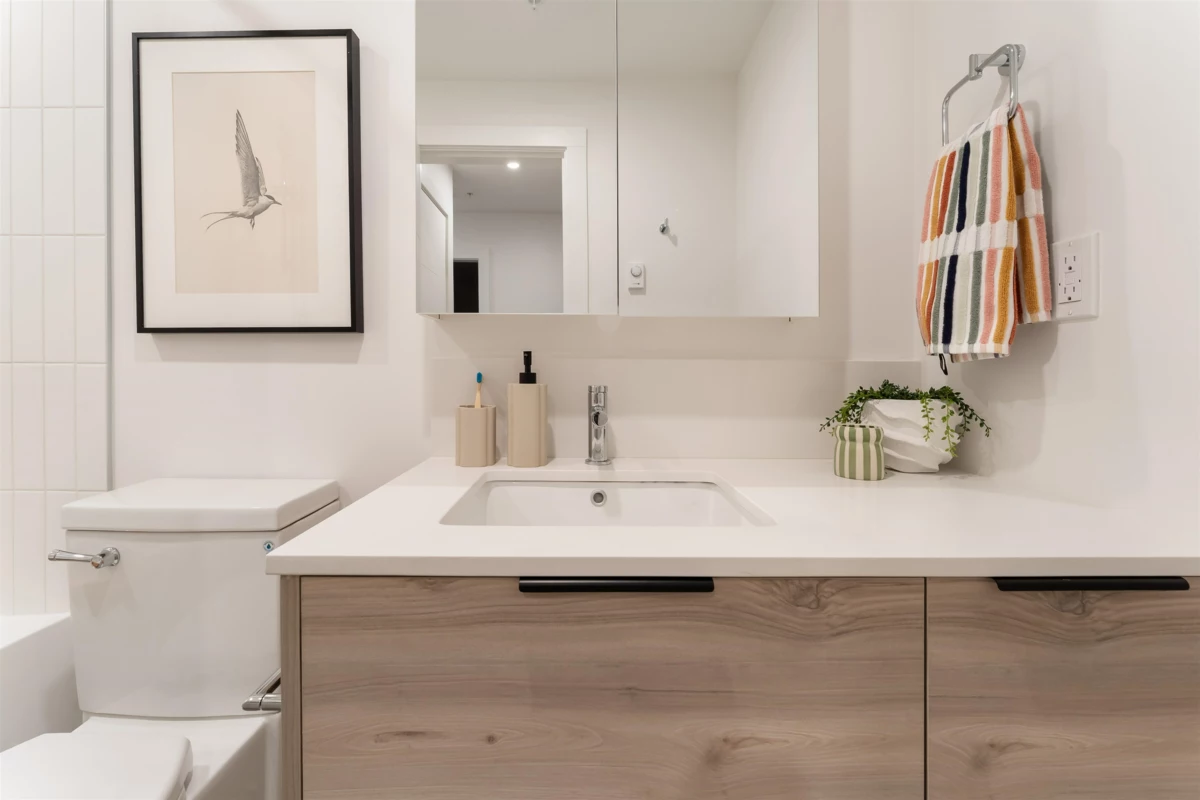 Beautifully designed Jr 2 bedroom, 2 bathroom ground-level home offers modern living with exceptional convenience. Featuring a bright, open layout with large windows and 9' ceilings, the space feels airy and inviting. The contemporary kitchen includes quartz countertops, stainless steel appliances, soft-close cabinetry, and an oversized island,perfect for everyday living and entertaining. Enjoy seamless indoor–outdoor living with your private ground-level patio, ideal for morning coffee, pets, or hosting Located just steps from Highstreet Mall, transit, and Highway 1 access, everything you need is right at your doorstep. Close to all levels of schools, including the University of the Fraser Valley, and minutes from the Abbotsford International Airport - Highstreet Village has it all.