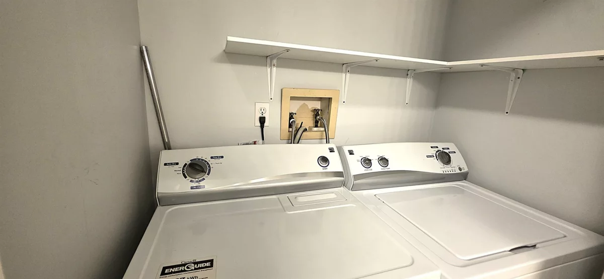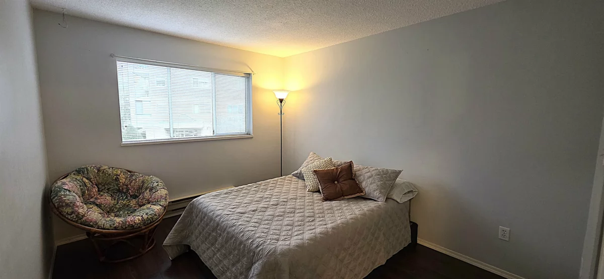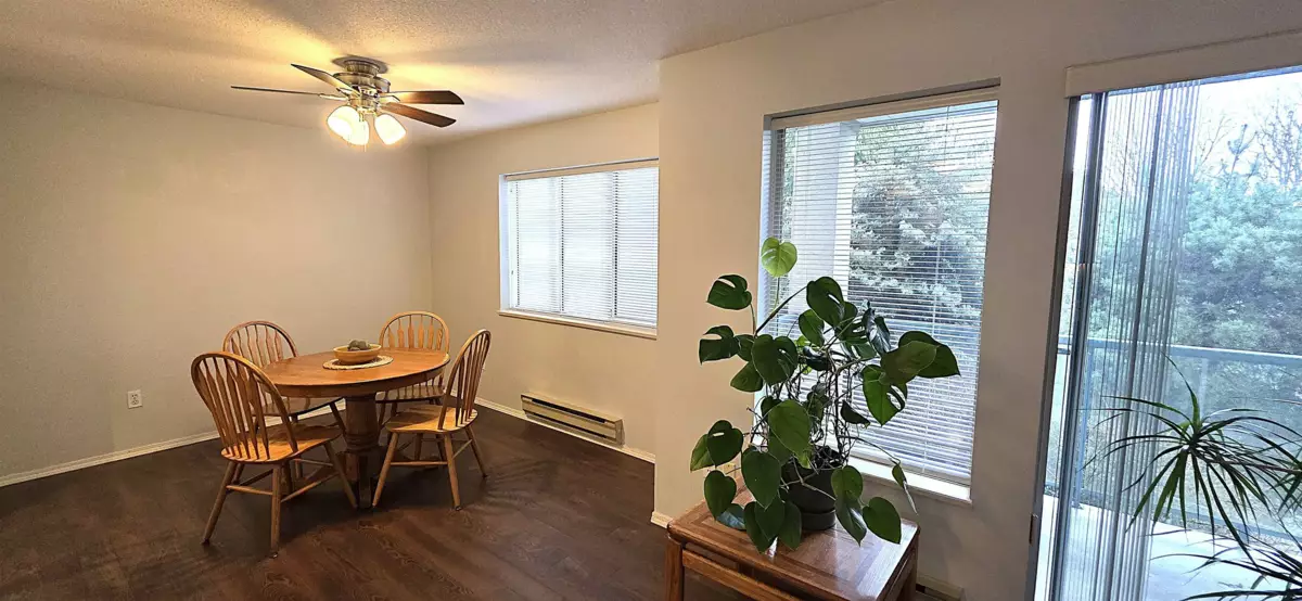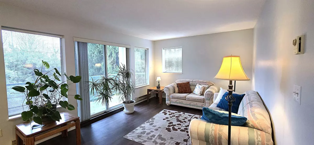 Beautifully updated, immaculately maintained, 2-bed, 1-bath open-concept CORNER UNIT. Located on the 1ST floor, but elevated above ground level, offering an ideal blend of convenience, privacy, and security, surrounded by lush trees and shrubs that provide natural sound dampening. The spacious kitchen is a rare find featuring S/S appliances, new countertops, stylish backsplash, refinished cabinets, updated sink & fixtures, and room for an eating area. The living room and dining room are flooded with natural light through a nearly full wall of windows and sliding glass door opening to a private balcony. IN SUITE LAUNDRY, abundant storage, and additional storage locker on the same floor. 1 secure underground parking (+ optional rental). Centrally located. This condo checks every box!