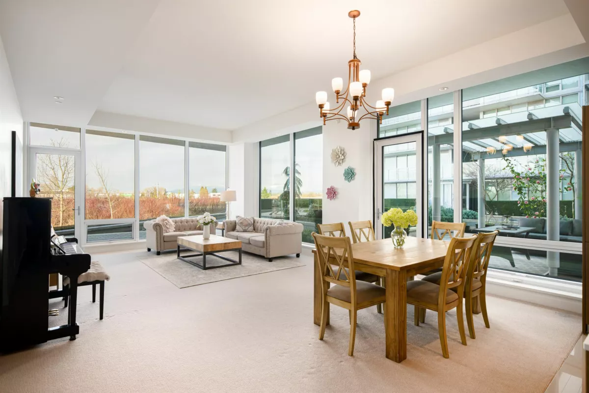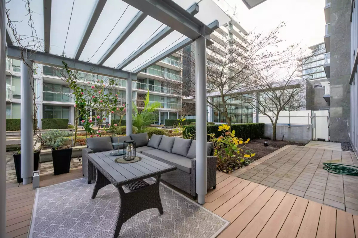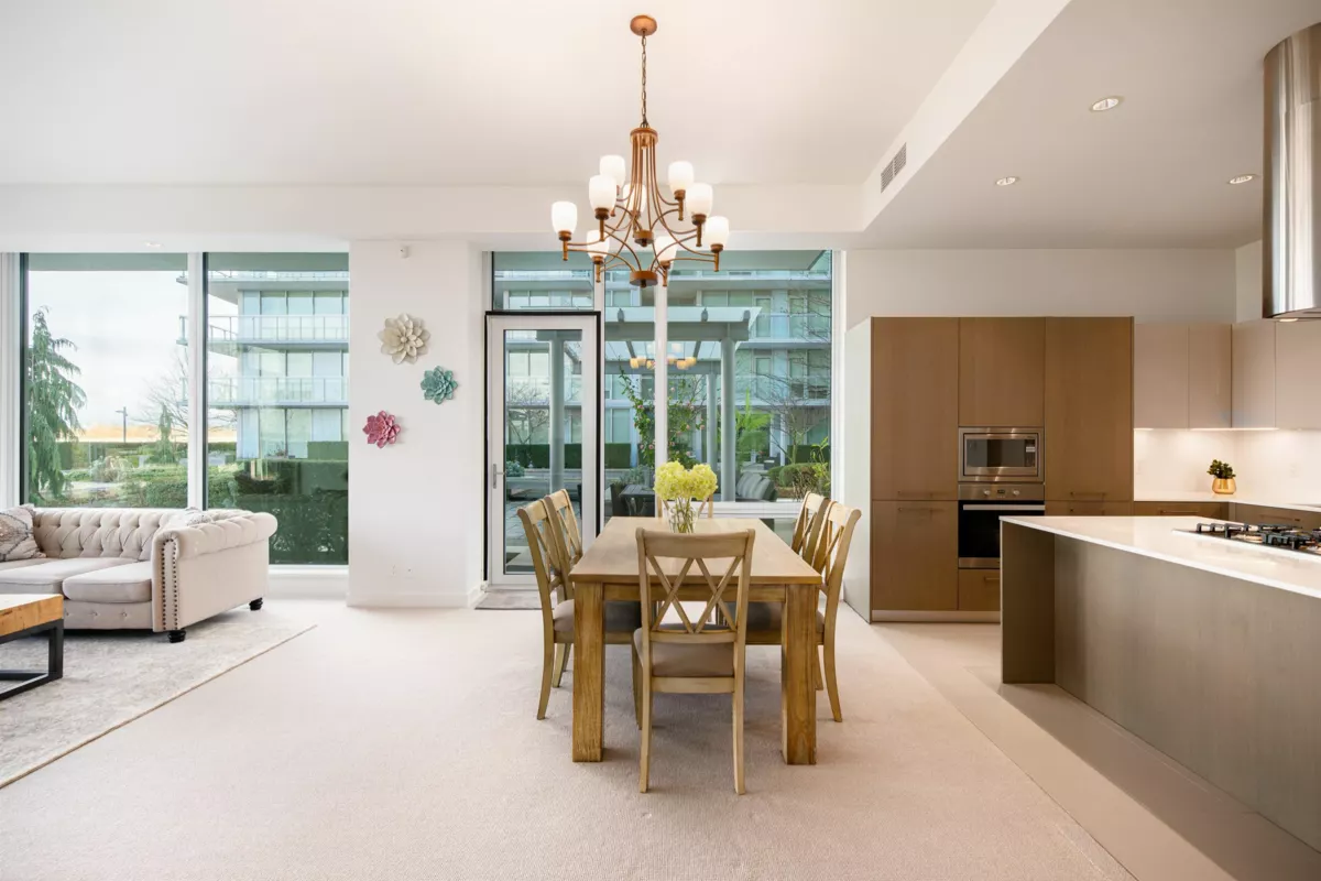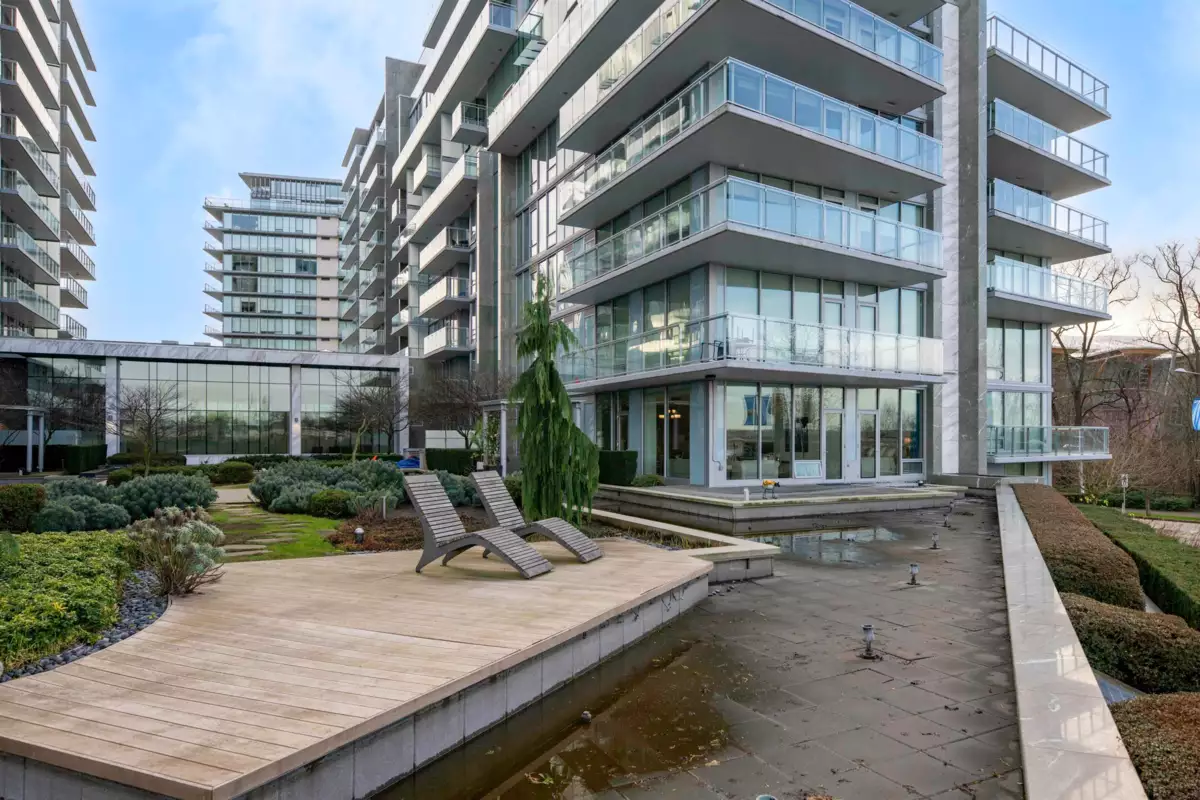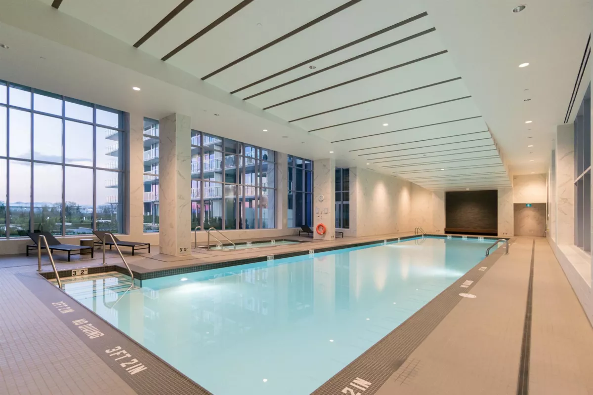 A rare must see piece! Timeless and refined, this coveted 3-bedroom corner residence at River Green showcases exceptional craftsmanship and luxury. A rare offering, it features a private gazebo on a tranquil waterside patio overlooking the serene inner garden, with an expansive 677-sq-ft outdoor area perfect for entertaining and gardening. Inside, soaring 11-foot ceilings flood the home with light, complemented by elegant Italian cabinetry and premium Miele appliances. A generously sized den accommodates a queen bed, adding flexible living space. Residents enjoy world-class amenities—including a 24-hour concierge, indoor pool, club lounge, and private cinema—plus breathtaking views of the manicured garden and fountain, the Fraser River, mountains, and unforgettable sunsets.