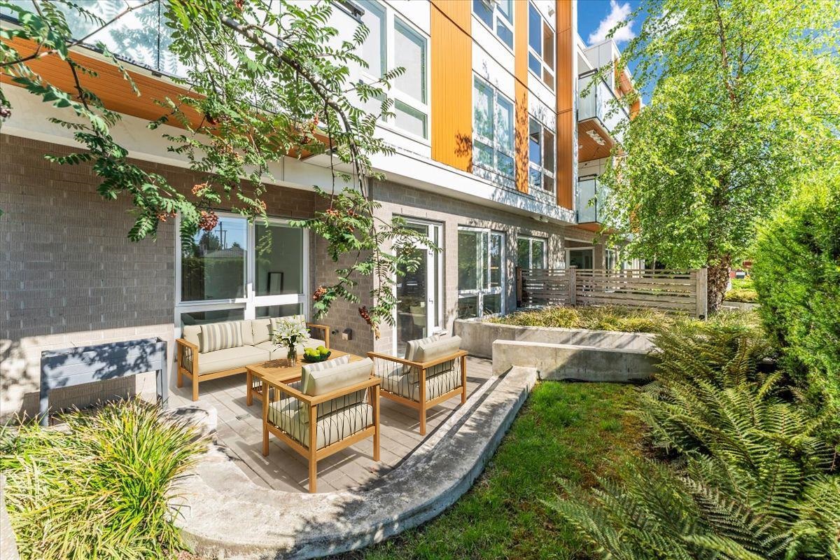 Welcome to Aster, an exclusive collection of 19 spacious two- and three-bedroom residences ideally situated in the heart of Vancouver's vibrant Marpole community. This walk-up suite showcases open concept living, elegant finishes, and a huge ground level patio. Unit 101 offers an expansive two-bedroom plus flex floor plan with impressive 10-foot ceilings, creating an airy, open feel throughout. This beautifully appointed home includes one parking stall and one storage locker for your convenience.Enjoy a connected lifestyle surrounded by a diverse array of everyday amenities, picturesque parks, and some of Vancouver's top schools-all just steps from your door.