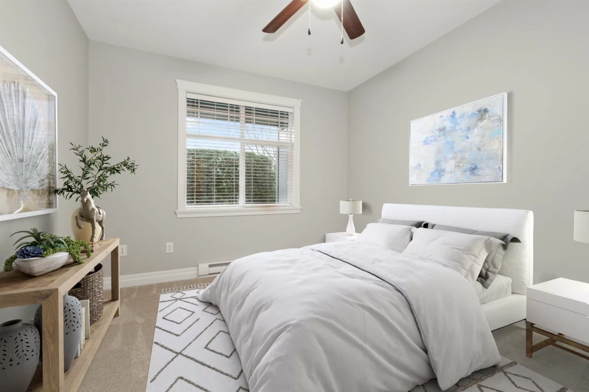 Welcome to Hartford Park in the heart of Garrison Crossing! This immaculate, well-maintained GROUND-FLOOR CORNER UNIT offers over 1,200 sq ft of bright, open living space. The generous 2-bedroom plus den layout (den easily used as a third bedroom) features 2 full bathrooms, including an ensuite and walk-in closet in the primary bedroom. Enjoy a thoughtfully designed kitchen and brand-new carpet in both bedrooms and the den. Step outside to a large private patio, perfect for relaxing or entertaining. This home includes 2 side-by-side parking stalls and a storage locker. No age restrictions and pet-friendly, allowing one cat or one dog up to 18 inches at the shoulder. Just steps to Cheam Leisure Centre, shopping, and restaurants. Open House Saturday, December 20th from 12–2!