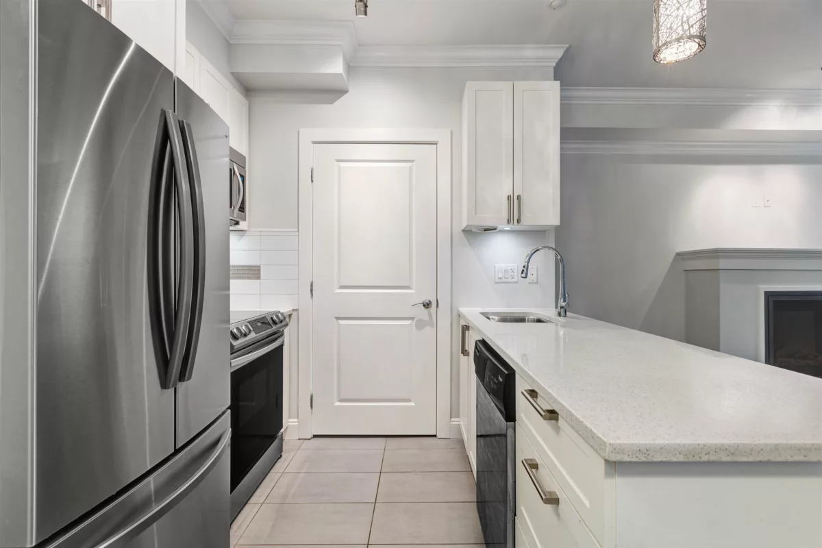 Enjoy life on the Fraser River! This beautiful ground level freshly painted one bedroom condo offers a open layout of luxury living with quartz counters, electric fireplace, newer s/s appliances, walk-in pantry, 9 foot ceilings and in suite laundry. This home also offers a larger bedroom with a picture window and an over sized closet complete with closet organizers. The direct access private backyard is the perfect spot to relax or play with your family pet or take in the panoramic views of the Fraser River and mountains from the rooftop patio. Centrally located walking distance to Billy Miner Pub, the West Coast Express and the river front, this home is not to be missed. Unit comes with 1 parking spot and 1 storage locker. 2 pets allowed, dogs up to 24 inches at the shoulder.
