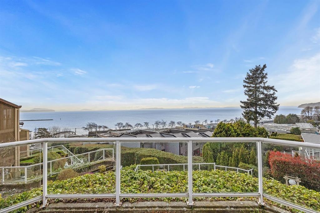 Welcome to your coastal retreat in the heart of White Rock! This fully renovated corner unit with 2-bed, 2 full bath offers the perfect blend of luxury and peace. Enjoy the tranquility of a 500 square foot ocean view garden level deck – perfect for entertaining and for gardeners. This private unit by Bosa features southern and western ocean views, floor-to-ceiling windows that bathe the home in light, while a cozy gas fireplace adds warmth and charm. Renovated kitchen, complete with quartz countertops and a deep granite sink with touch faucet, along with new flooring throughout. Enjoy amenities like a sparkling outdoor pool and soothing hot tub with ocean view. Just a 2-minute stroll to restaurants and the beach. Well-run strata.