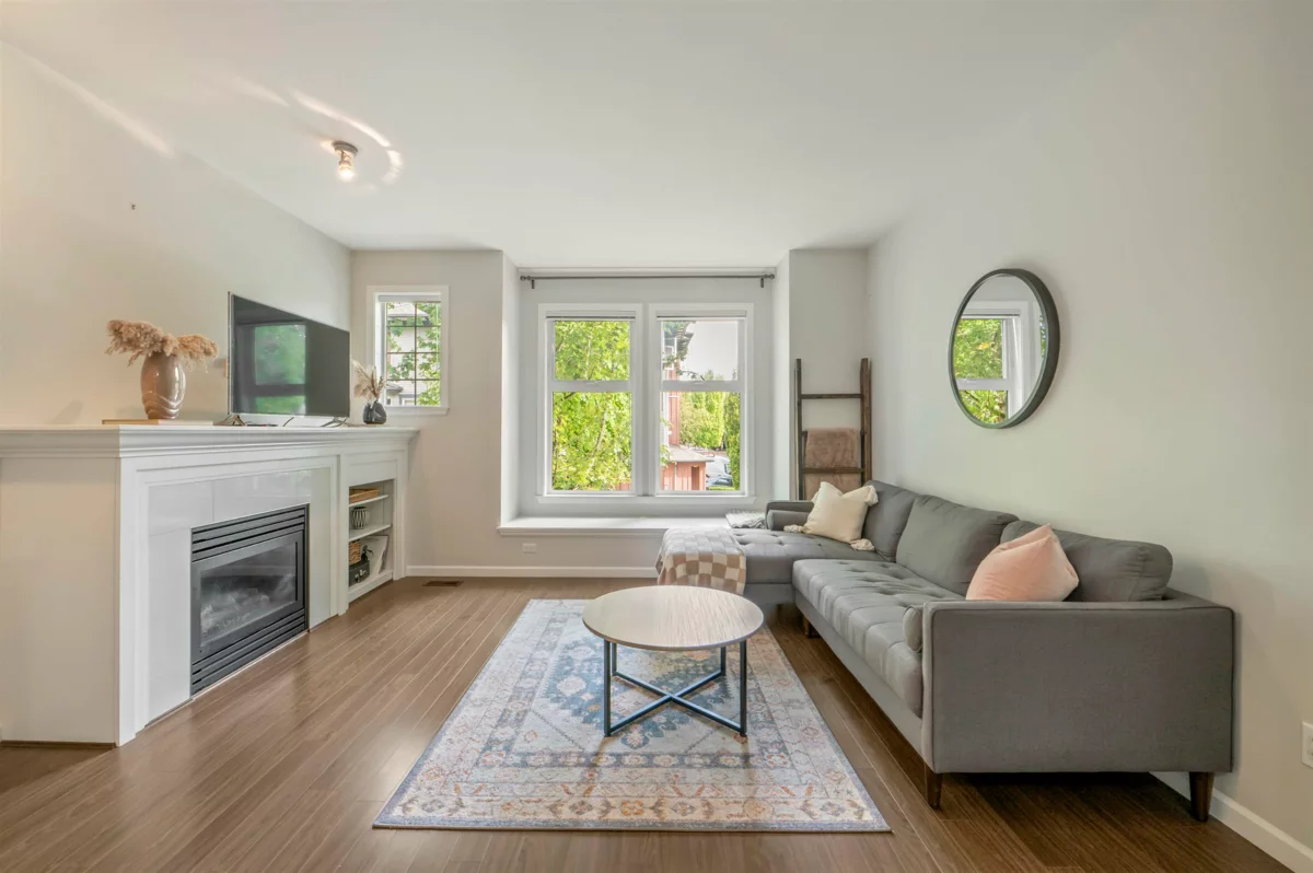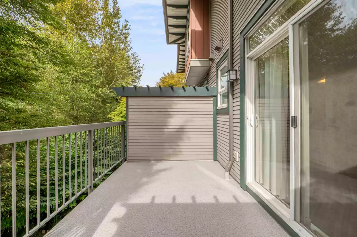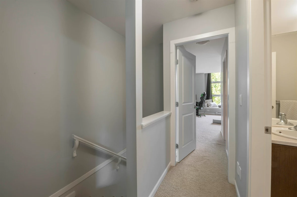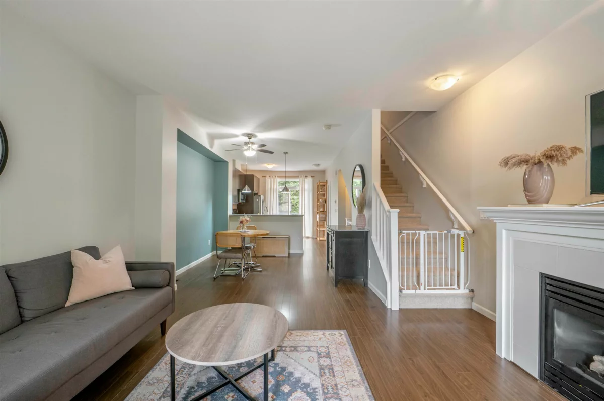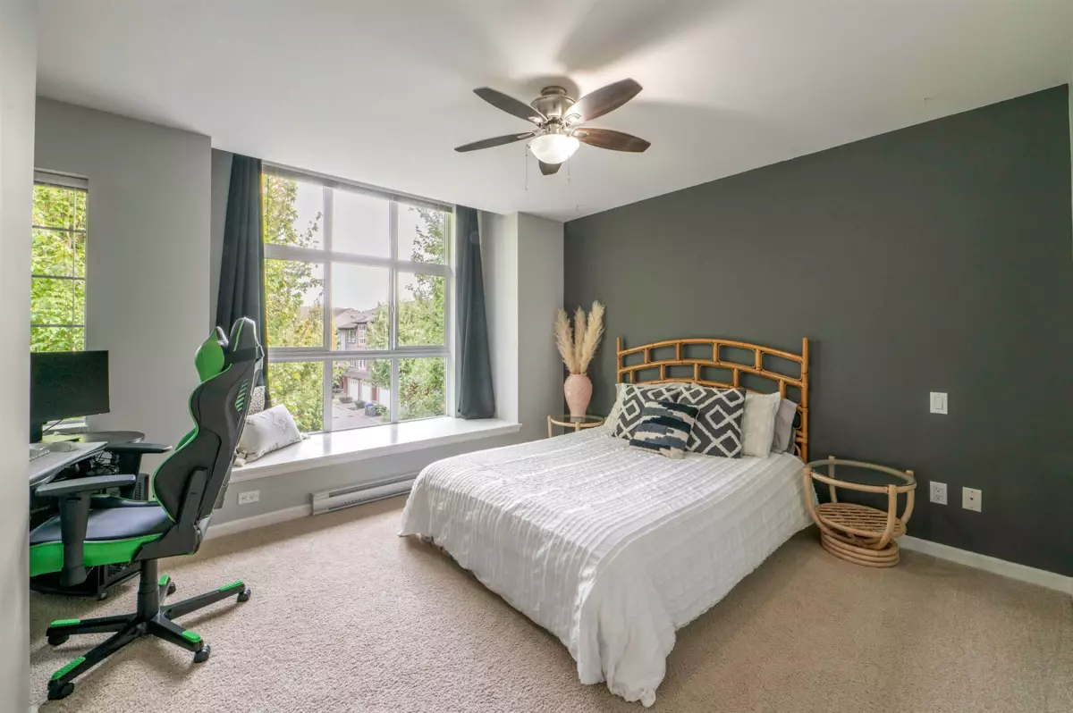 Welcome to Compass! This over 1200sf 2 bed, 2.5 bath townhome is in the perfect location backing onto a greenbelt/park-like setting. Open floor plan, 9' ceiling on main with spacious kitchen boasting S/S appliances incl. gas stove, granite counters & large balcony facing green space. Oversized windows flood the home with natural light & the gas fireplace compliment the living & dining room areas + a convenient powder room also on the main. Upstairs features a spacious primary bedroom w/4 piece ensuite + 2nd large bedroom on the opposite side & another full bathroom. Enjoy a coffee on your patio & fenced backyard off the ground floor. Great location within walking distance to shopping, restaurants, schools, parks, & transit (future skytrain).