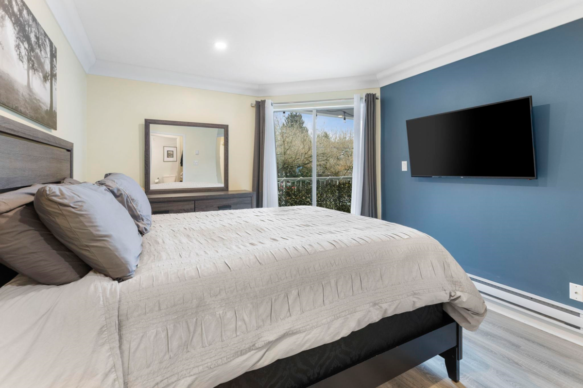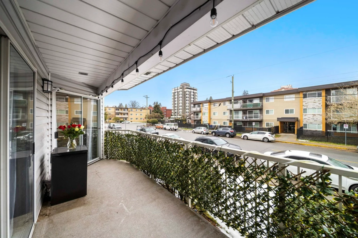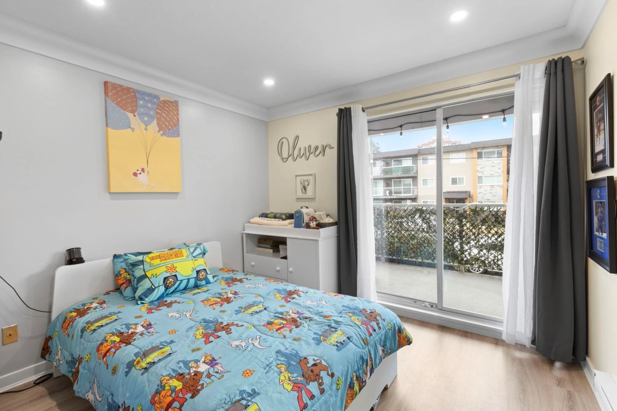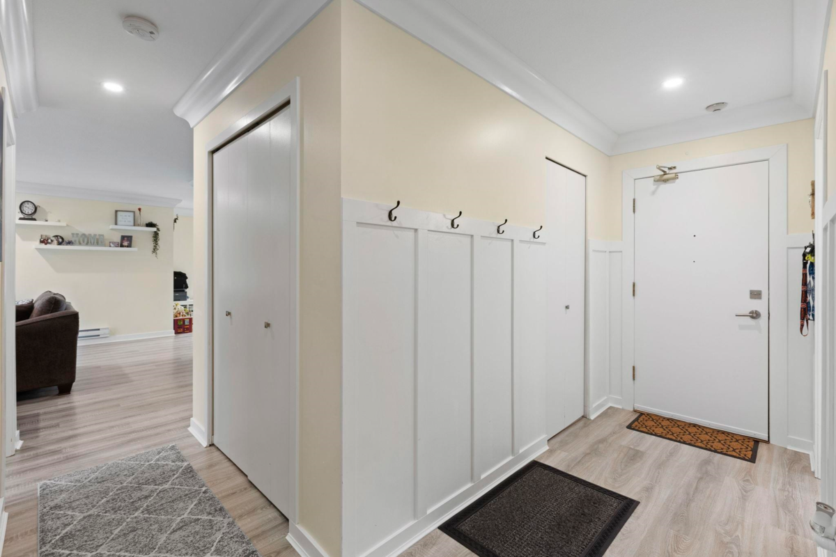 RARE TURN KEY find at this price! Spacious 1,125 sq.ft. corner unit gem with 2 large bedrooms & 2 full bathrooms. HARD TO FIND FEATURE: BRAND NEW built-in AC, heat pump, windows & patio doors (over $25K in upgrades) for year-round comfort & energy savings - no need for baseboard heat! Impressive wrap-around balcony. Enjoy recent upgrades: new flooring, paint, appliances, & elegant LED lighting complemented by custom crown molding & wainscotting. No need for a vehicle in this neighbourhood with most local festivals & amenities within walking distance - West Coast Express, 2 shopping malls, banks, library, Walmart, Dollarama, & many medical offices. Storage space included in-unit & additional storage locker on same floor as unit. Pets bylaw: 2 cats allowed, no dogs allowed. 2 parking.