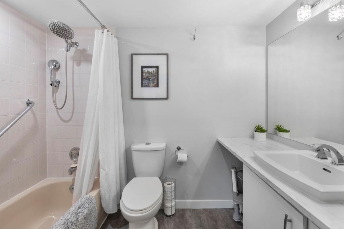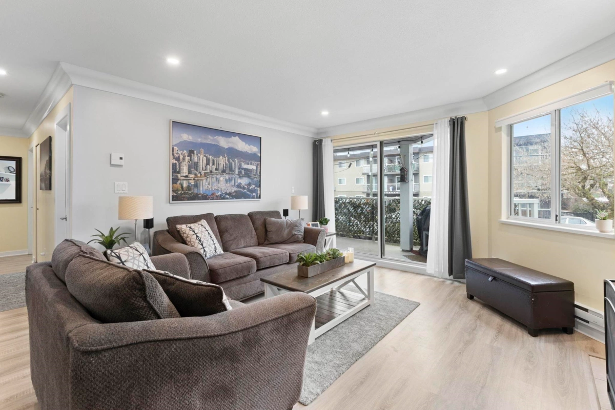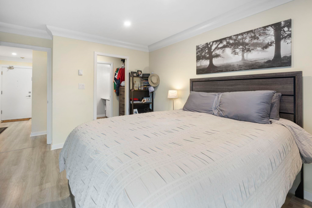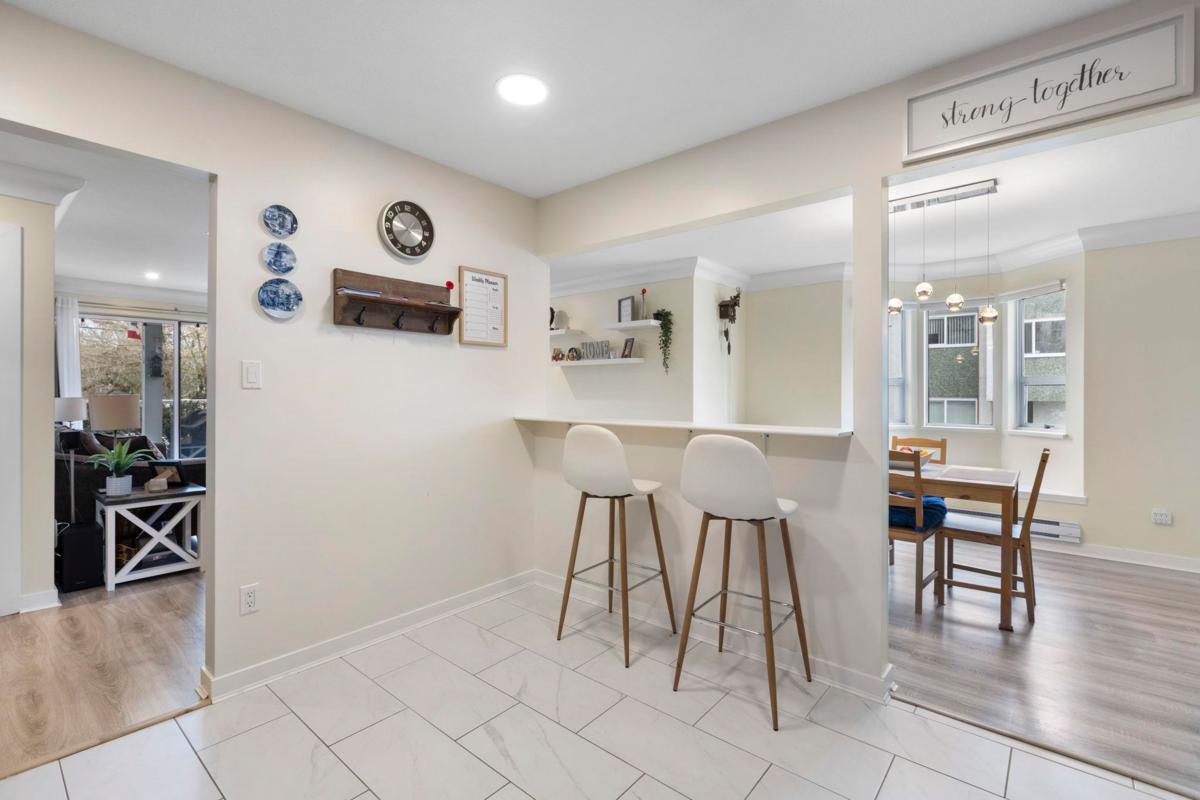 RARE TURN KEY find at this price! Spacious 1,125 sq.ft. corner unit gem with 2 large bedrooms & 2 full bathrooms. HARD TO FIND FEATURE: BRAND NEW built-in AC, heat pump, windows & patio doors (over $25K in upgrades) for year-round comfort & energy savings - no need for baseboard heat! Impressive wrap-around balcony. Enjoy recent upgrades: new flooring, paint, appliances, & elegant LED lighting complemented by custom crown molding & wainscotting. No need for a vehicle in this neighbourhood with most local festivals & amenities within walking distance - West Coast Express, 2 shopping malls, banks, library, Walmart, Dollarama, & many medical offices. Storage space included in-unit & additional storage locker on same floor as unit. Pets bylaw: 2 cats allowed, no dogs allowed. 2 parking.