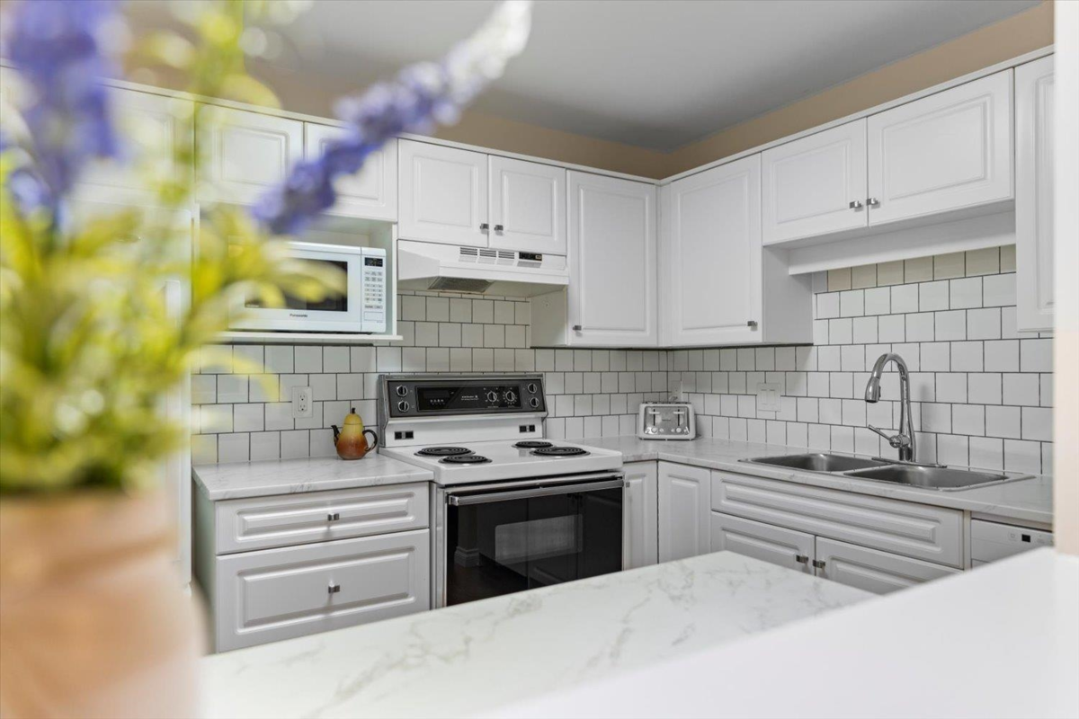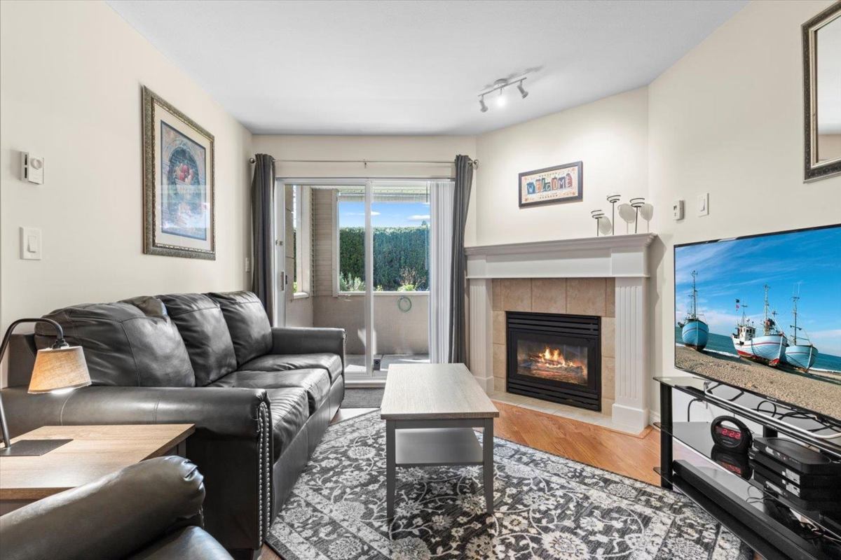 Immaculate 2 BEDROOM + 2 BATHROOM condo in the desirable CAMBRIDGE building. With tasteful renovations such as laminate floors, fresh paint, and kitchen and bathroom upgrades, this condo is TURN-KEY. In the kitchen enjoy white cabinets, new countertops with tile backsplash, and an additional eating bar. The living area features a natural gas fireplace (which is a fantastic heat source in winter) and opens up onto your private patio. A large primary bedroom features a walk in closet and ensuite. Your storage locker is conveniently located just across the hall. Enjoy PEACE and PRIVACY at the Cambridge--a strata with a great reputation.
