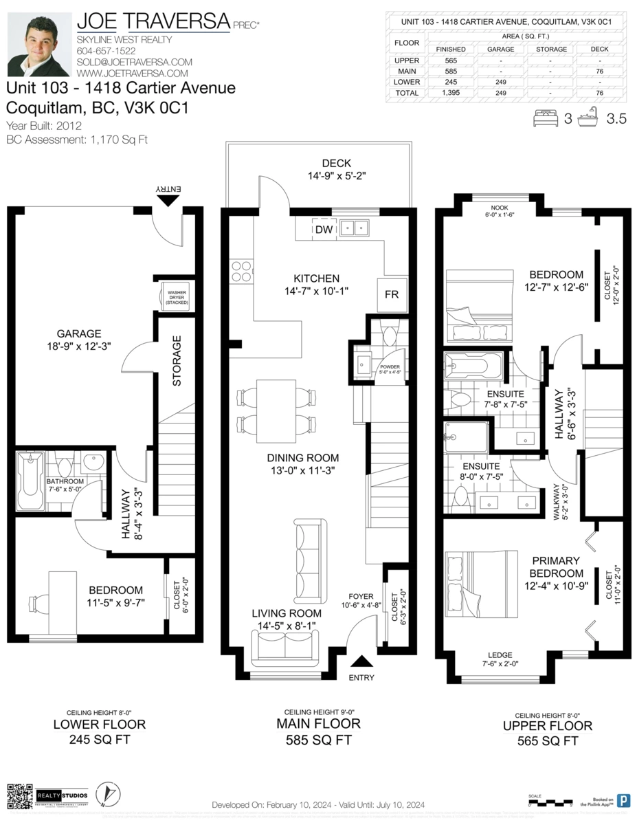 Bright and rare 3 bedroom, 3 level townhome, located in Central Coquitlam near transit, shops, parks, and schools. Very open floorplan for entertaining your guests. Living room, adjoining dining room & convenient half bathroom complete the main floor. 2 equal sized bedrooms upstairs can fit king beds + 1 bedroom with its own full bathroom in basement for separation! Attached single car garage with tons of extra parking. Desirable Maillardville location close to the freeway, Mackin Park, Superstore, restaurants, and steps to direct bus or Lougheed/Braid Skytrain. Only 30 mins to Downtown!