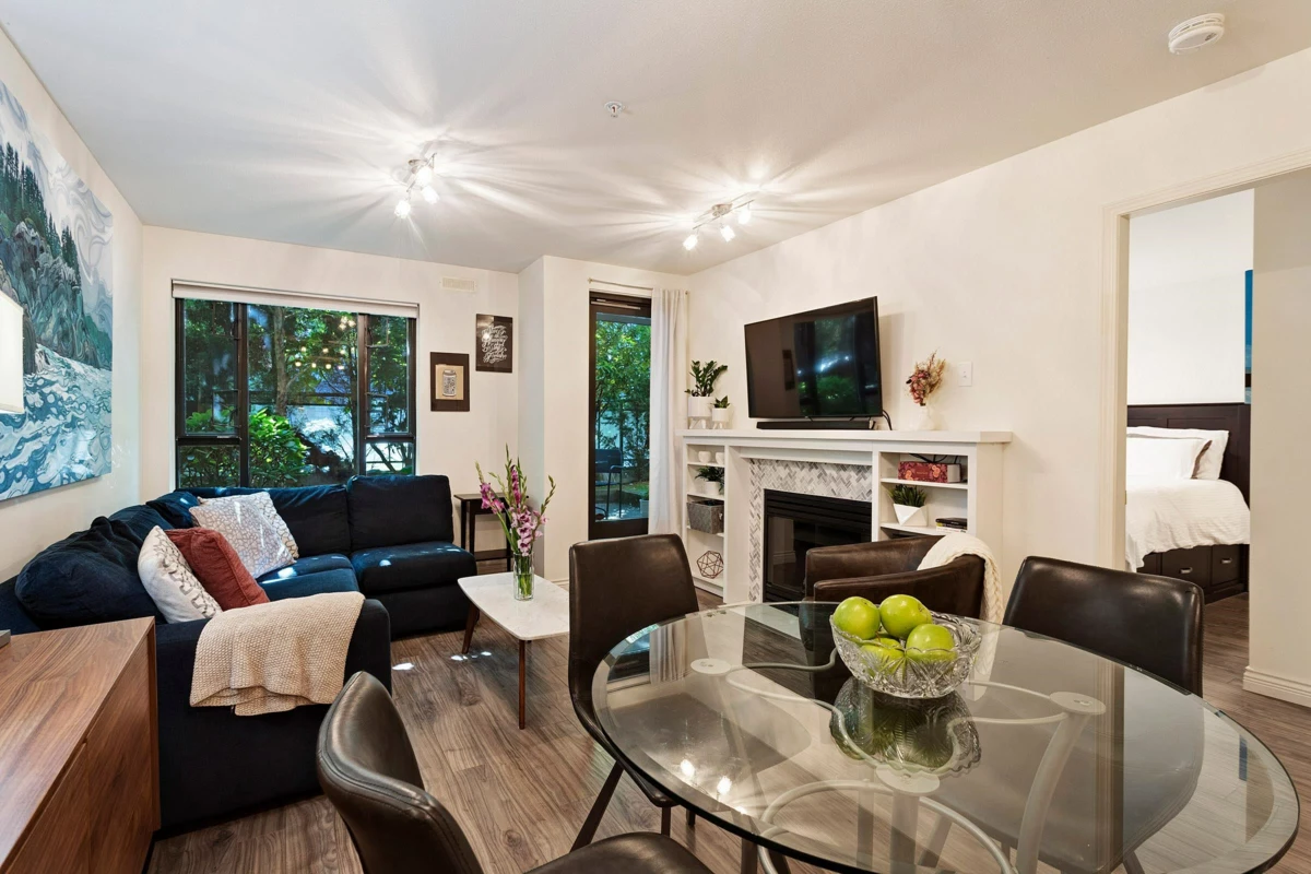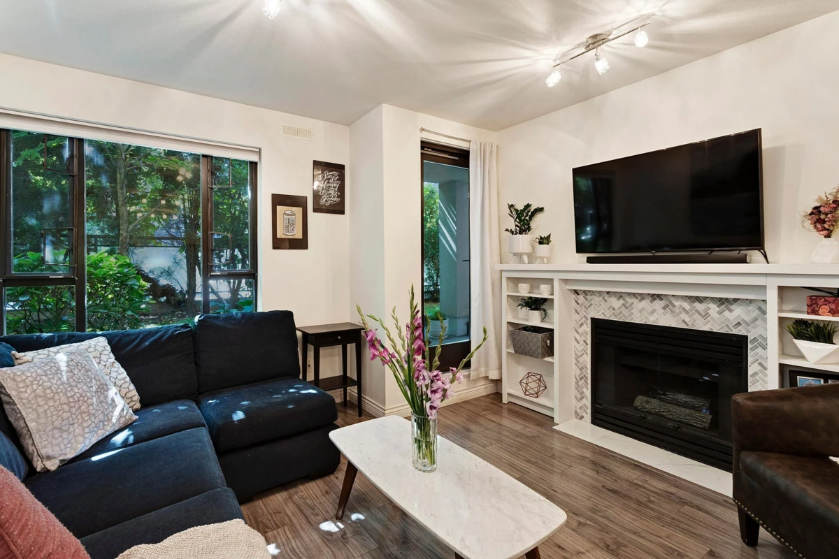 Welcome Home! This comfortably elegant suite is beautiful with a private outlook to the garden and patio. Offering an open plan there is not a square inch wasted, in this functional layout. The kitchen adds ease to entertaining and the updates, including the kitchen, bath and fireplace have added polish to the overall fit and finish of this home. The primary bedroom is large enough for a king sized bed and the adjoining bathroom through the walk-in closet adds privacy overall. The building is well maintained and offers large communal hallways, low maintenance fees, just steps to all that Lonsdale has to offer, shopping, transportation, recreation centers and convenient walking paths are just steps away. The Seabus allows for quick access to downtown Vancouver. This one is very special!