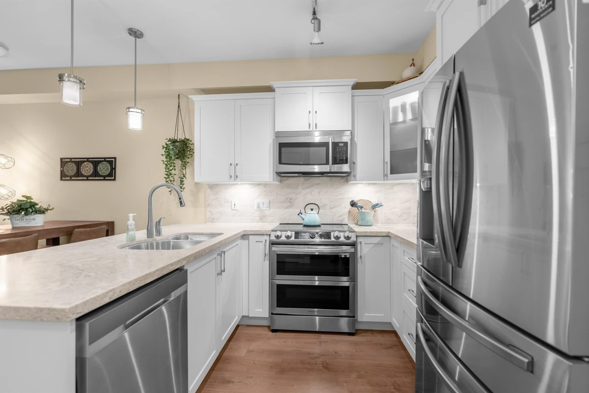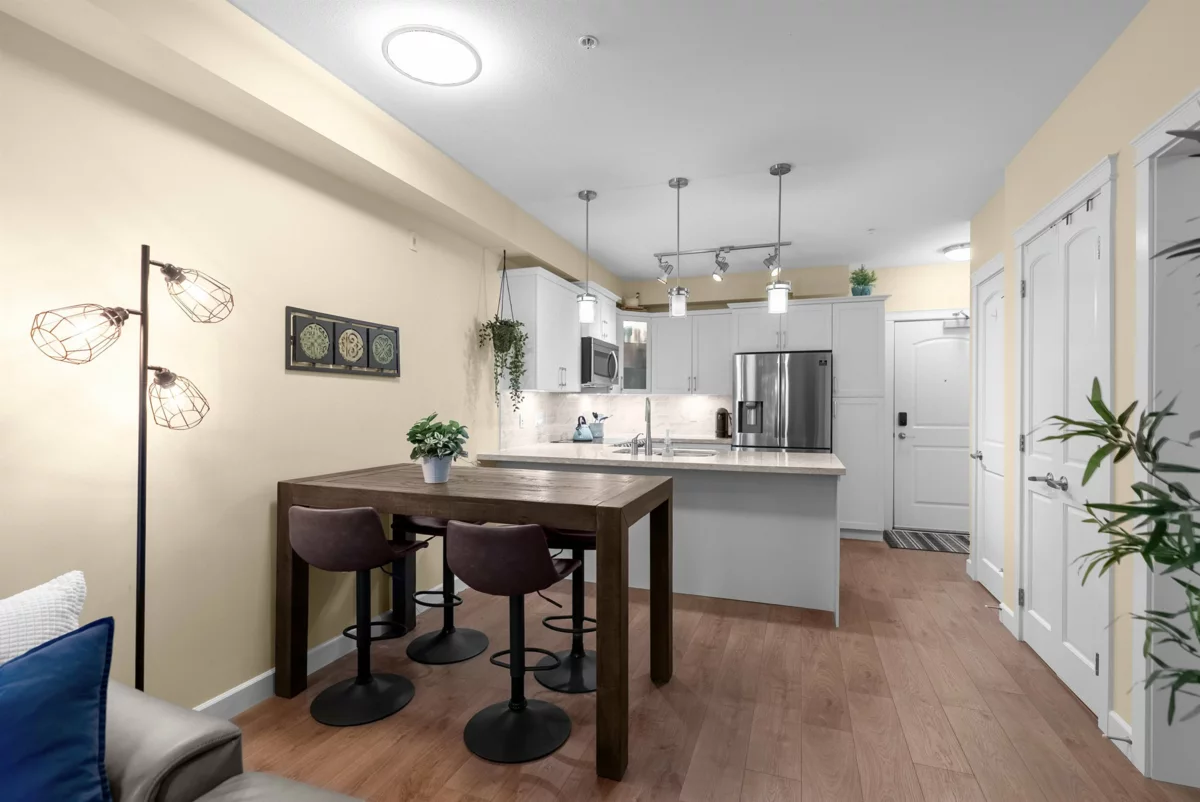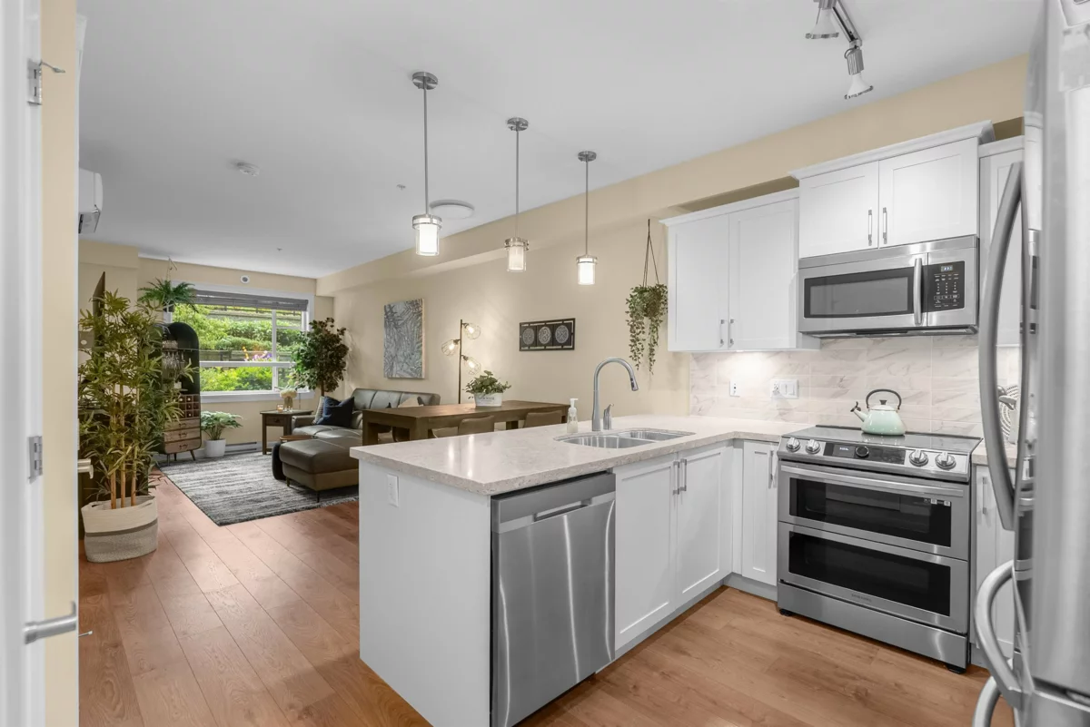Spacious ground-floor home with retractable glass solarium, and bonus 200 sqft private patio in Sought-After Forest Ridge by Quadra Homes! Perfectly located just minutes from Crescent Beach, Hwy 99, and South Surrey Park & Ride. This beautifully ground-floor unit offers park views! Ideal for pet lovers, gardeners, and year-round entertaining. Enjoy stylish upgraded flooring throughout, AC, and outdoor gas hookup for seamless summer BBQs. The chef-inspired kitchen boasts stainless steel appliances including a new induction range, quartz counters and timeless white shaker cabinetry. Soaring 9’ ceilings and Quadra’s exclusive sound-dampening acoustic package. Includes 2 secure underground parking stalls and storage locker. Open House October 4th, 1-3pm.