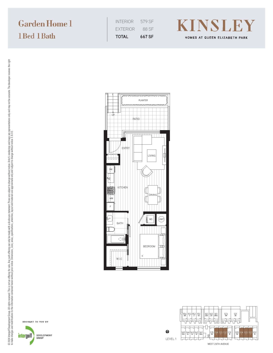 MOVE-IN READY, BRAND NEW HOMES. PARKING OPTION TO PURCHASE (NOT INCLUDED WITH PURCHASE PRICE). Discover Kinsley by Intergulf - this one bedroom garden flat is located on W 28th and Yukon, and move-in ready! With nearby convenience to King Edward SkyTrain, top hospitals, Cambie Village shopping and restaurants, and next to Queen Elizabeth Park. Enjoy expansive outdoor patios while inside, high-end details shine —engineered hardwood floors, a premium integrated Miele appliance package with gas cooktop, A/C, triple-glazed windows, quartz countertops, and up to 9ft ceilings. Plus, 2000 SqFt of community amenities with a play area, firepit, BBQ, and garden. Call to book your private appointment.