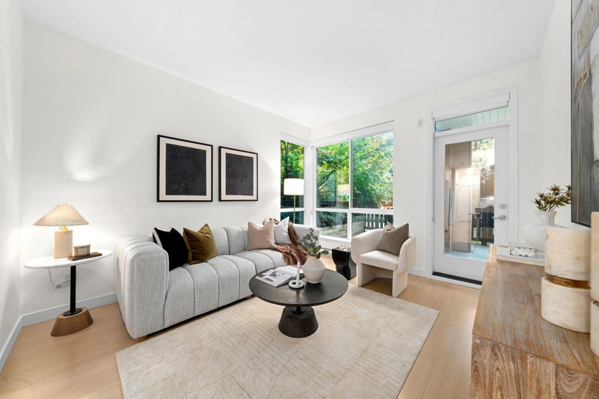 Discover modern living at Seasons by Ledingham McAllister. This exquisite two-bedroom, two-bathroom home, in near-new condition, is a quiet sanctuary tucked away on the building's most peaceful side. The open-concept floor plan seamlessly connects to an expansive, private, and gated covered patio—an ideal extension of your living space. The chef-inspired kitchen boasts sophisticated soft-closing white oak cabinets, elegant quartz countertops, and a premium stainless steel KitchenAid appliance suite. Situated in the heart of the dynamic Brentwood area, this home is a quick five-minute walk to the SkyTrain station, placing you at the centre of convenience. Amenities include a state-of-the-art exercise centre and a dedicated children's play area. **OPEN HOUSE OCTOBER 25TH 2-4pm.**