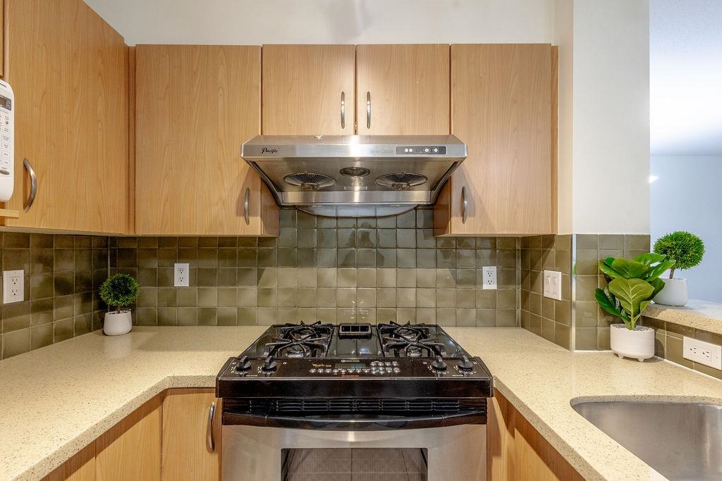CHURCHILL GARDENS built by award winning developer Polygon, prime South Cambie area.Extremely quiet and bright home. This move-in ready 2 Bed 2 Bath 856 SF unit faces NORTH towards the garden, it features stainless steel kitchen appliances, gas stove, gas fireplace, 9 foot ceiling, walk in closet in master bedroom and 124 sf patio; unit includes engineered hardwood flooring, granite kitchen counter-tops. Marpole Oakridge Community Centre, daycare facility, Oak Park are steps away. Catchment schools - Churchill Secondary and Laurier Elementary is walking distance. Just an quick stroll to the Canada Line & Marine Gateway and Marpole's Shopping District. Short drive to the most prestigious private schools. Welcome HOME. BONUS: 2 parking (side-by-side) AND 2 HUGE storage lockers!
