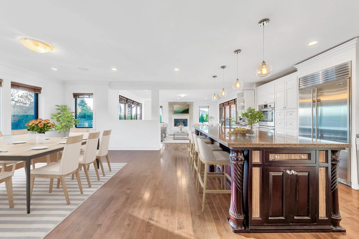 Contemporary West Coast home on Sentinel Hill, redesigned by Mason Kent and rebuilt by Phipps Construction. Approx. 4,000 sq.ft. on a 75x122 ft lot with southwest water views. Features include Home Automation and a detached office/nanny suite. Main level offers an open kitchen, dining and Great Room leading to a heated covered patio with built-in BBQ, plus separate den and large mudroom. Gourmet kitchen with Sub-Zero fridge, Fisher & Paykel 6-burner range, wine fridge and oversized island. Upper level has 3 bedrooms including a luxury primary with sundeck, Jacuzzi tub and steam shower and Nu-Heat in-floor heating in all bathrooms. Lower level includes media room, games room with bar, covered patio with fireplace, wine cellar and 2 bedrooms. Detached garage, irrigation and more.