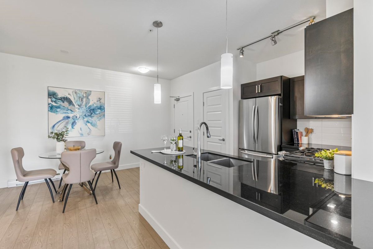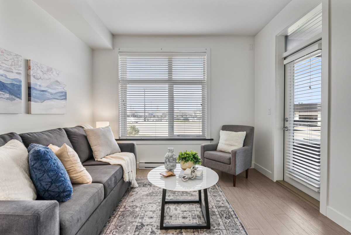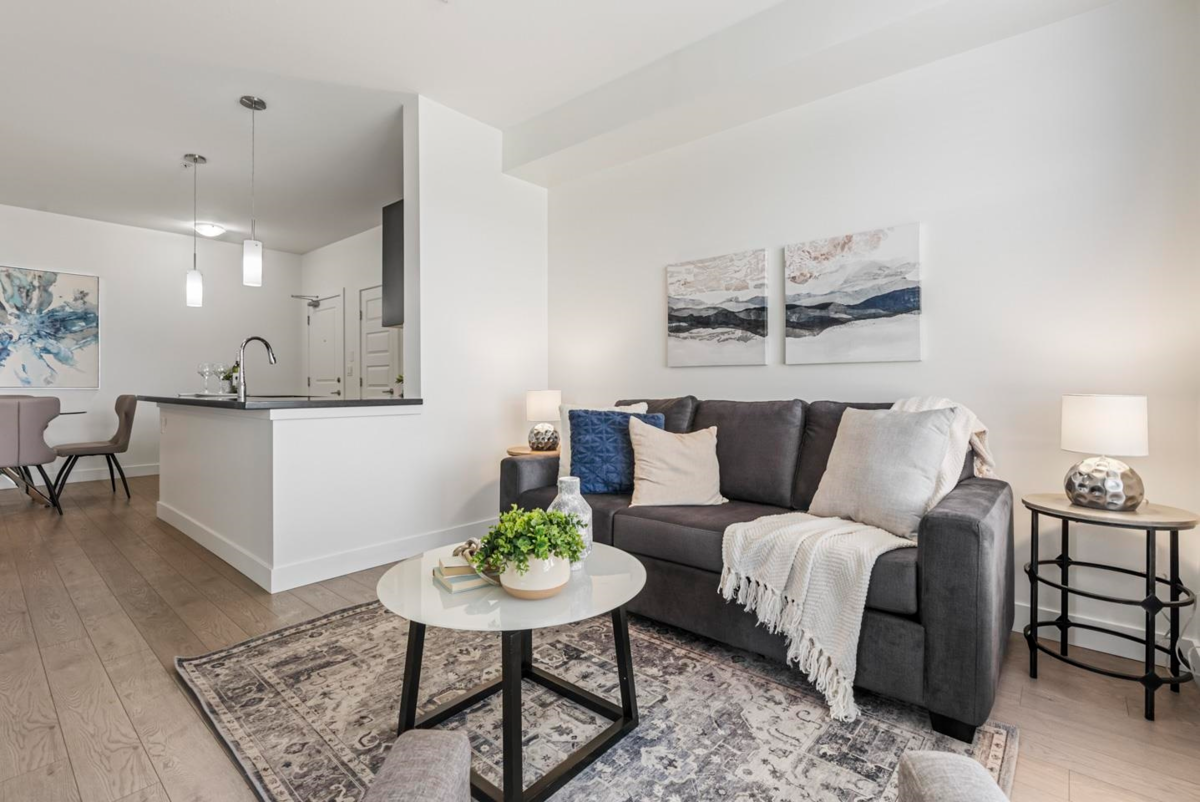Striking 1BR 1BTH ground floor corner unit in Langley. Welcoming you into your chic home are wide-plank laminate floors beneath airy ceilings highlighting a stylish kitchen with sleek, stainless steel appliances & a gas range gleaming against rich cabinets, quartz counter tops & a convenient breakfast bar. Enjoy relaxing evenings in the naturally well-lit living room & lively weekends on your 90 SQFT covered patio. Plush carpeting envelops your tranquil bedroom boasting a generous closet with built-in organizers across from the well-appointed bathroom with a large mirror & floating vanity. With secured underground parking, Varsity, is steps to KPU, Save On Foods, Willowbrook Mall & every imaginable urban convenience. Easily commute to neighbouring cities via Fraser Hwy, 200 St & Hwy 10.