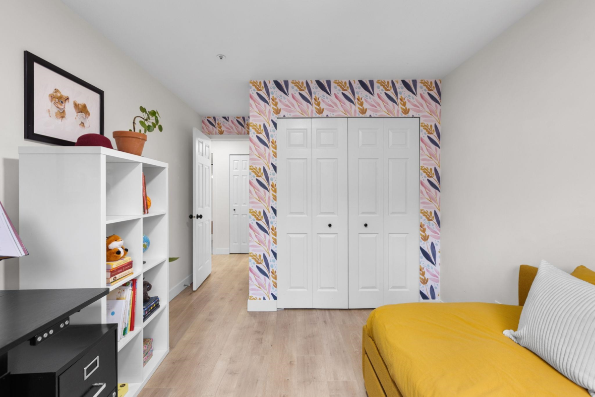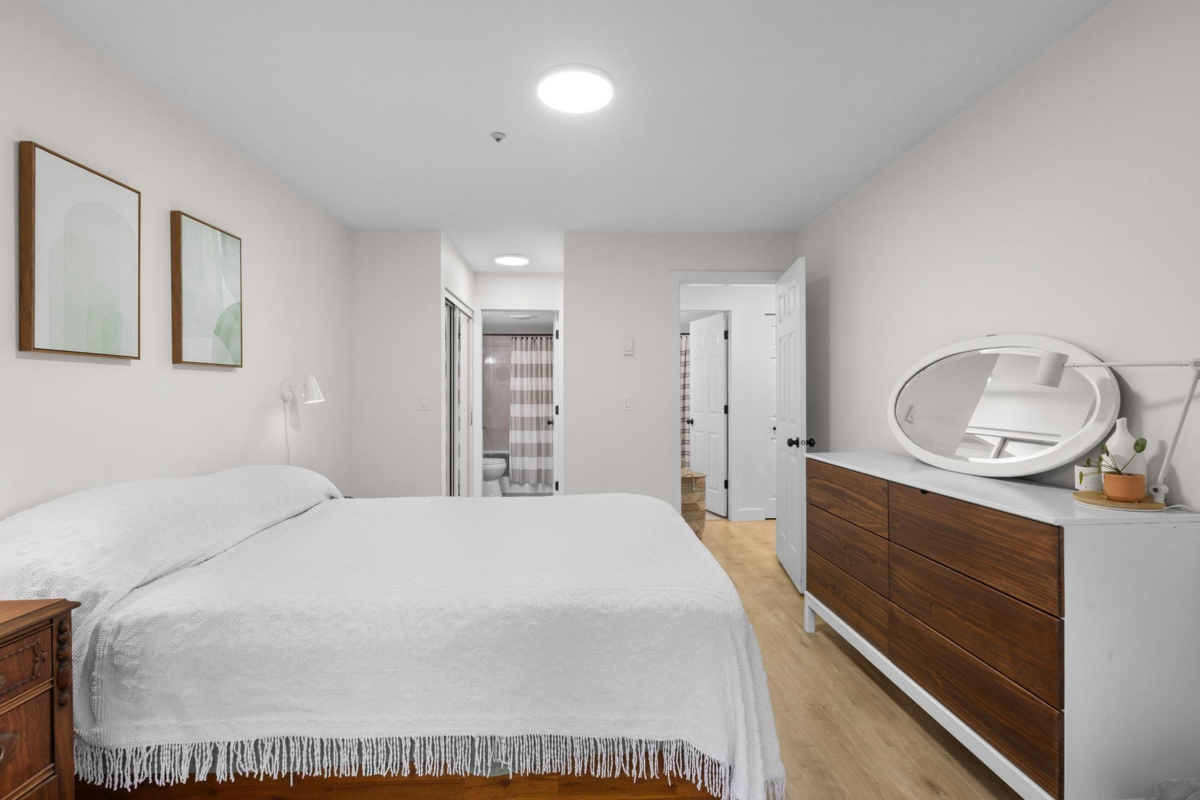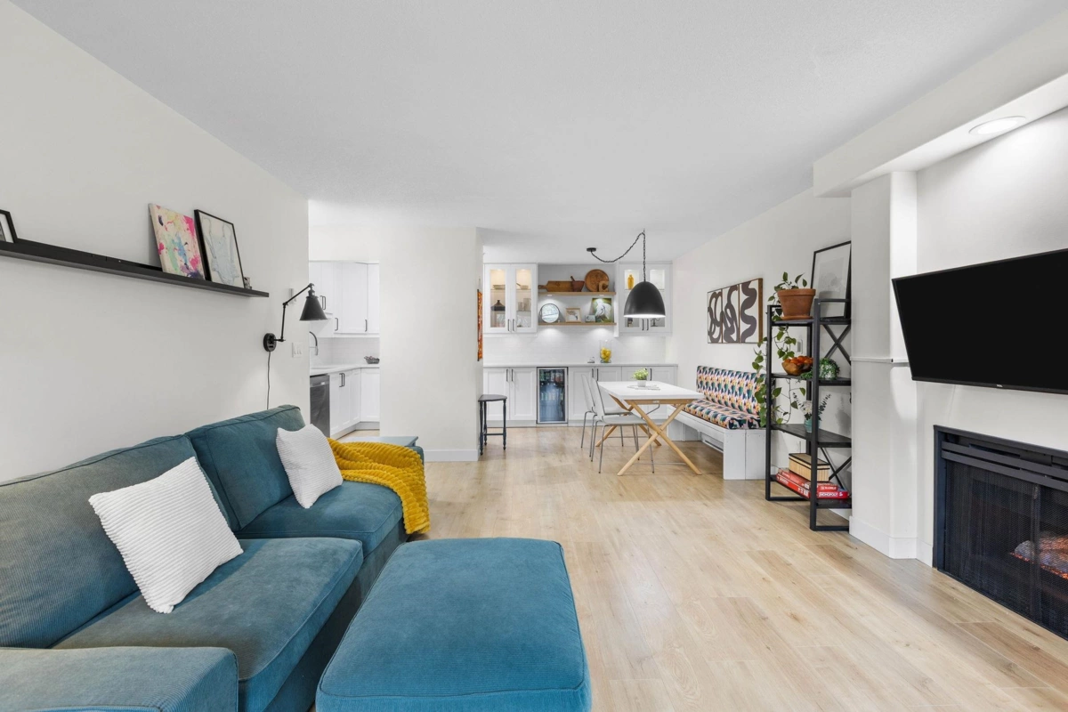 Step inside and fall in love. This bright 2 bed, 2 bath corner suite has been thoughtfully upgraded. The kitchen shines with expansive quartz counters, a custom coffee bar with floating shelves and bar fridge, sleek white shaker cabinets with soft close doors and under mount lighting, plus stainless appliances including a 4 door fridge. Oak laminate flooring and custom lighting carries through the home for a warm, elevated feel. The open living and dining space is perfect for relaxing by the gas fireplace or stepping onto your sunny south facing balcony. Enjoy views of mature trees from every room. Both bathrooms feature quartz counters and deep soaker tubs. Full size laundry adds convenience. Bonus extra street parking for your second car and a short distance to the future SkyTrain.