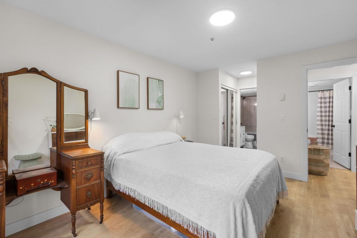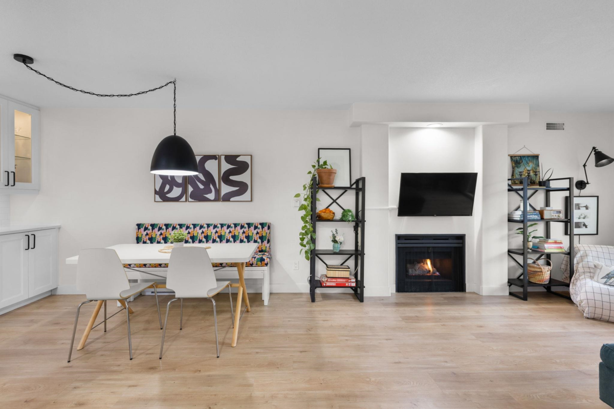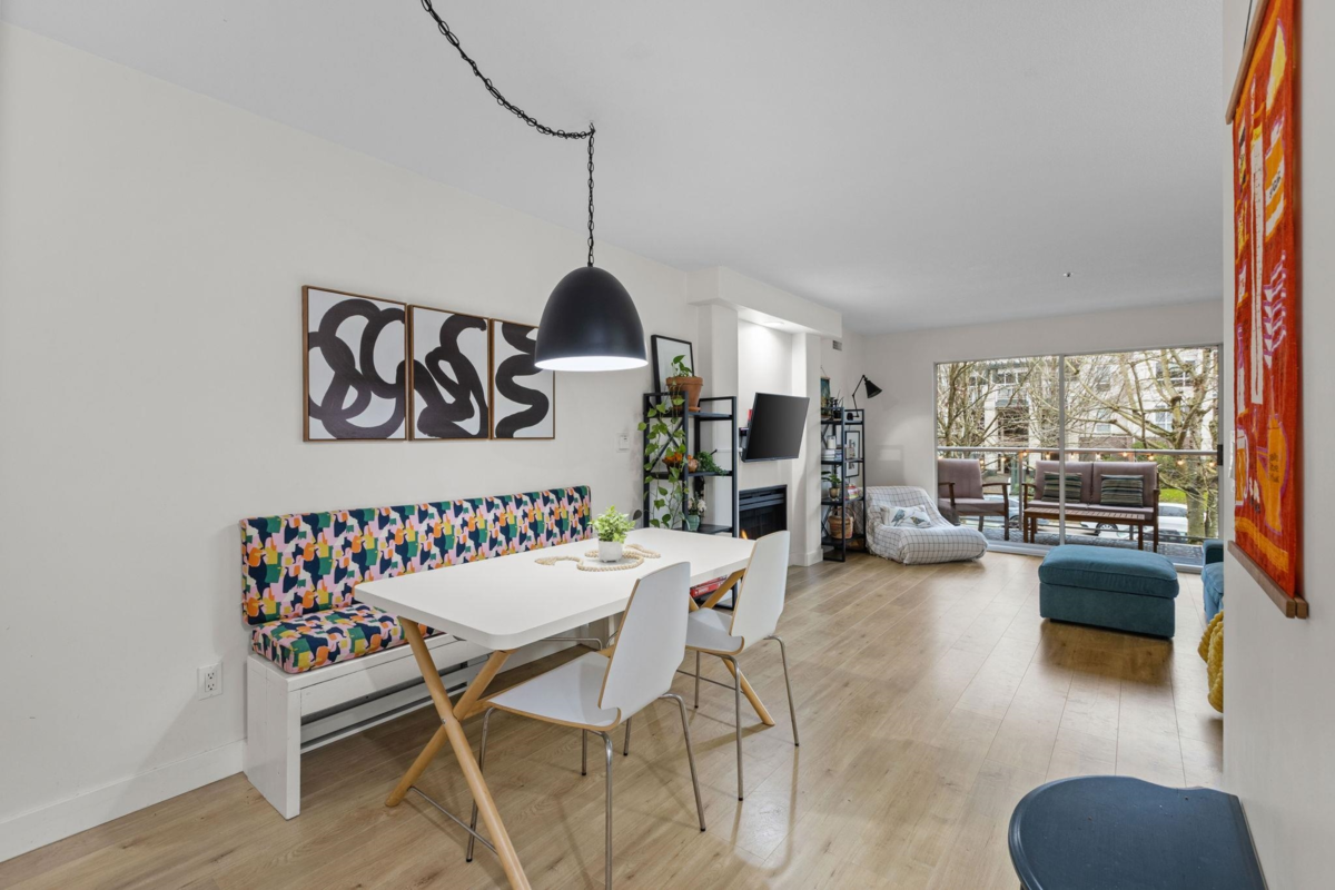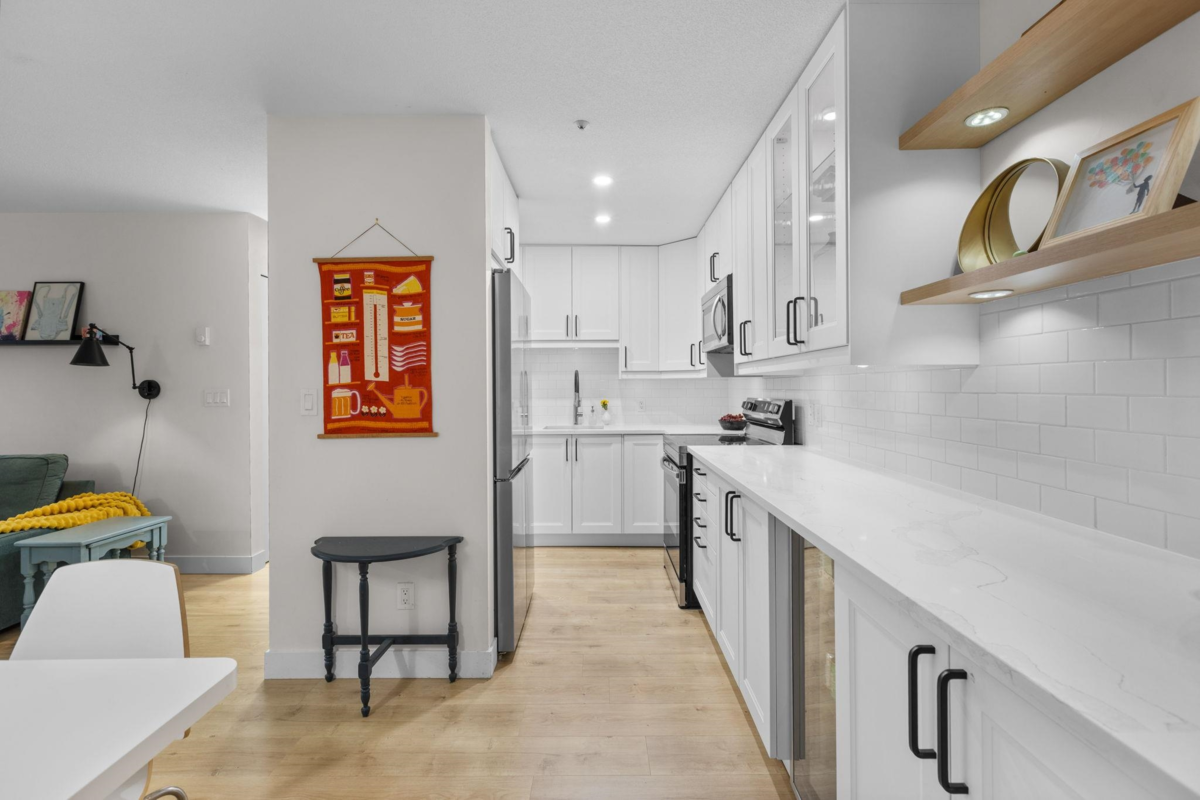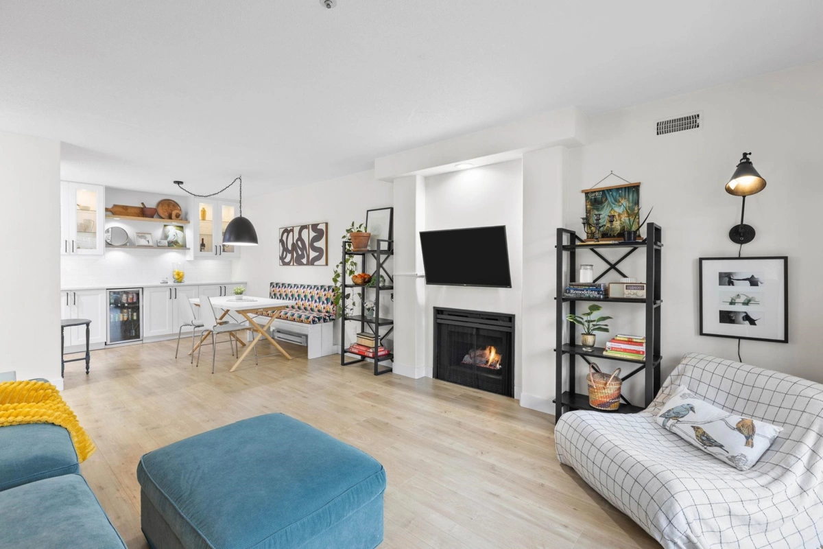 Step inside and fall in love. This bright 2 bed, 2 bath corner suite has been thoughtfully upgraded. The kitchen shines with expansive quartz counters, a custom coffee bar with floating shelves and bar fridge, sleek white shaker cabinets with soft close doors and under mount lighting, plus stainless appliances including a 4 door fridge. Oak laminate flooring and custom lighting carries through the home for a warm, elevated feel. The open living and dining space is perfect for relaxing by the gas fireplace or stepping onto your sunny south facing balcony. Enjoy views of mature trees from every room. Both bathrooms feature quartz counters and deep soaker tubs. Full size laundry adds convenience. Bonus extra street parking for your second car and a short distance to the future SkyTrain.