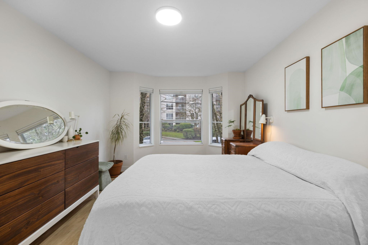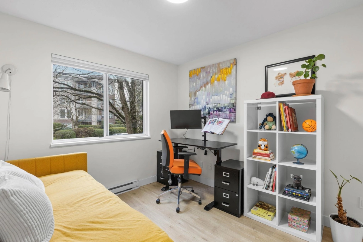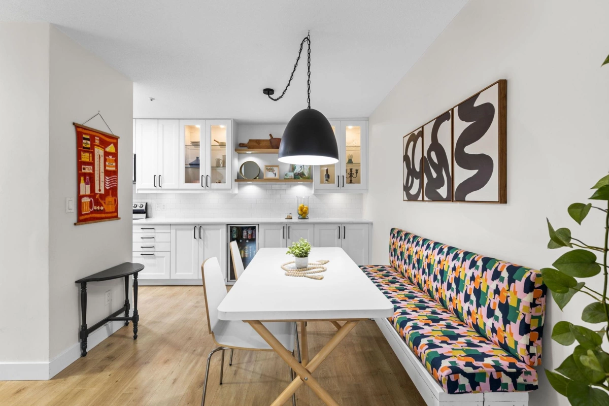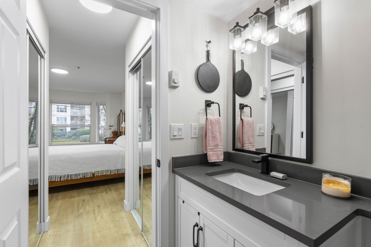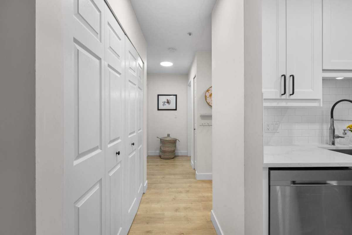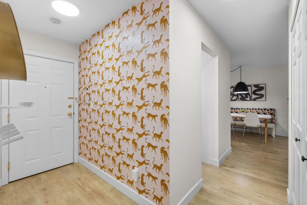 Step inside and fall in love. This bright 2 bed, 2 bath corner suite has been thoughtfully upgraded. The kitchen shines with expansive quartz counters, a custom coffee bar with floating shelves and bar fridge, sleek white shaker cabinets with soft close doors and under mount lighting, plus stainless appliances including a 4 door fridge. Oak laminate flooring and custom lighting carries through the home for a warm, elevated feel. The open living and dining space is perfect for relaxing by the gas fireplace or stepping onto your sunny south facing balcony. Enjoy views of mature trees from every room. Both bathrooms feature quartz counters and deep soaker tubs. Full size laundry adds convenience. Bonus extra street parking for your second car and a short distance to the future SkyTrain.