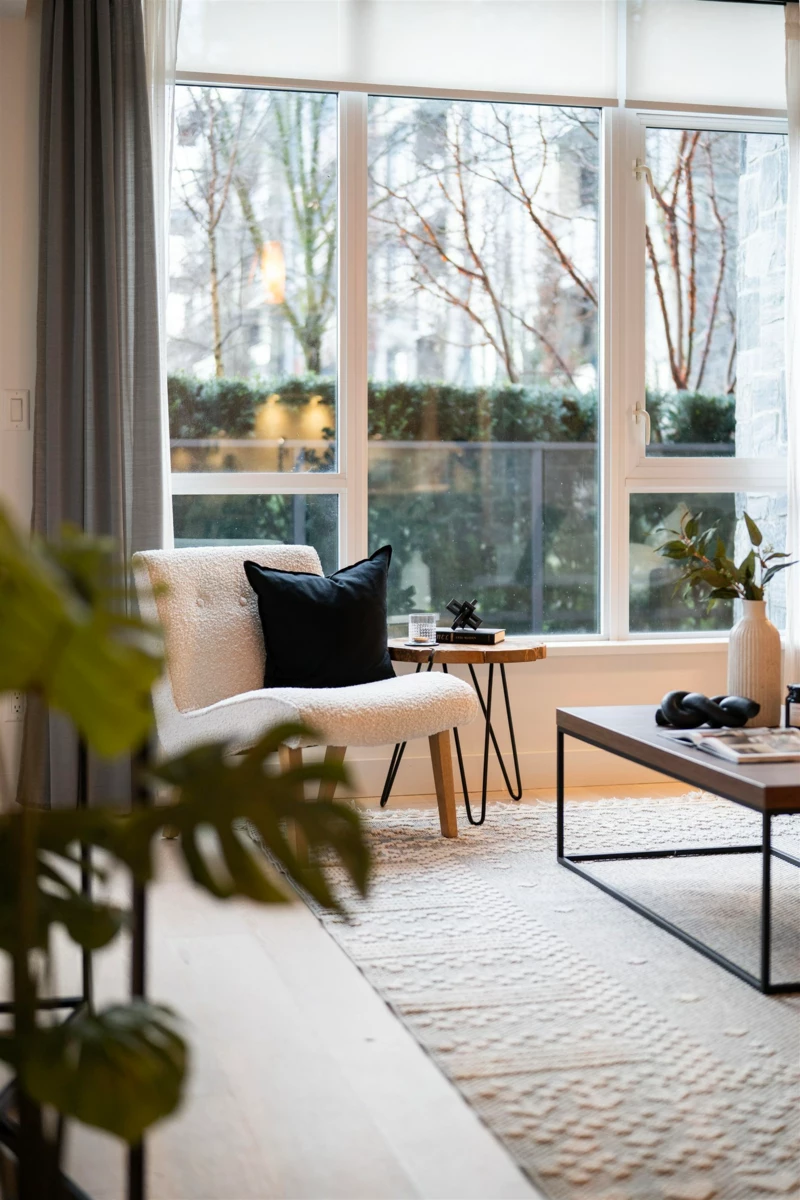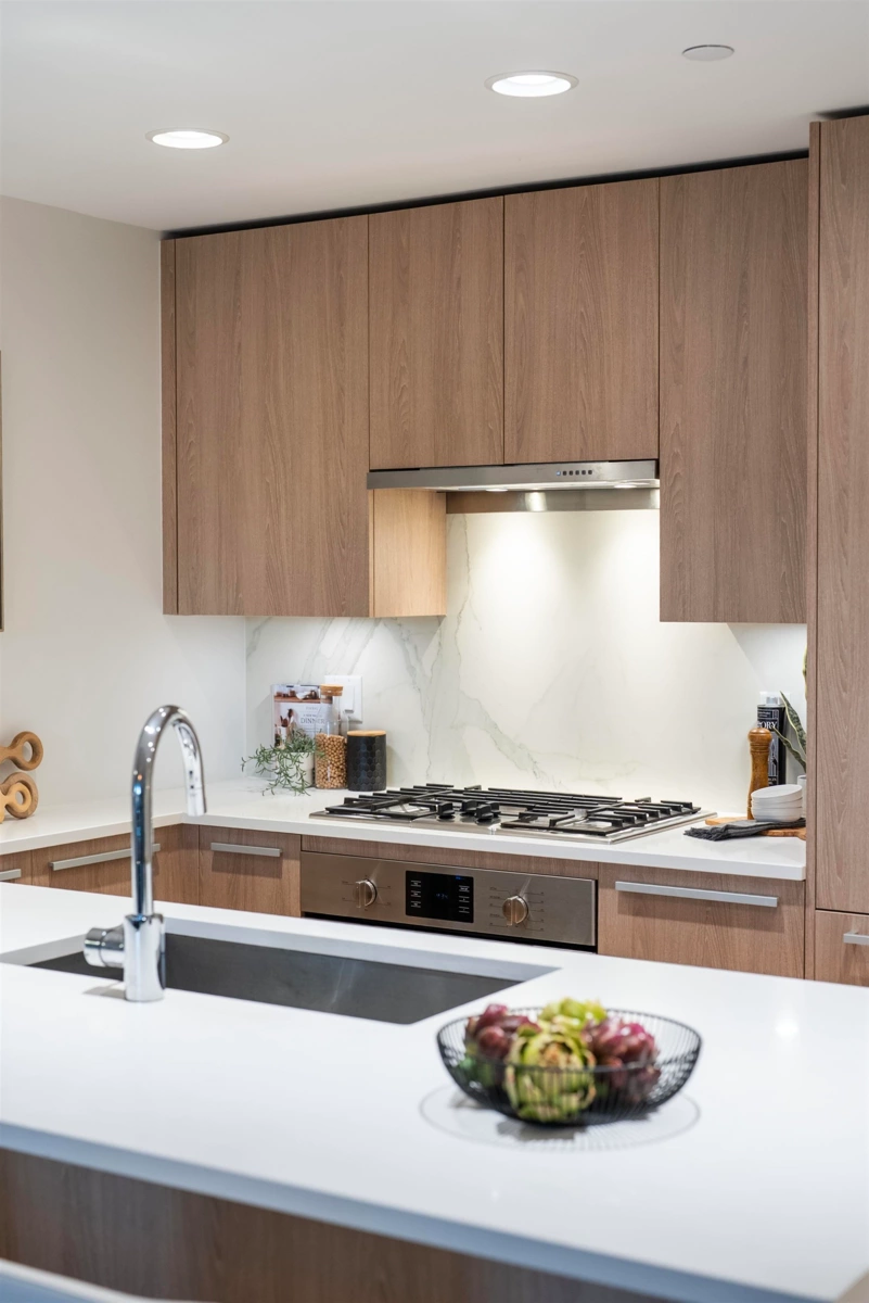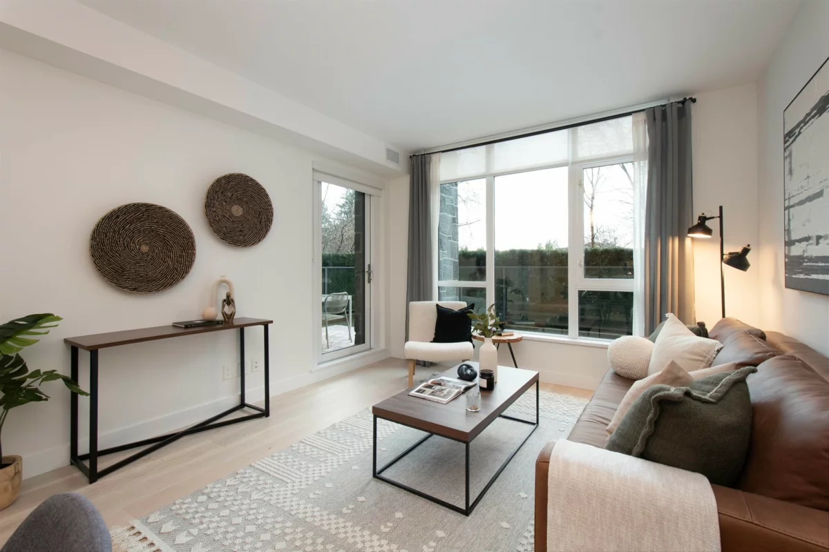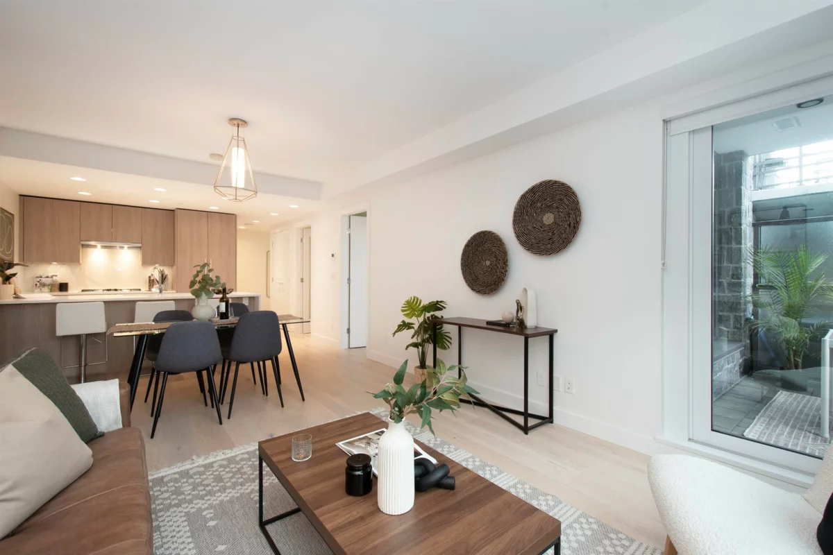 A rare ground-level home designed for everyday living in the heart of Lynn Valley! This 2 bed + den, 2 bath at the Residences by Bosa offers nearly 1,100 sqft of bright, open-concept living. The well-appointed kitchen features breakfast bar, stainless steel appliances, gas stove—ideal for entertaining. The primary bedroom includes a spacious ensuite, while the second bedroom & full bath are well suited for guests or family. A separate den provides flexibility for home office or creative use. The large, private patio is perfect for indoor-outdoor living! Concrete construction with air conditioning for quiet & year-round comfort. 2 parking stalls, storage locker, gym access, and pet friendly! Walk to Lynn Valley Village shops, cafés, services, trails, parks, and schools. Call today to view!