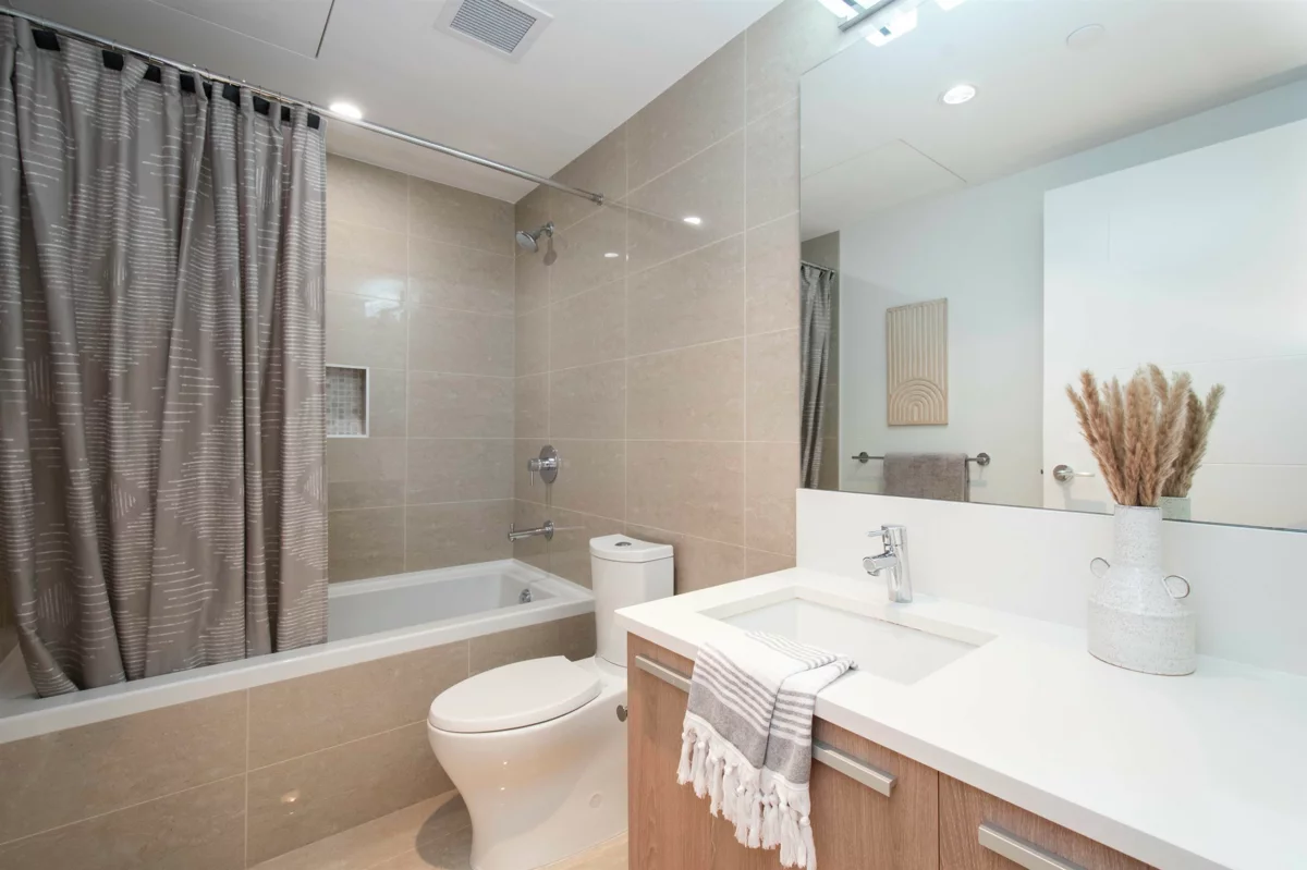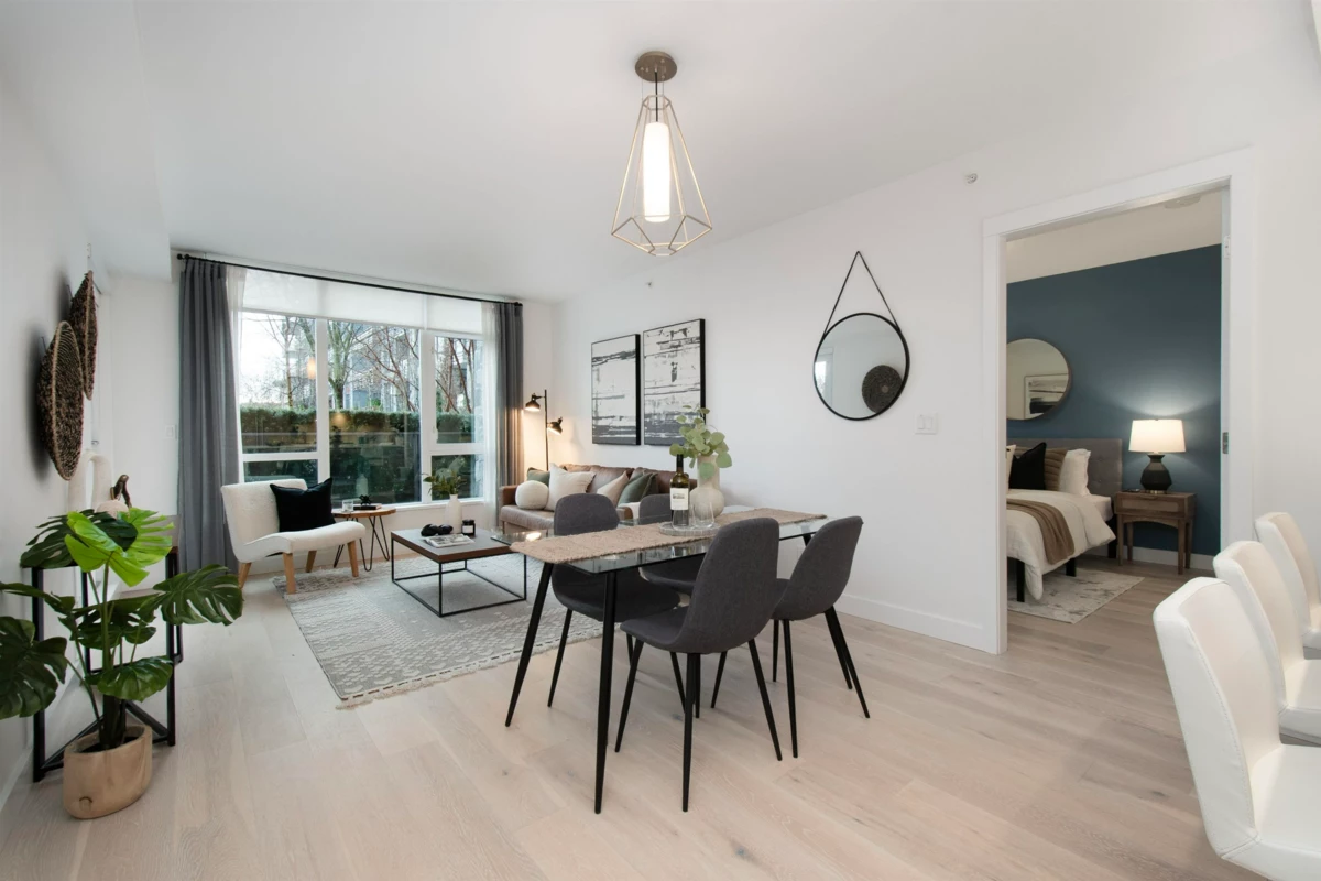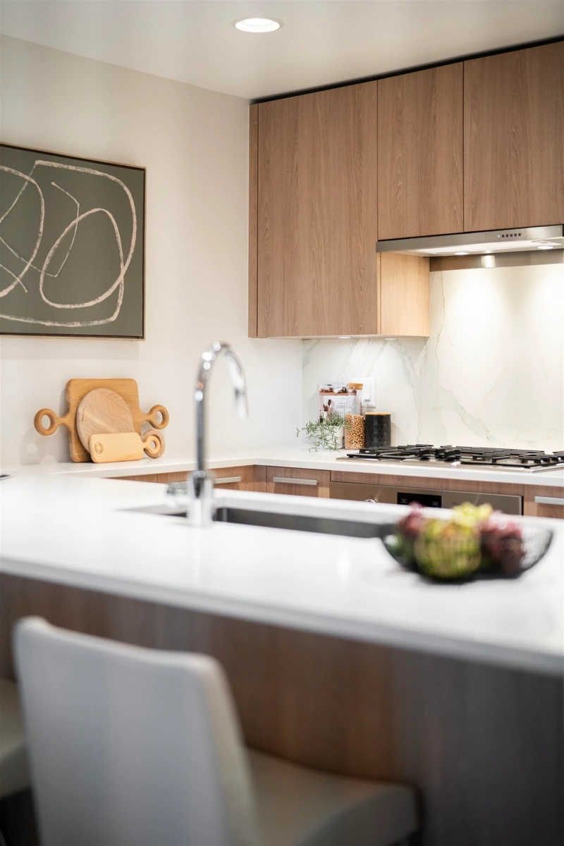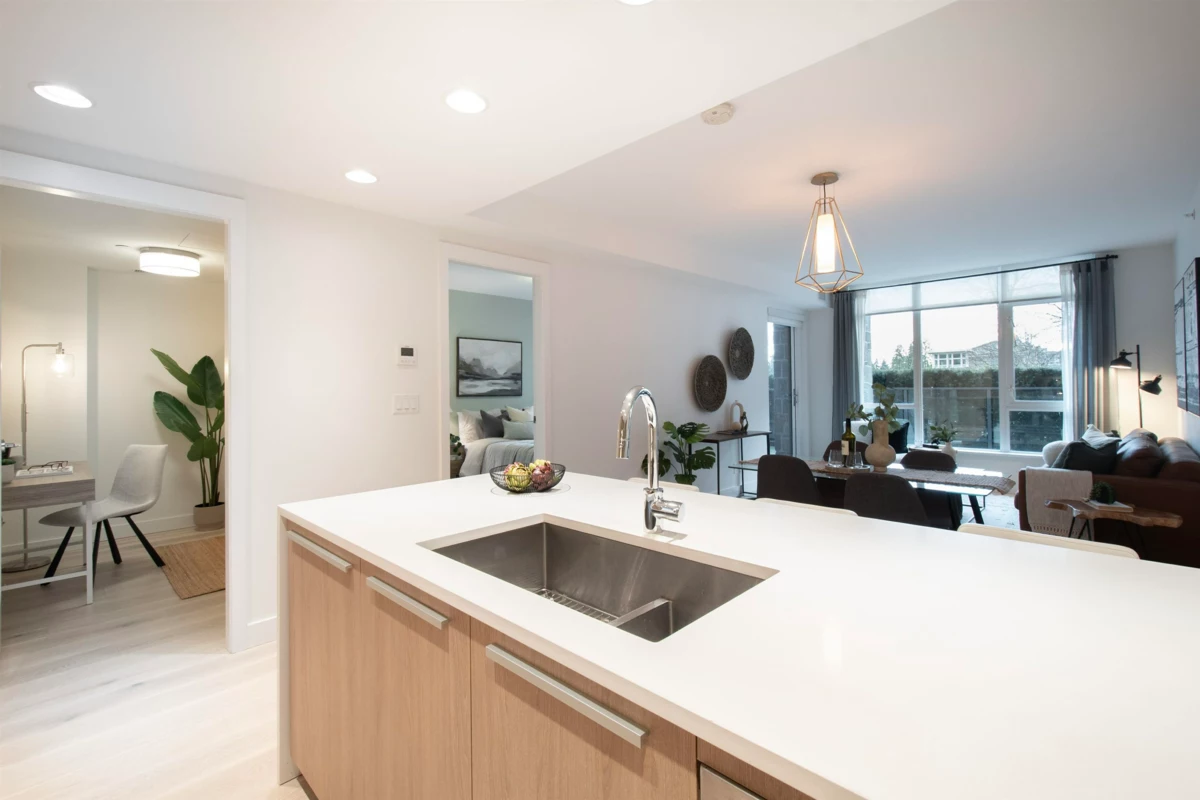 A rare ground-level home designed for everyday living in the heart of Lynn Valley! This 2 bed + den, 2 bath at the Residences by Bosa offers nearly 1,100 sqft of bright, open-concept living. The well-appointed kitchen features breakfast bar, stainless steel appliances, gas stove—ideal for entertaining. The primary bedroom includes a spacious ensuite, while the second bedroom & full bath are well suited for guests or family. A separate den provides flexibility for home office or creative use. The large, private patio is perfect for indoor-outdoor living! Concrete construction with air conditioning for quiet & year-round comfort. 2 parking stalls, storage locker, gym access, and pet friendly! Walk to Lynn Valley Village shops, cafés, services, trails, parks, and schools. Call today to view!