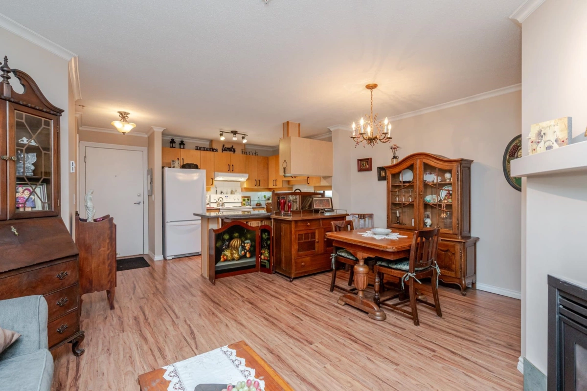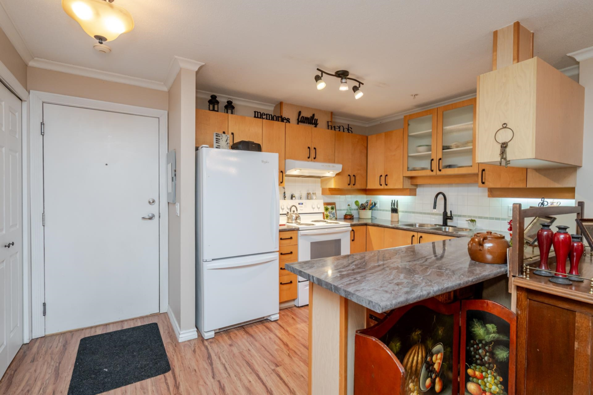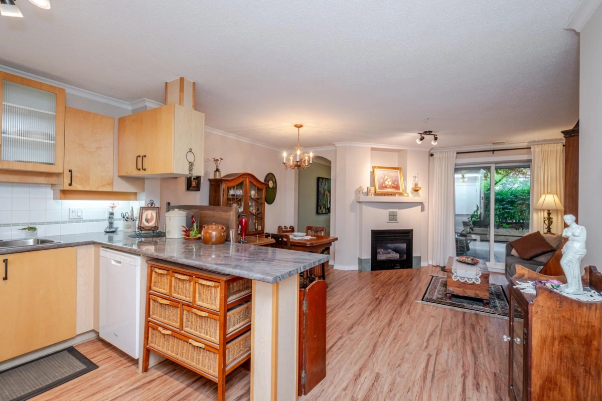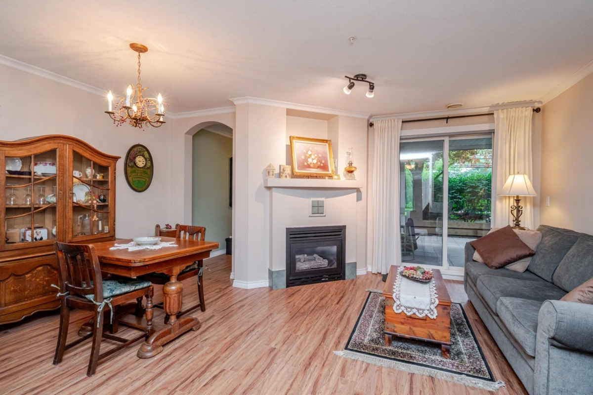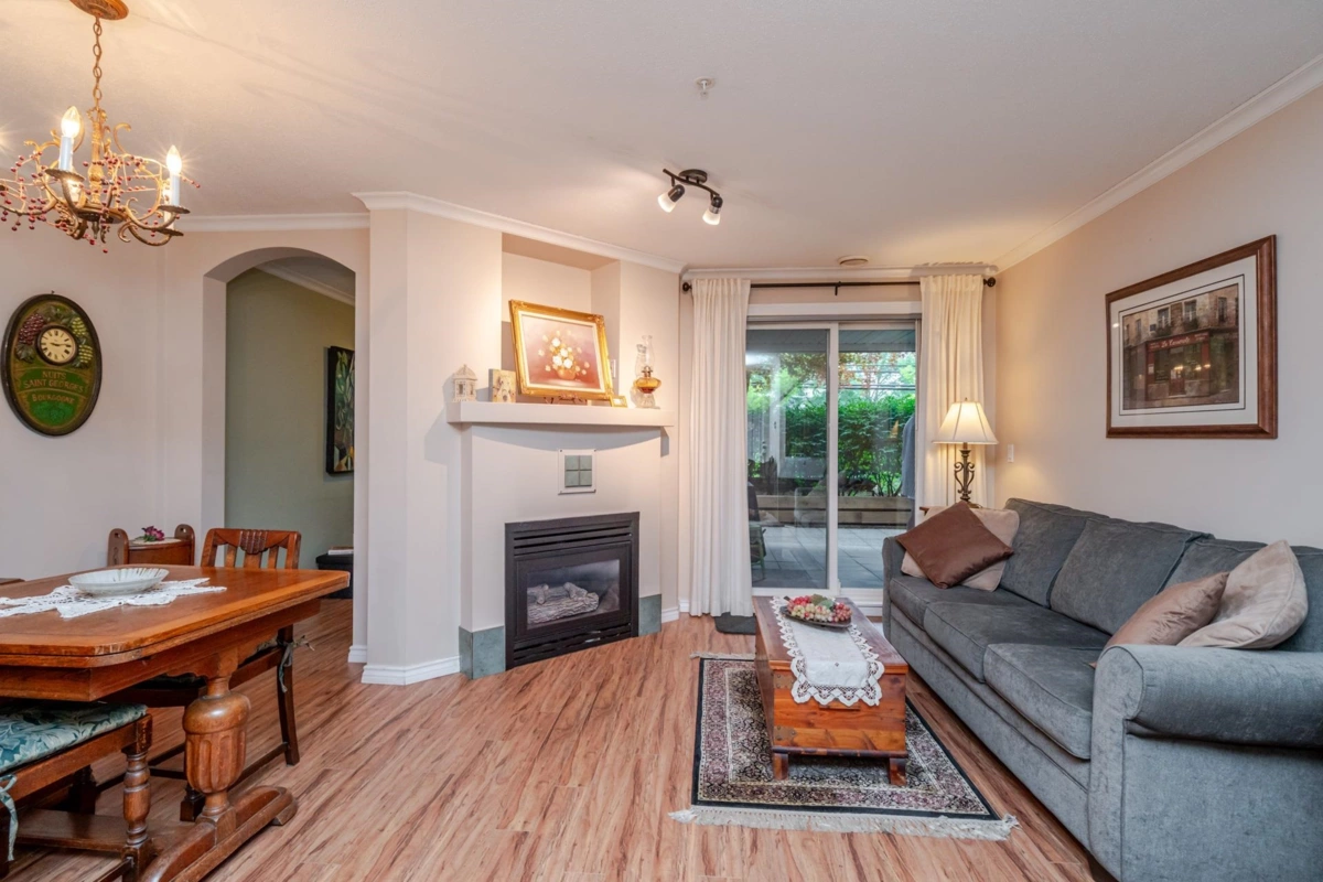 Welcome to The Davenport – a beautifully updated 1 bed + den home with secure ground-level parking! This suite features LED track lighting, crown moulding, laminate flooring with tile floor in the bathroom. Updated kitchen counters, wrought iron hardware, fridge, stove, d/w, washer/dryer, bthrm updates include sink, toilet, counters & faucets. Enjoy your cozy gas fireplace (yearly serviced), & in-suite laundry. Above ground unit with large private patio with green space with newly installed retaining wall. Walk to Mall, SkyTrain, transit, restaurants, & more! Gas & hot water included. Amenities: bike room, gym, storage, party room. 1 dog (max 14” shoulder) or 1 cat allowed (EXTRA BONUS is a fully fenced dog area off parking for Fido). New plumbing in building. Early possession possible!