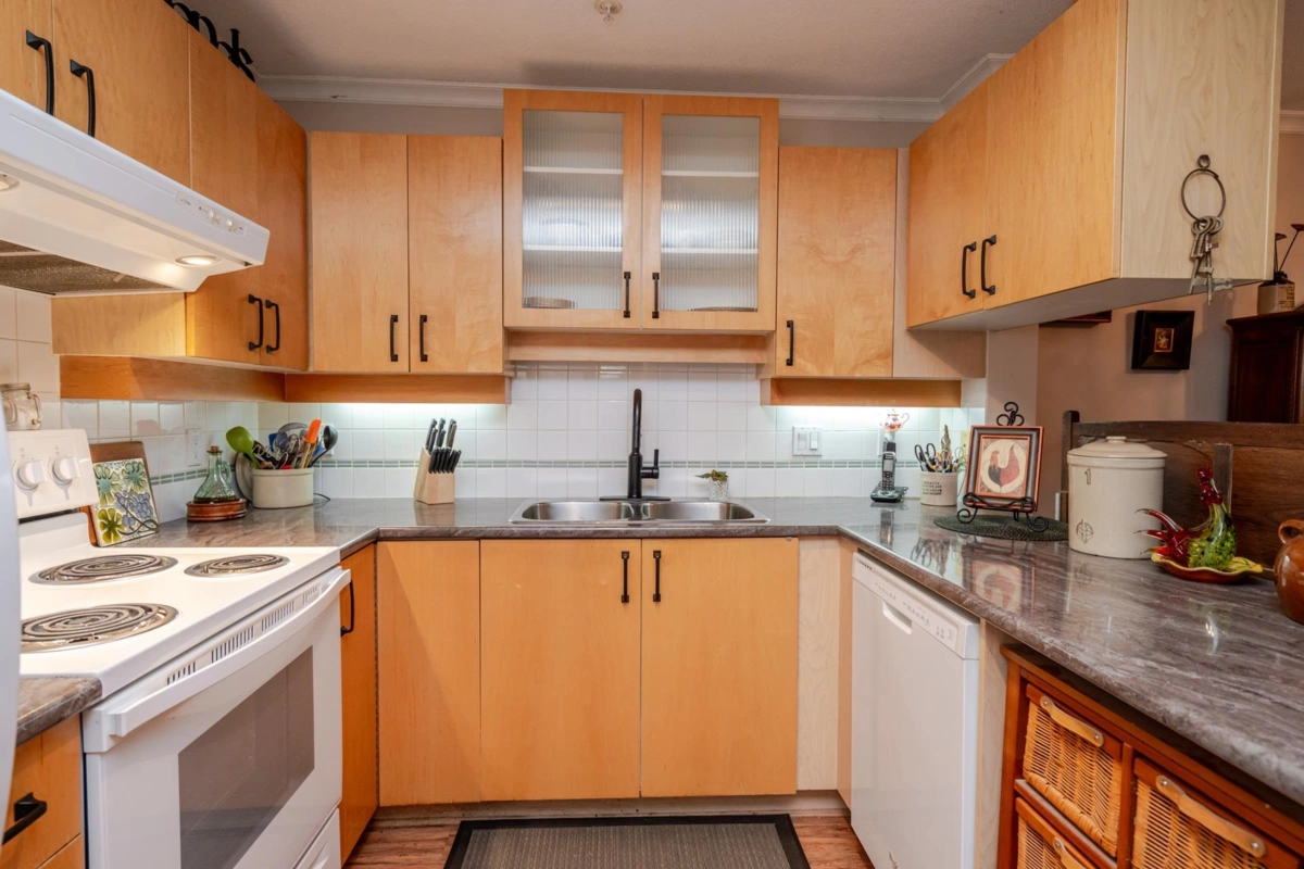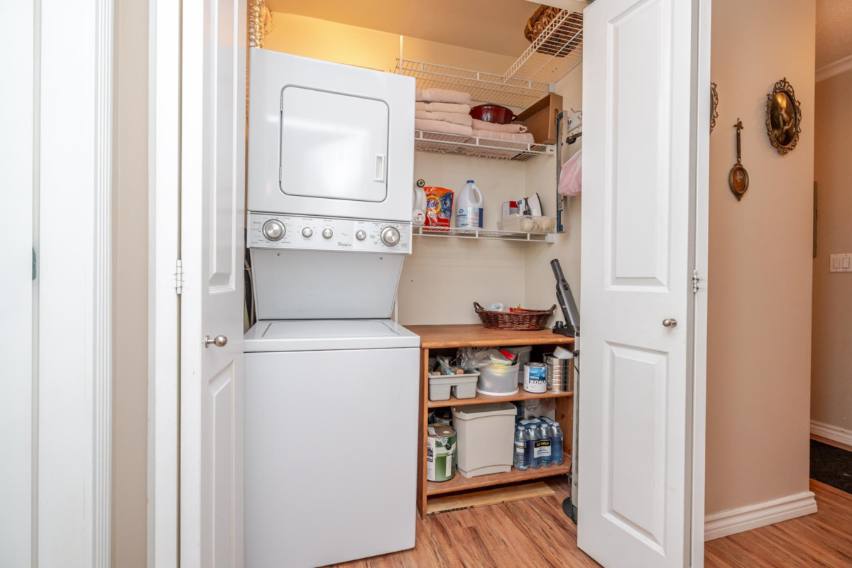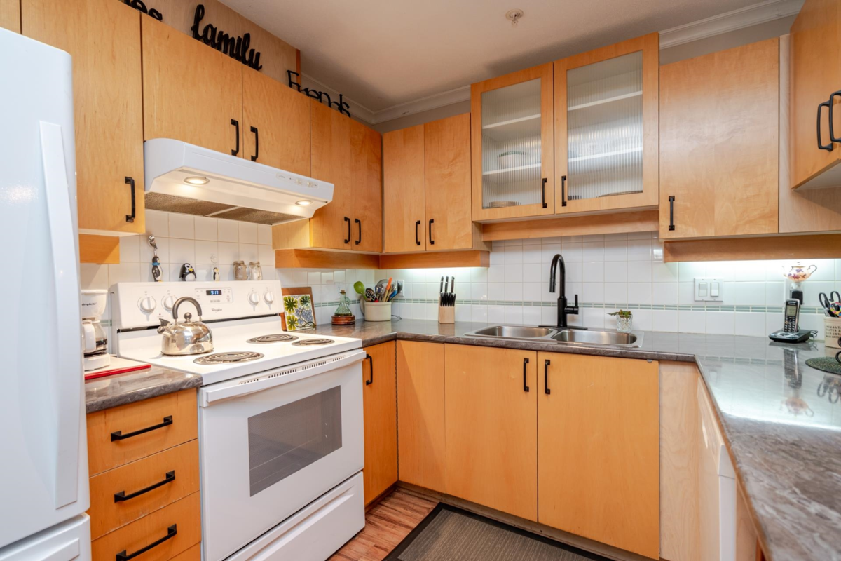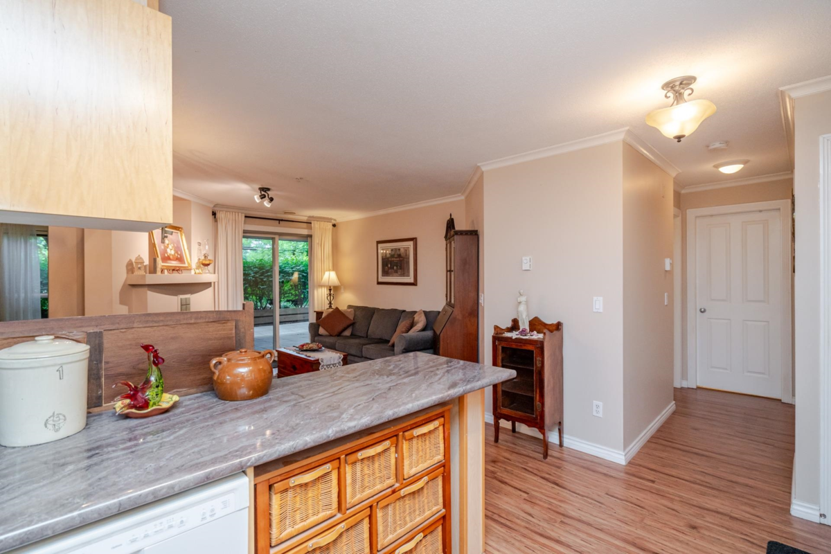Welcome to The Davenport – a beautifully updated 1 bed + den home with secure ground-level parking! This suite features LED track lighting, crown moulding, laminate flooring with tile floor in the bathroom. Updated kitchen counters, wrought iron hardware, fridge, stove, d/w, washer/dryer, bthrm updates include sink, toilet, counters & faucets. Enjoy your cozy gas fireplace (yearly serviced), & in-suite laundry. Above ground unit with large private patio with green space with newly installed retaining wall. Walk to Mall, SkyTrain, transit, restaurants, & more! Gas & hot water included. Amenities: bike room, gym, storage, party room. 1 dog (max 14” shoulder) or 1 cat allowed (EXTRA BONUS is a fully fenced dog area off parking for Fido). New plumbing in building. Early possession possible!