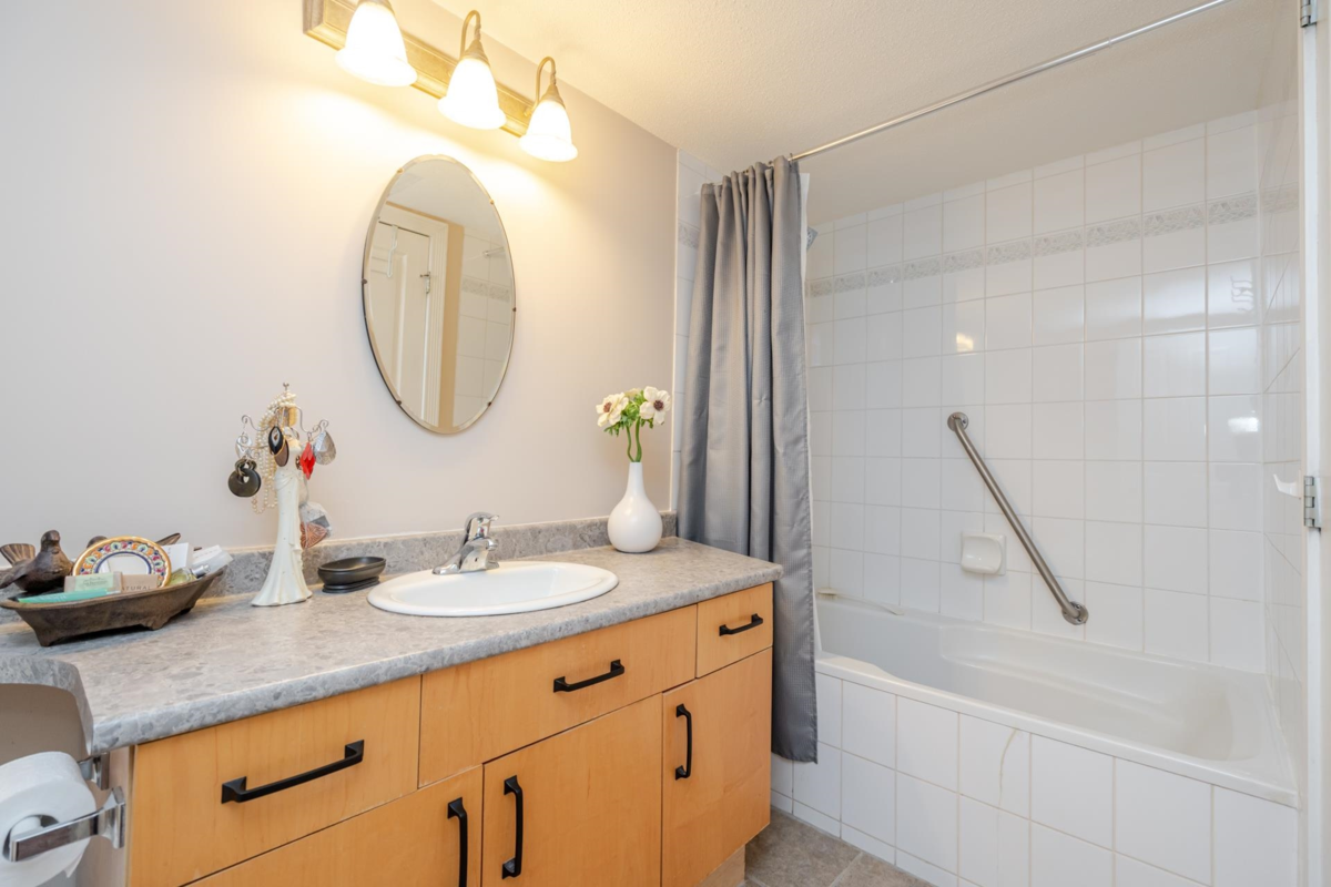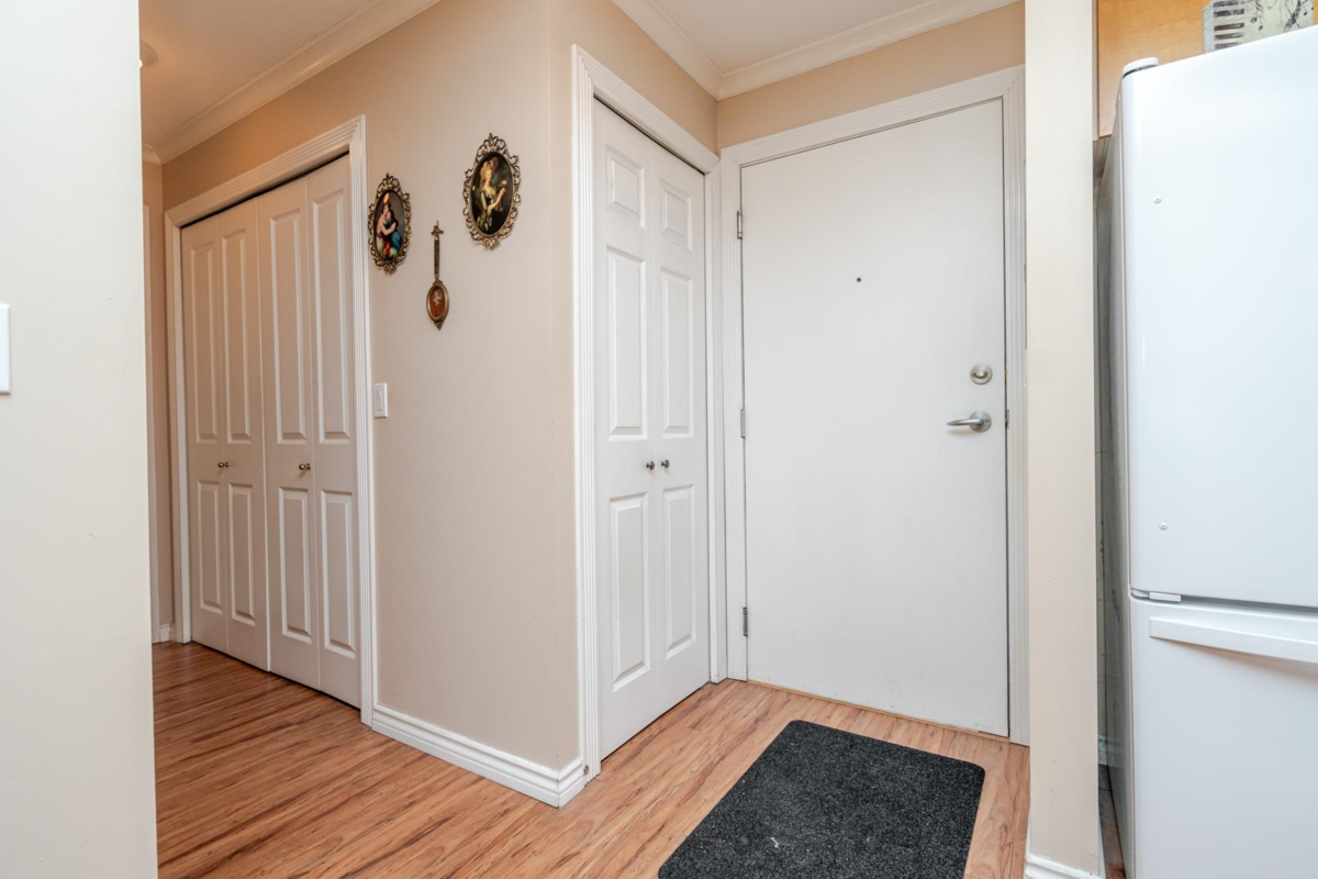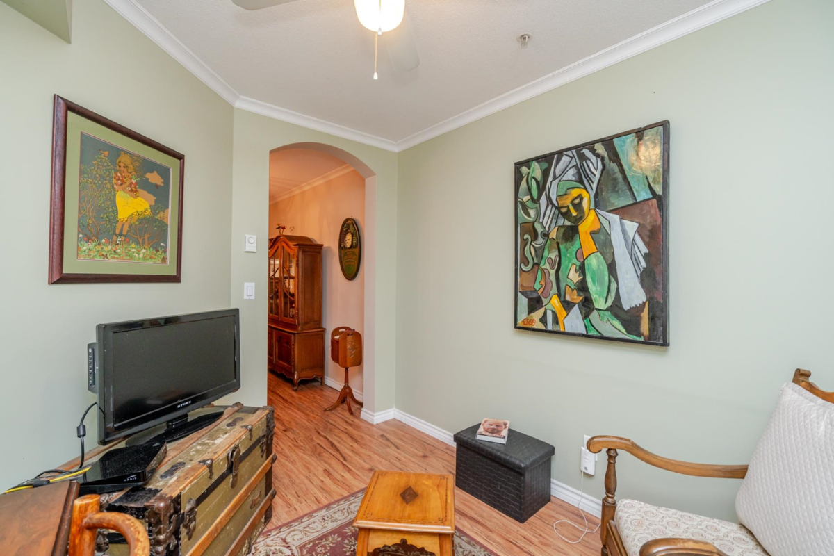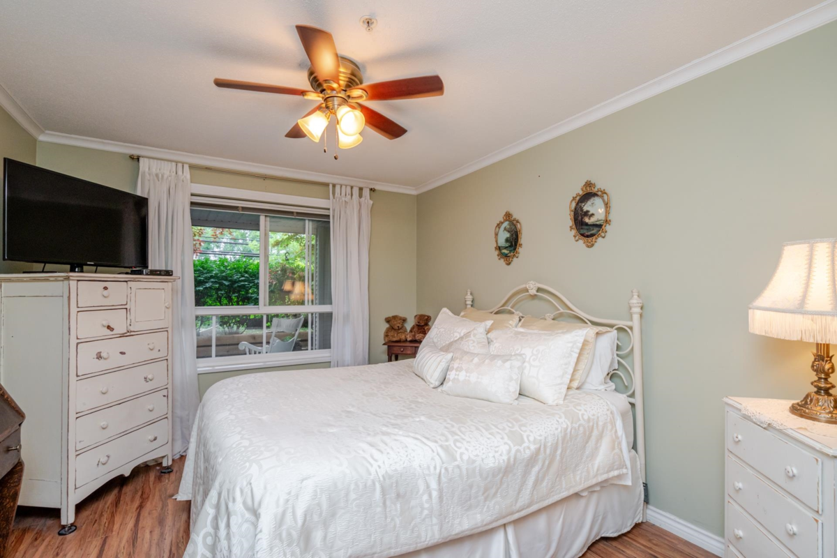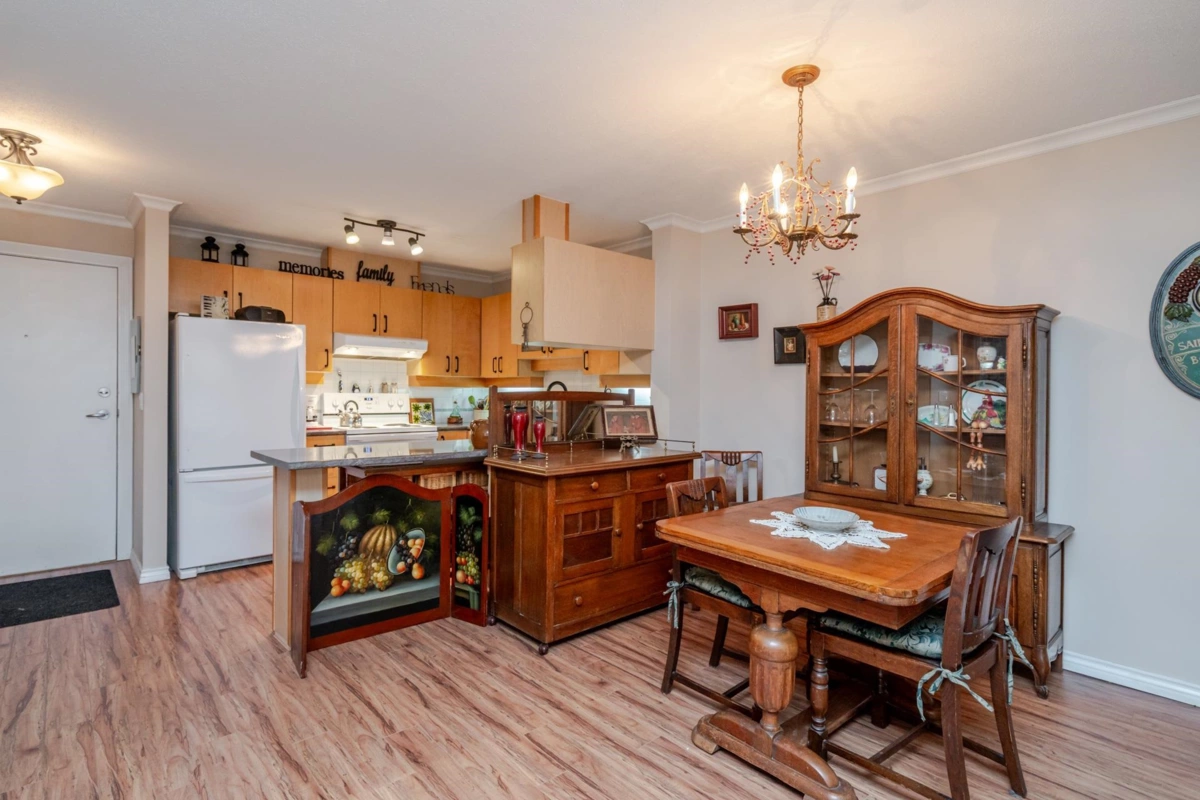 Welcome to The Davenport – a beautifully updated 1 bed + den home with secure ground-level parking! This suite features LED track lighting, crown moulding, laminate flooring with tile floor in the bathroom. Updated kitchen counters, wrought iron hardware, fridge, stove, d/w, washer/dryer, bthrm updates include sink, toilet, counters & faucets. Enjoy your cozy gas fireplace (yearly serviced), & in-suite laundry. Above ground unit with large private patio with green space with newly installed retaining wall. Walk to Mall, SkyTrain, transit, restaurants, & more! Gas & hot water included. Amenities: bike room, gym, storage, party room. 1 dog (max 14” shoulder) or 1 cat allowed (EXTRA BONUS is a fully fenced dog area off parking for Fido). New plumbing in building. Early possession possible!