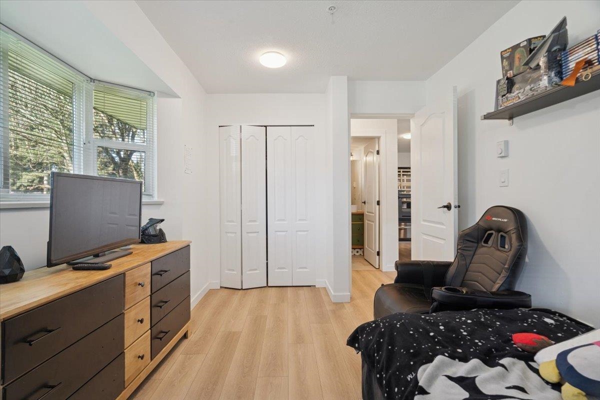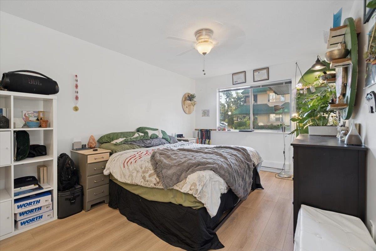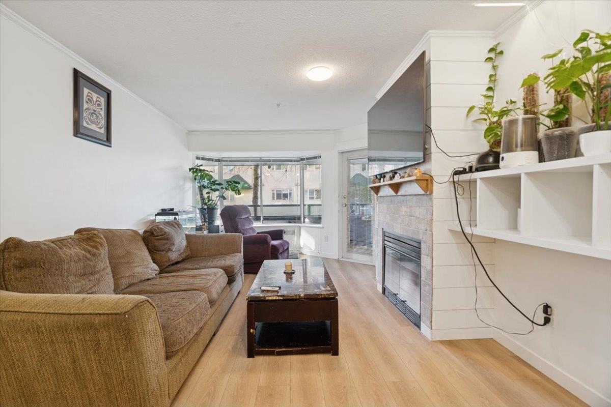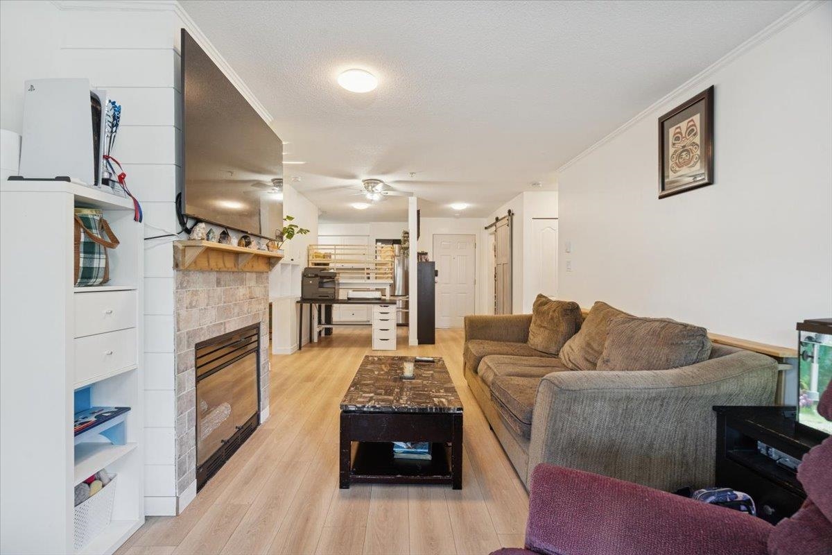 Welcome to this bright ground floor corner unit. Step inside to a thoughtfully designed layout offering great privacy, with bedrooms located on opposite sides of the home. Fresh paint throughout and new laminate flooring create a warm, welcoming feel. The open living and dining area features a cozy upgraded gas fireplace and large windows that fill the space with natural light. The kitchen offers white cabinetry, stainless steel appliances, generous counter space, and a window over the sink. The primary bedroom includes a walk through closet and private ensuite, while the second bedroom is nicely separated beside the second full bathroom. A spacious in suite laundry and storage room adds everyday convenience. Tucked into a peaceful, tree lined community with everything you need close by.
