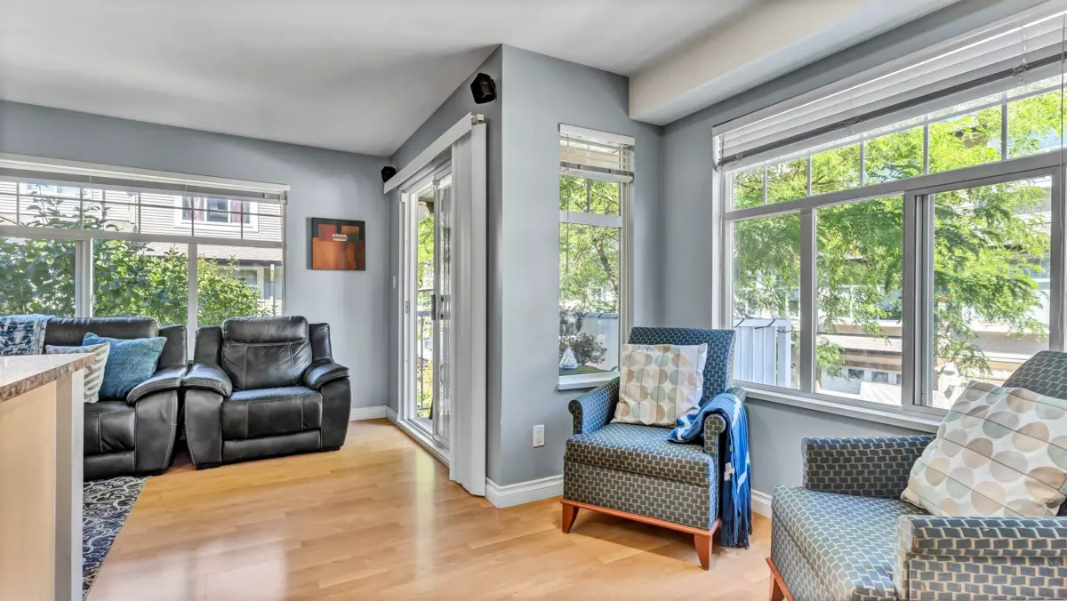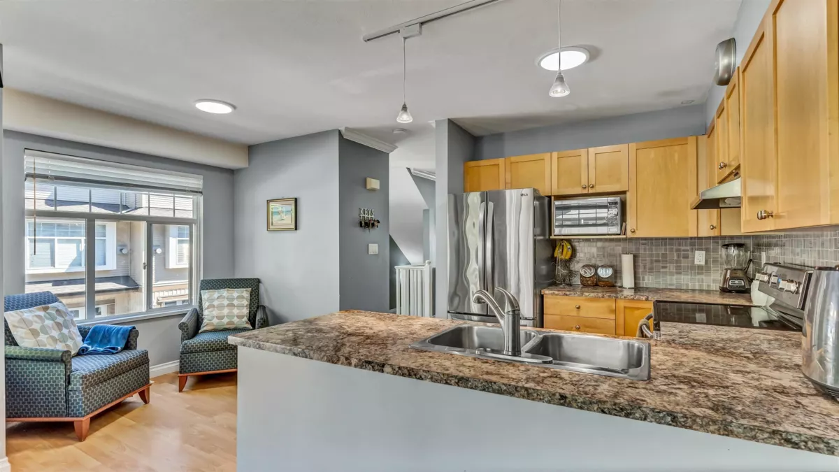 This listing is all about location. Beautifully updated end unit townhome with extra sunlight in a highly desirable central location-perfect for first-time buyers! Enjoy the ease of walkable living with Hospital, Doctor Clinics, Groceries, Coffee Shops, Restaurants, Schools, Parks, and Transit all just steps away. This bright and spacious home features stylish laminate flooring, a sleek modern Kitchen with stainless steel appliances and tile backsplash. Relax on the sunny deck or in your fully fenced private patio/yard. Roof changed in February. Located in a quiet, self-managed complex with low fees and a 2-car tandem garage, this home offers the ideal mix of comfort, value, and unbeatable convenience. By appointment only.