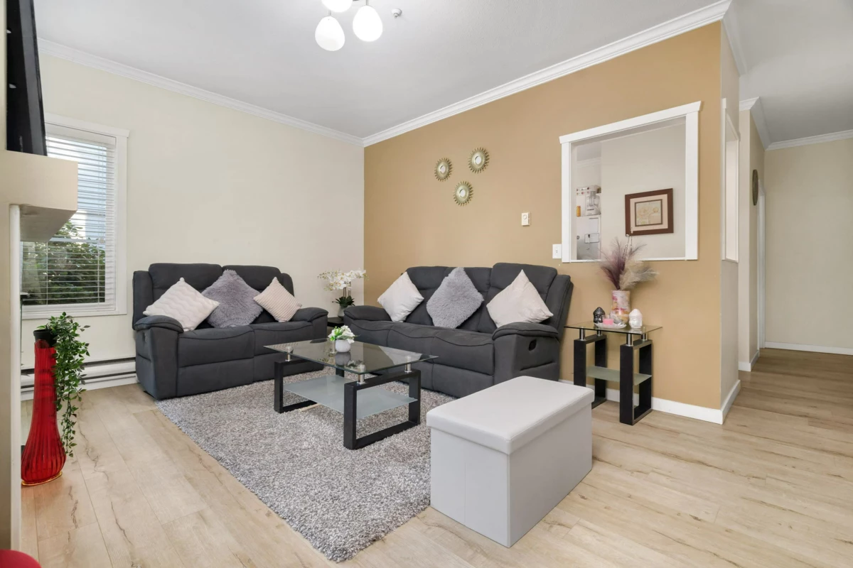 Welcome to Crestview Gardens. This freshly painted, move-in ready 2 bed, 2 full bath corner ground-level home offers nearly 1100 sq ft of bright open living space. Features include laminate flooring, quartz counters, updated cabinetry, and newer stainless steel appliances. The main bath boasts a spa-inspired walk-in shower. Enjoy excellent natural light, added privacy, and a spacious patio ideal for relaxing or entertaining. Storage is conveniently located just steps from the unit. Includes 2 parking stalls, with hot water included in strata fee. Just 2 blocks to SkyTrain, shopping, dining & recreation. Central, convenient & stylish—book your showing today!