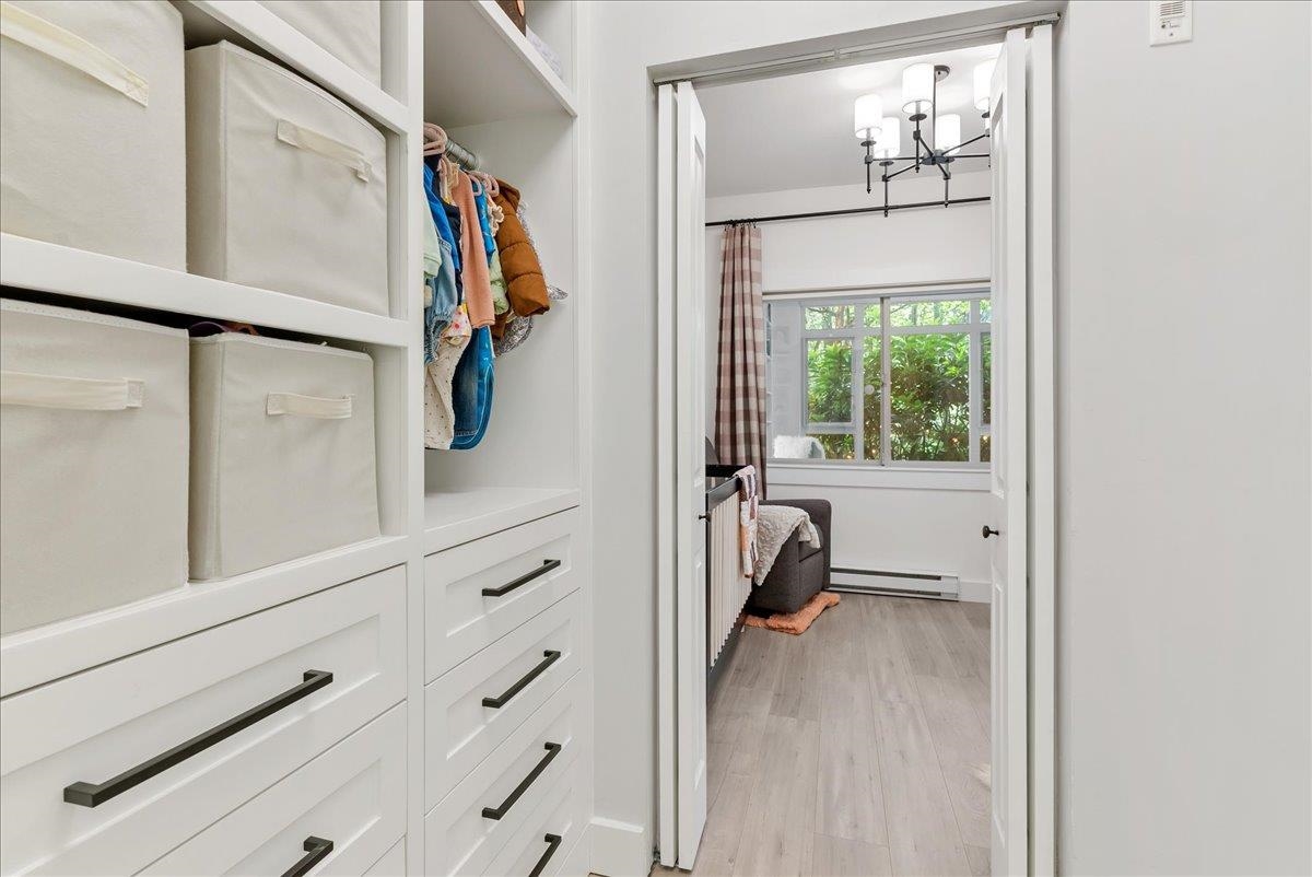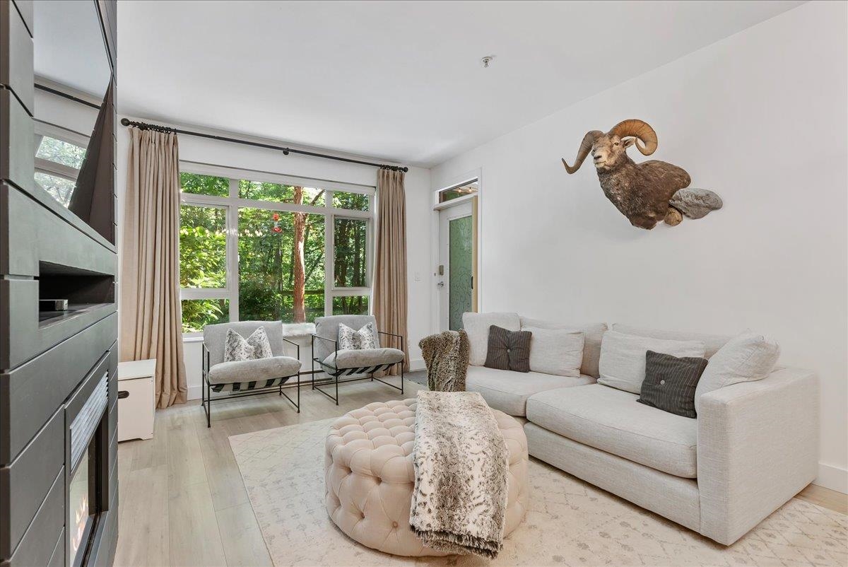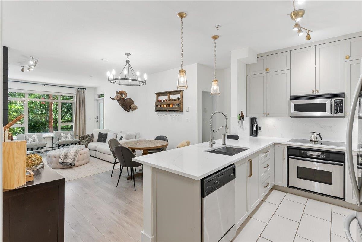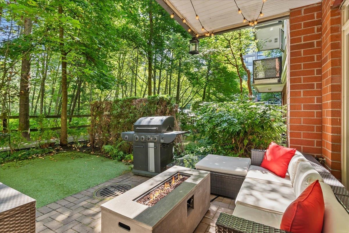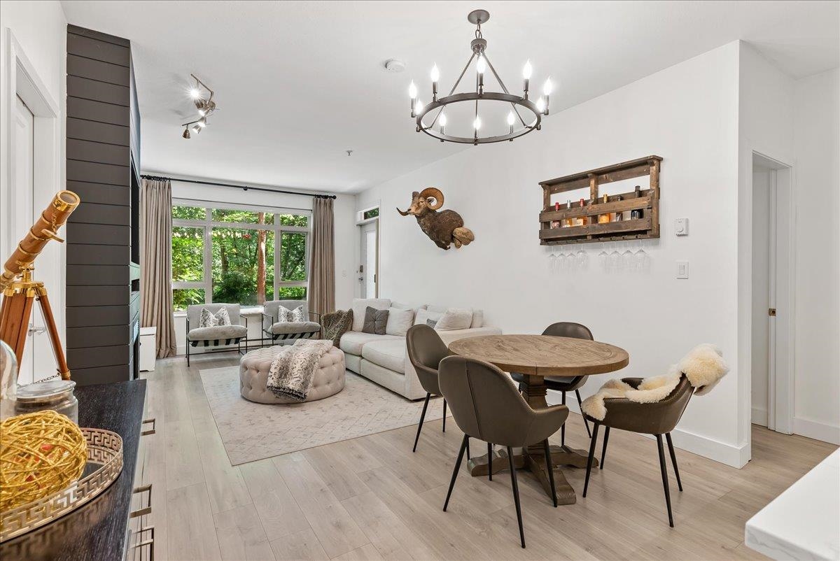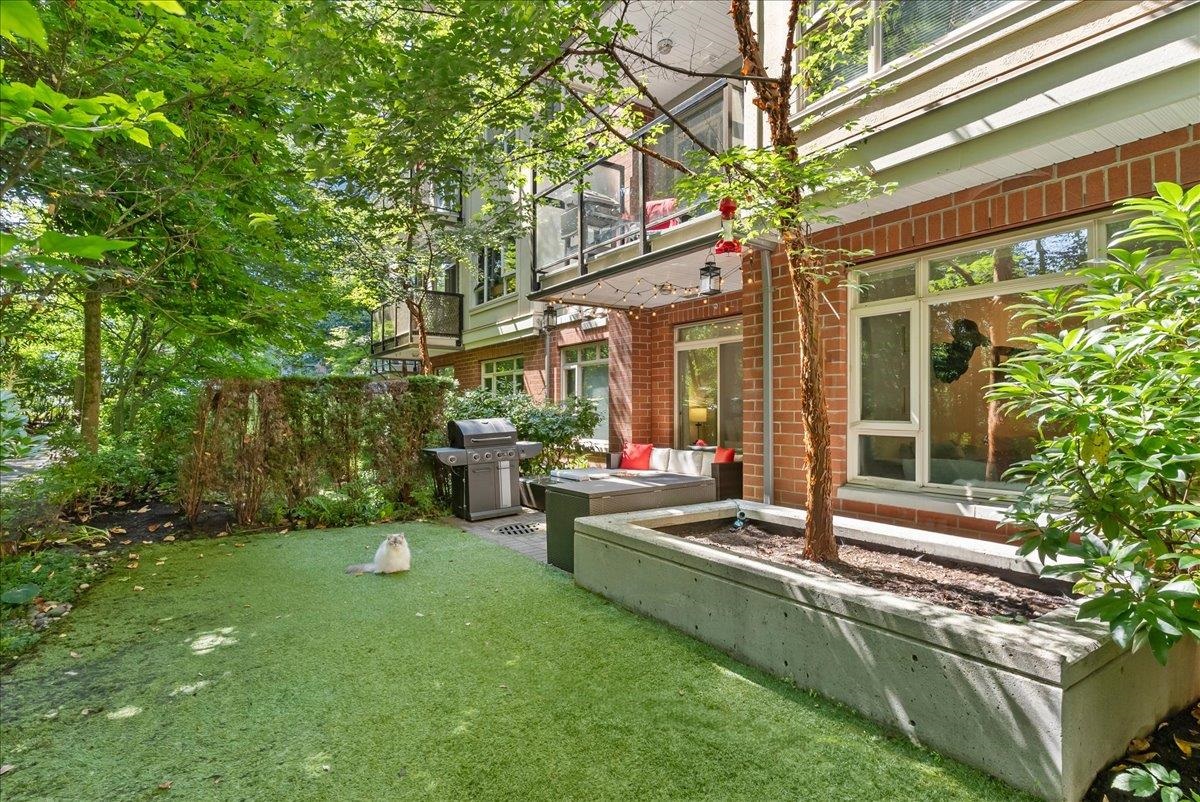 Welcome to Suter Brook! 2 Bed + Den Ground Floor Home in highly desirable area of Port Moody! Beautifully updated kitchen cabinets, quartz countertops, stainless steel appliances, laminate flooring, custom fireplace, custom closets in both bedrooms with tons of storage and fresh paint throughout. Step out to your private fenced yard enjoying an evening by the Firepit and grilling on the BBQ or head out for a walk on the connected Trail. Steps to Suter Brook Village which offers a Grocery Store, Restaurants, Shops, Banks, Gym & Coffee Shops. Also walking distance to Rocky Point Park, Breweries, Newport Village and Skytrain. Building amenities include Fitness Center, Guest Suites and Party Room. 2 Parking (Tandem) & 1 Storage Locker Included.