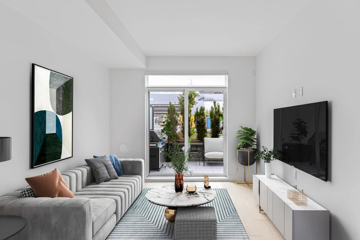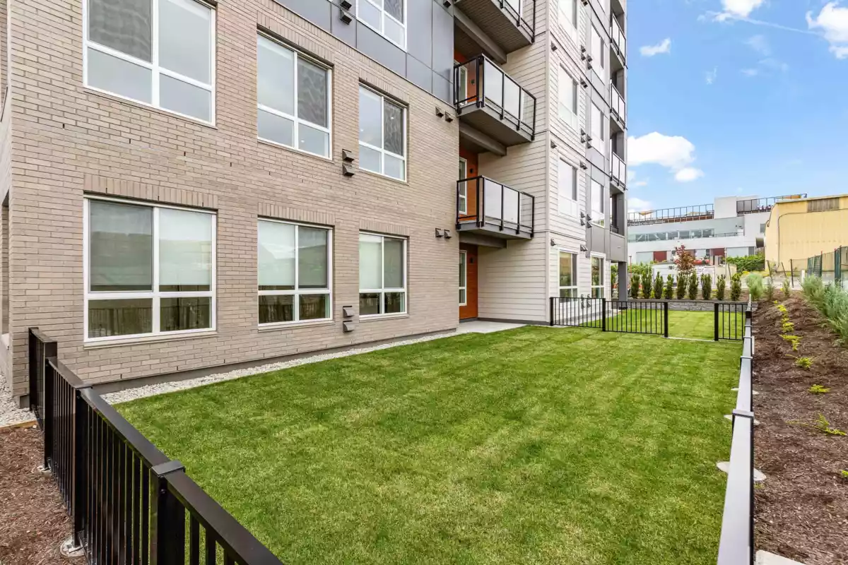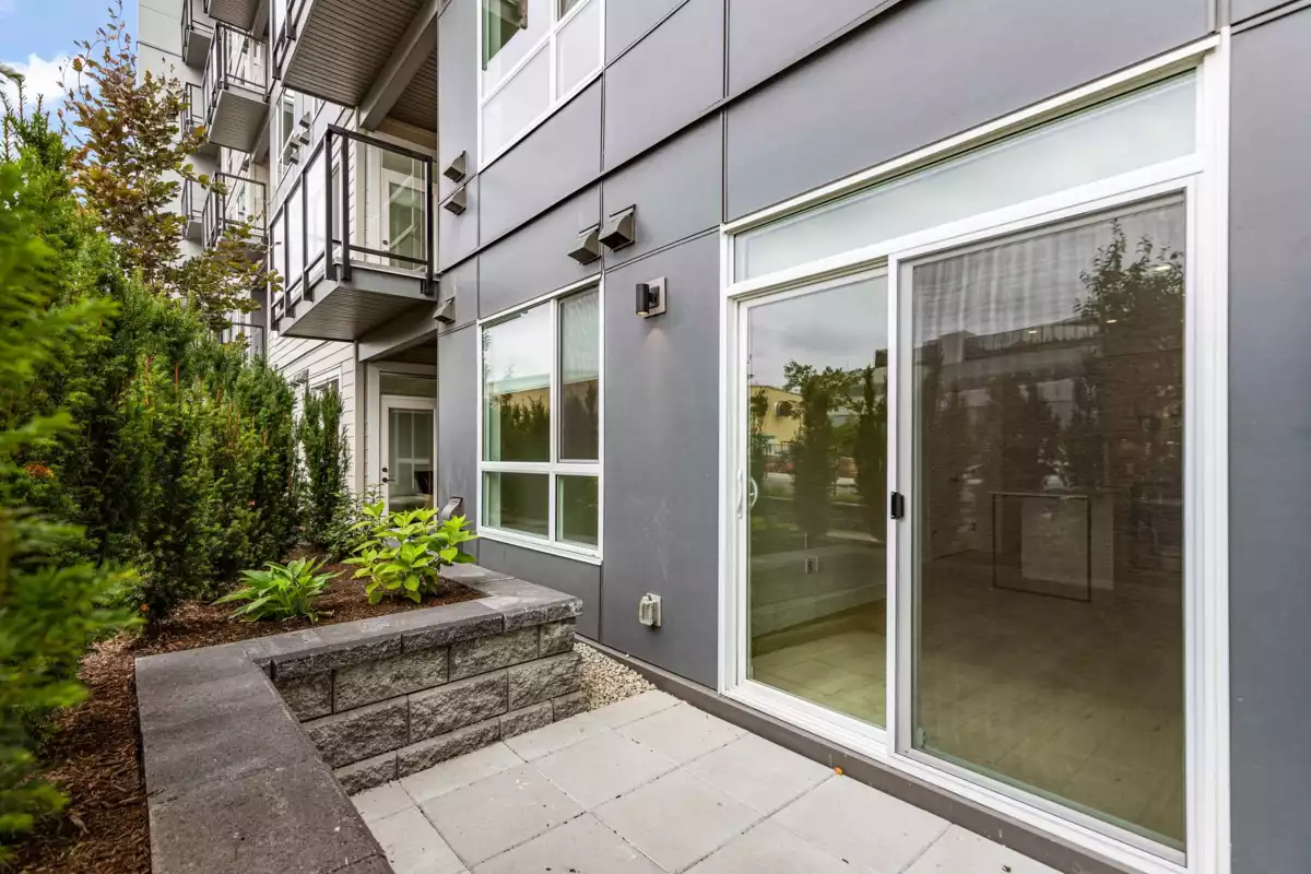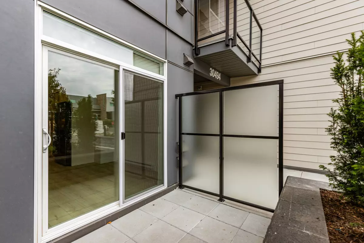 GARDEN WALKOUT OASIS! Welcome home to a stunning, newly built & move-in ready ground level home in highly anticipated HIGHSTREET VILLAGE. Rare chance to skip the presale process, enjoy your home today. SPACE! Spacious, functional 602t home boasts 9ft ceilings, bright+airy living, 1 bedroom w/expansive walk-in closet & functional den/office/nursery, dream kitchen, built-in storage solutions. CONVENIENCE! Step onto your patio, into town without the elevator. Enjoy green backdrop throughout! QUALITY! Luxury built by AB Wall Group, w/2-5-10 warranty. Bonus huge storage locker aside parking. LOCATION! Incredible position in Abbotsford's most Westerly setting minutes to Langley. WALKSCORE! Steps to Highstreet Shopping Mall, restaurants, daycare, at foot of the HWY! Airport a few minutes away!