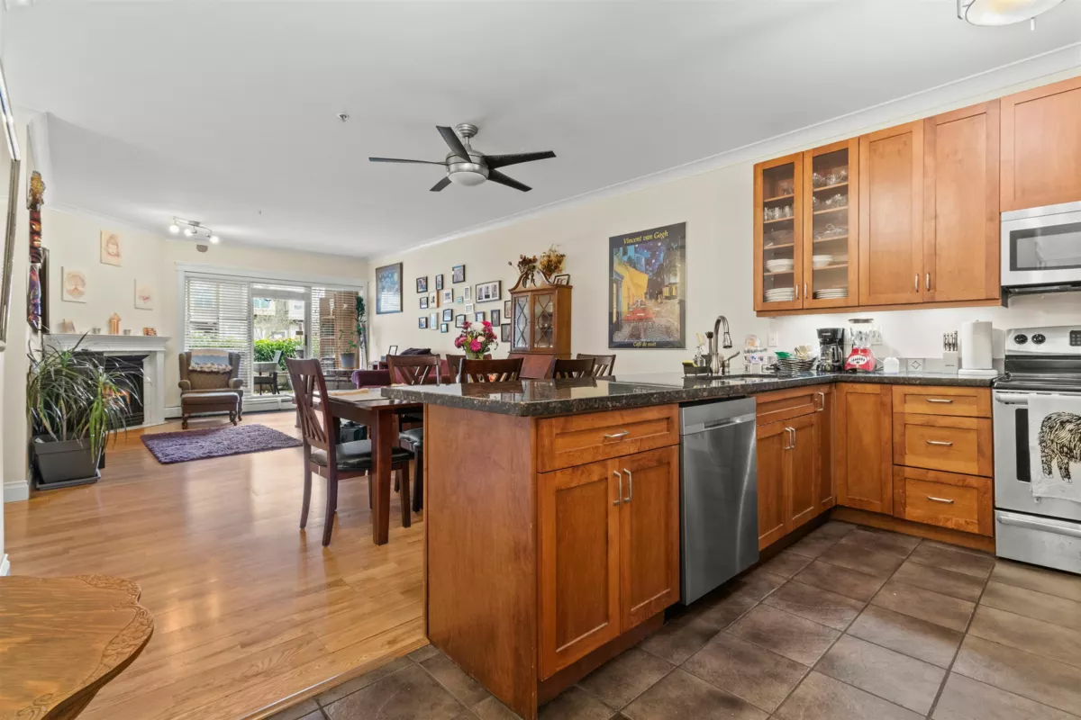 Welcome to this spacious 1,035 sqft garden-level home at Parkview Place! This 2-bed 2-bath unit offers an ideal layout w/ separated bedrooms, providing privacy & functionality. The open-concept living & dining area features a cozy gas fireplace & direct access to a private patio, perfect for morning coffee or summer evenings. The kitchen boasts ample counter space, making meal prep a breeze. The primary bedroom includes a walk-in closet & ensuite, while the second bedroom is well-sized for guests or a home office. In-suite laundry, 1 parking, & 1 storage locker add to the convenience. Situated in a prime Port Coquitlam location—just steps to parks, trails, shopping, transit, and schools. A fantastic opportunity for first-time buyers, downsizers, or investors! Offers as they come. No dogs!