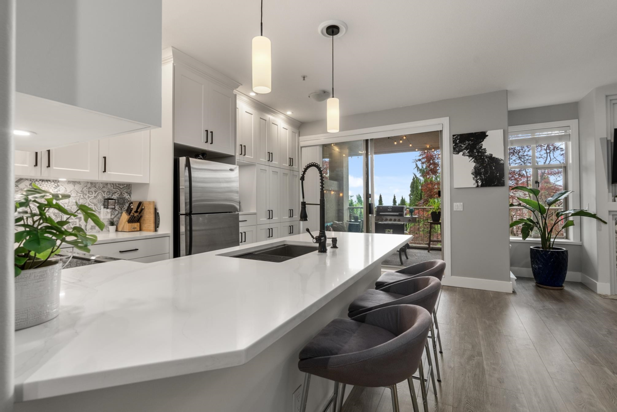 LUXURY LIVING! Come home to elegance in this fully renovated ground floor corner unit! Inside you’ll find the sleek kitchen is a dream boasting shaker style cabinets with under-cabinet lighting, stylish tile backsplash complemented by quartz counters & crown molding. Large windows stream natural light through Southeast exposure creating a bright atmosphere that shows off the designer colors & glamorous finishing & millwork throughout the home. BONUS: 2 parking stalls + storage locker! Entertain or unwind in the MASSIVE, covered patio w/ access to the landscaped grounds. Prestigious location next to Westwood Plateau Golf Course! Safe & quiet neighbourhood walking distance to Elementary school, short drive to WW Plateau Village for all shopping needs! Open House, March 16/17, 2:00 - 4:00pm!